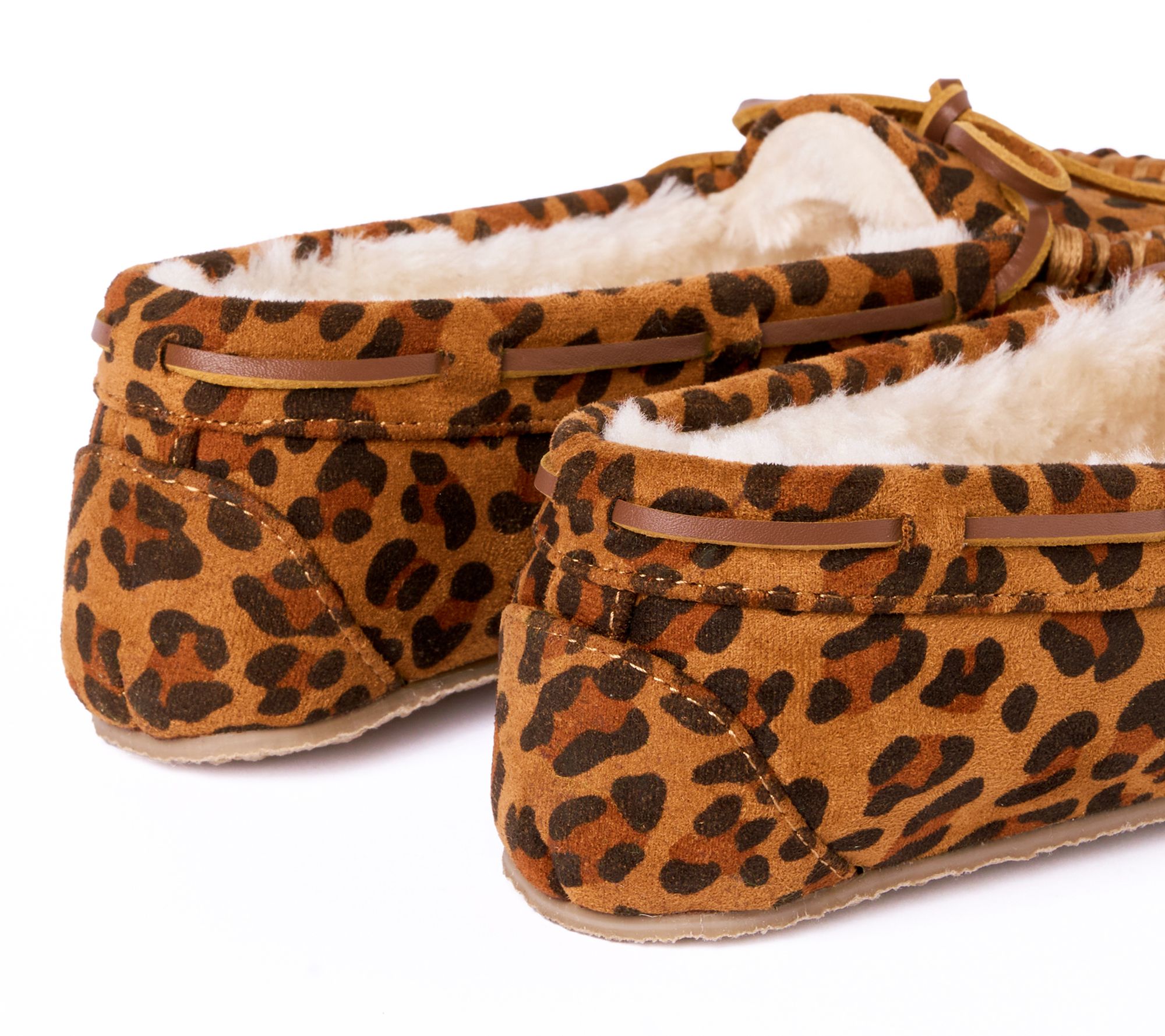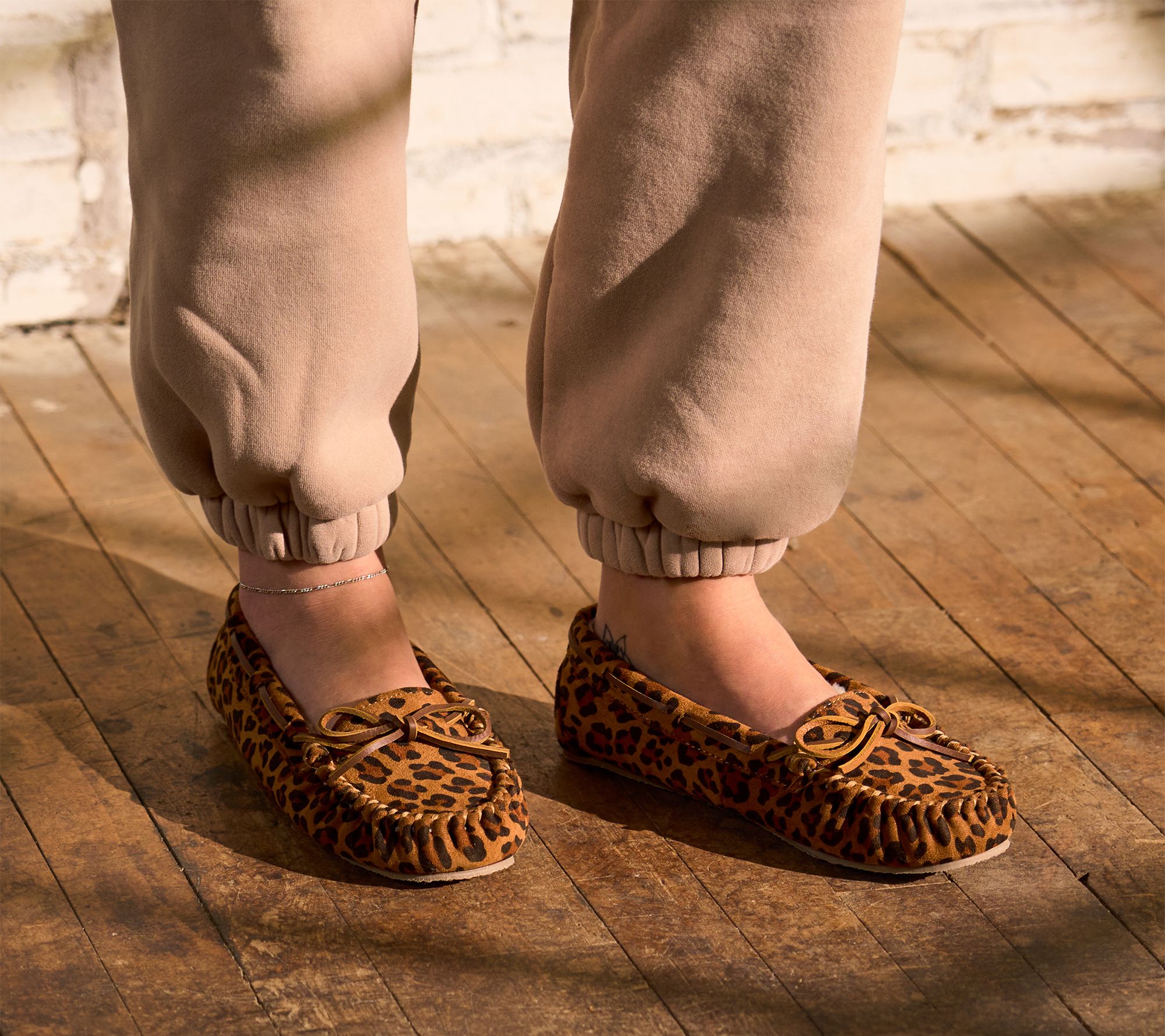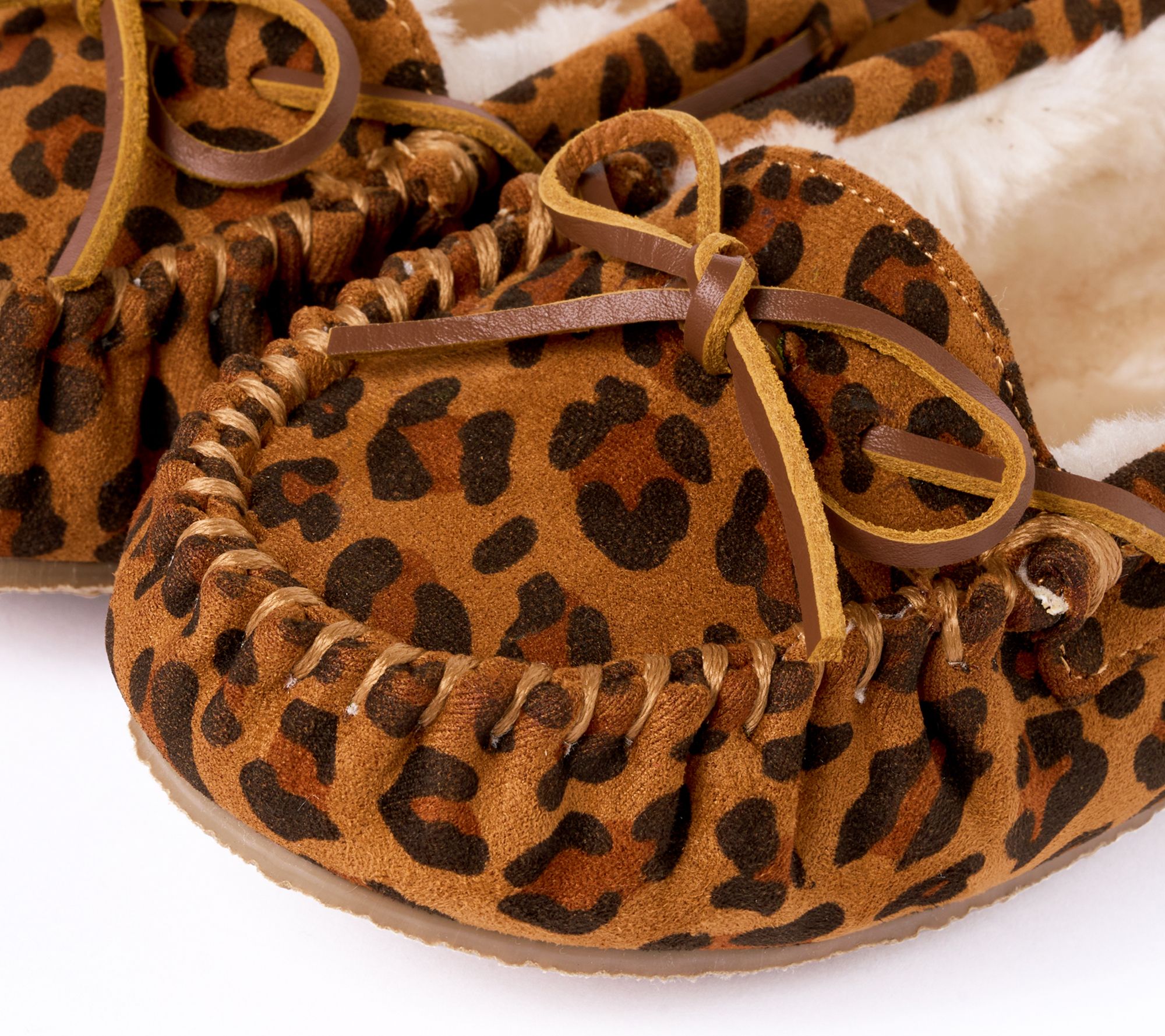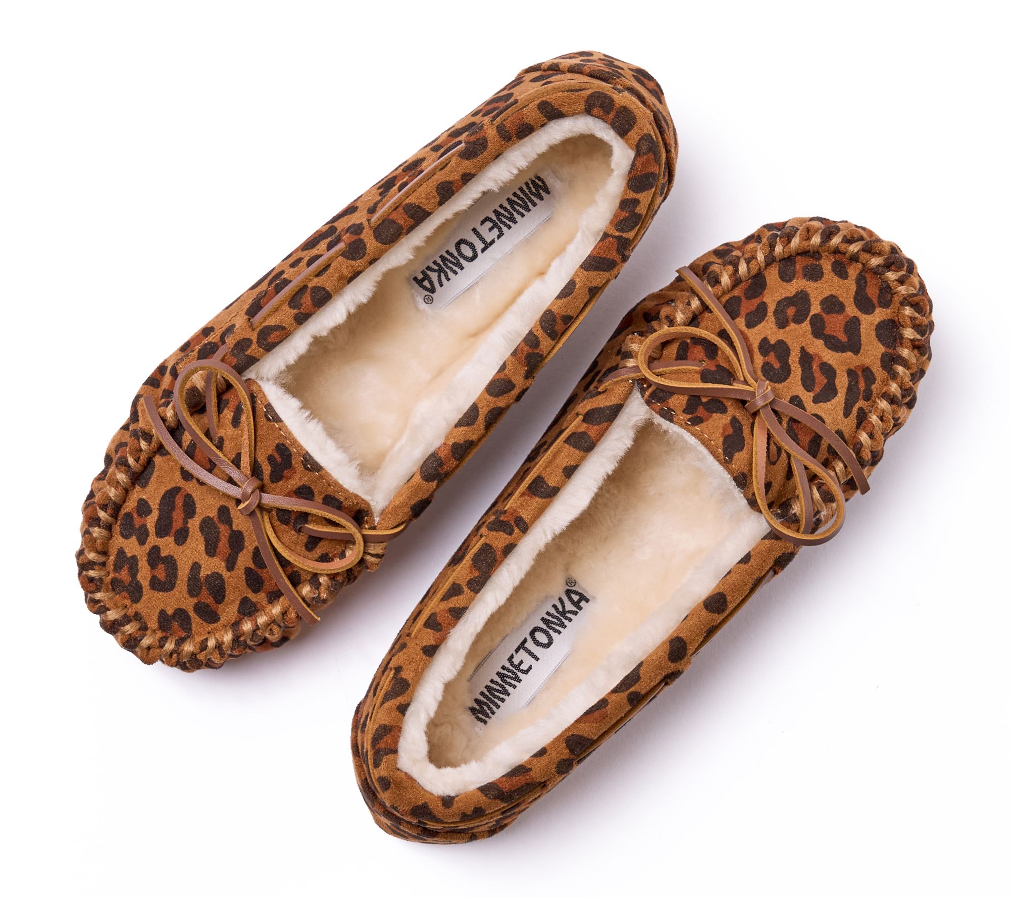 A cozy night in feels even more inviting when you slip into these playful leopard print slippers. The soft, moccasin-style upper adds comfort and flair to your lounge routine, while the plush lining keeps your feet warm whether you're reading by the fire or unwinding after a long day. From Minnetonka.