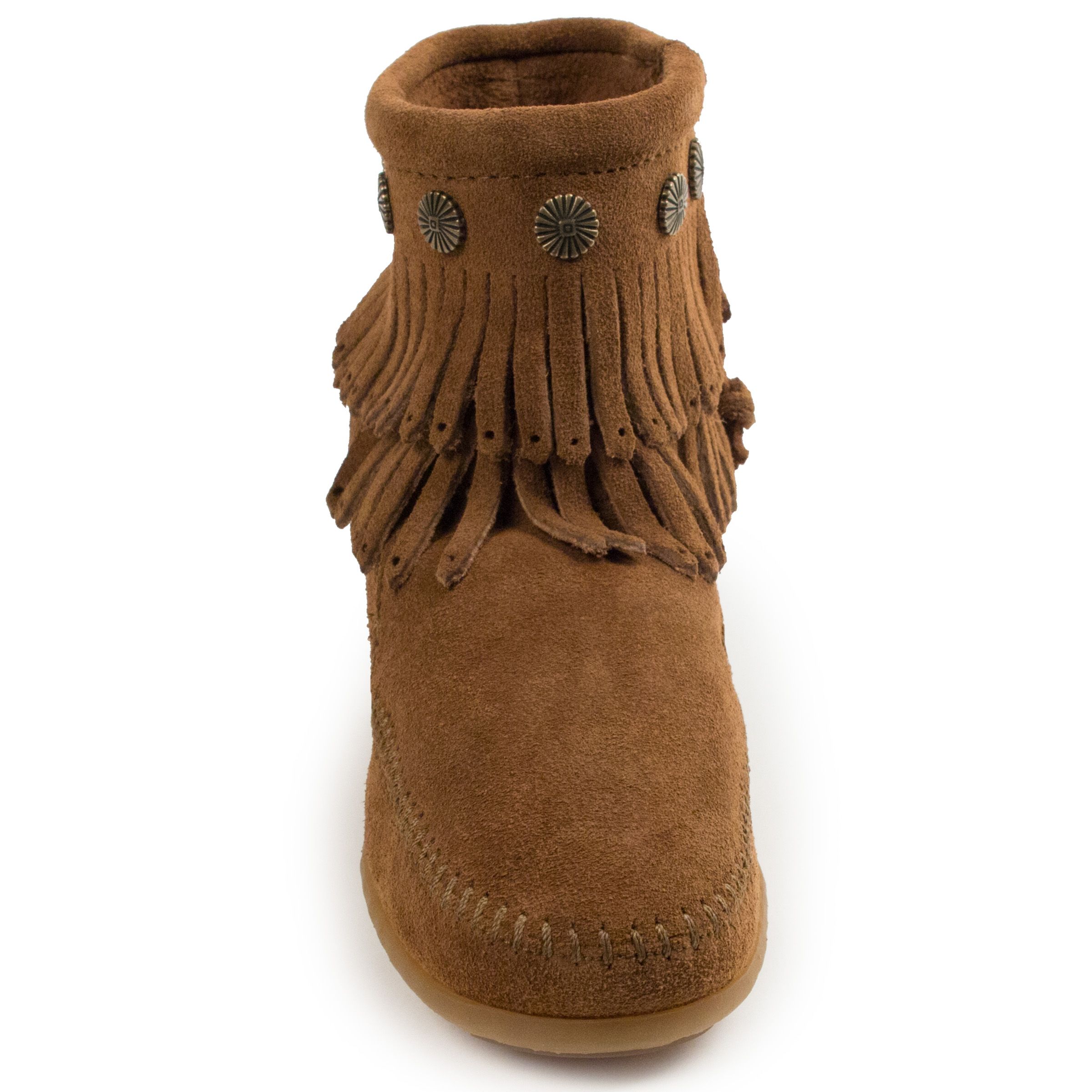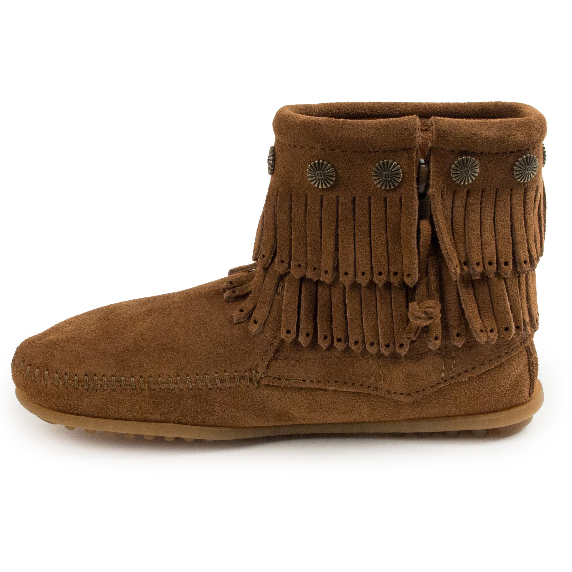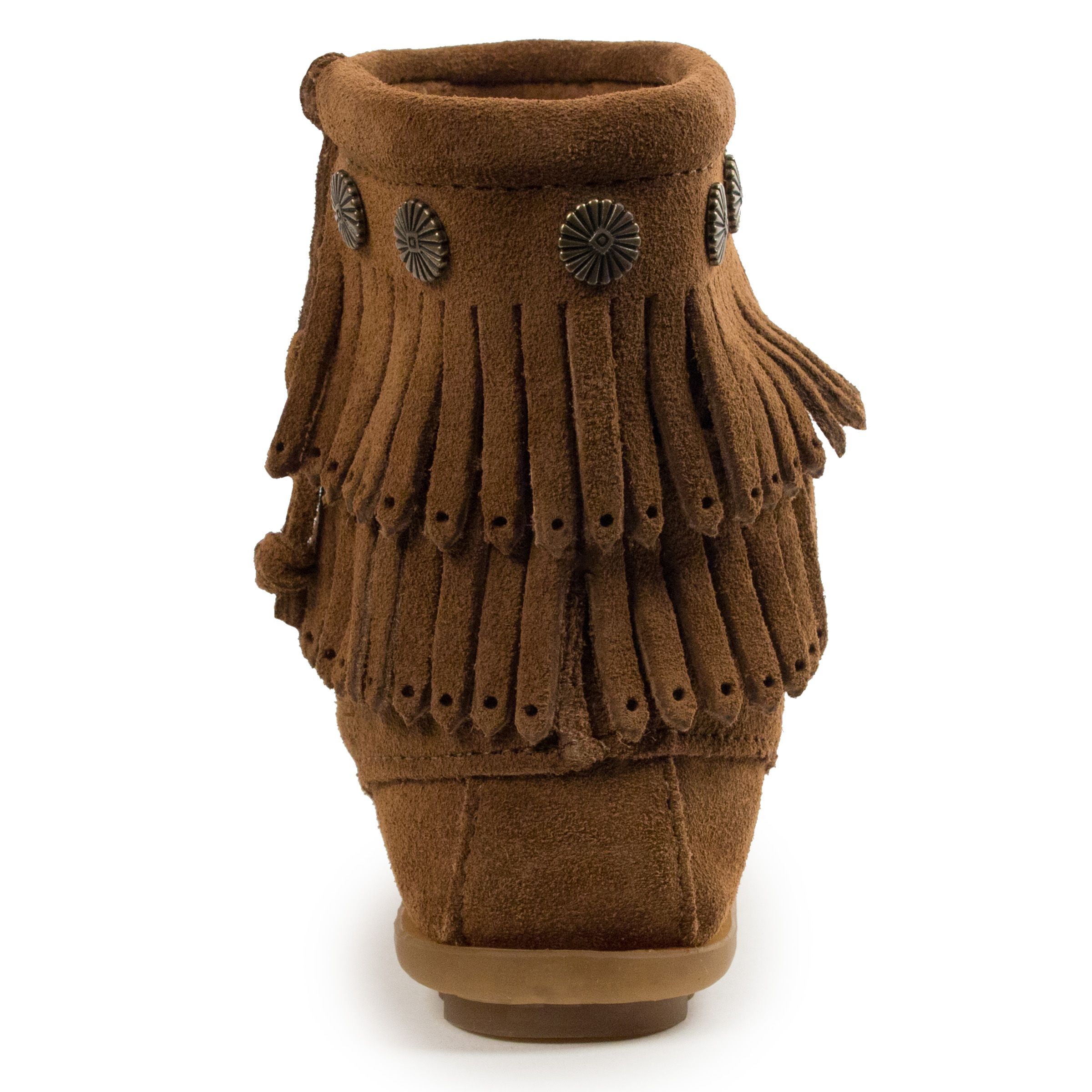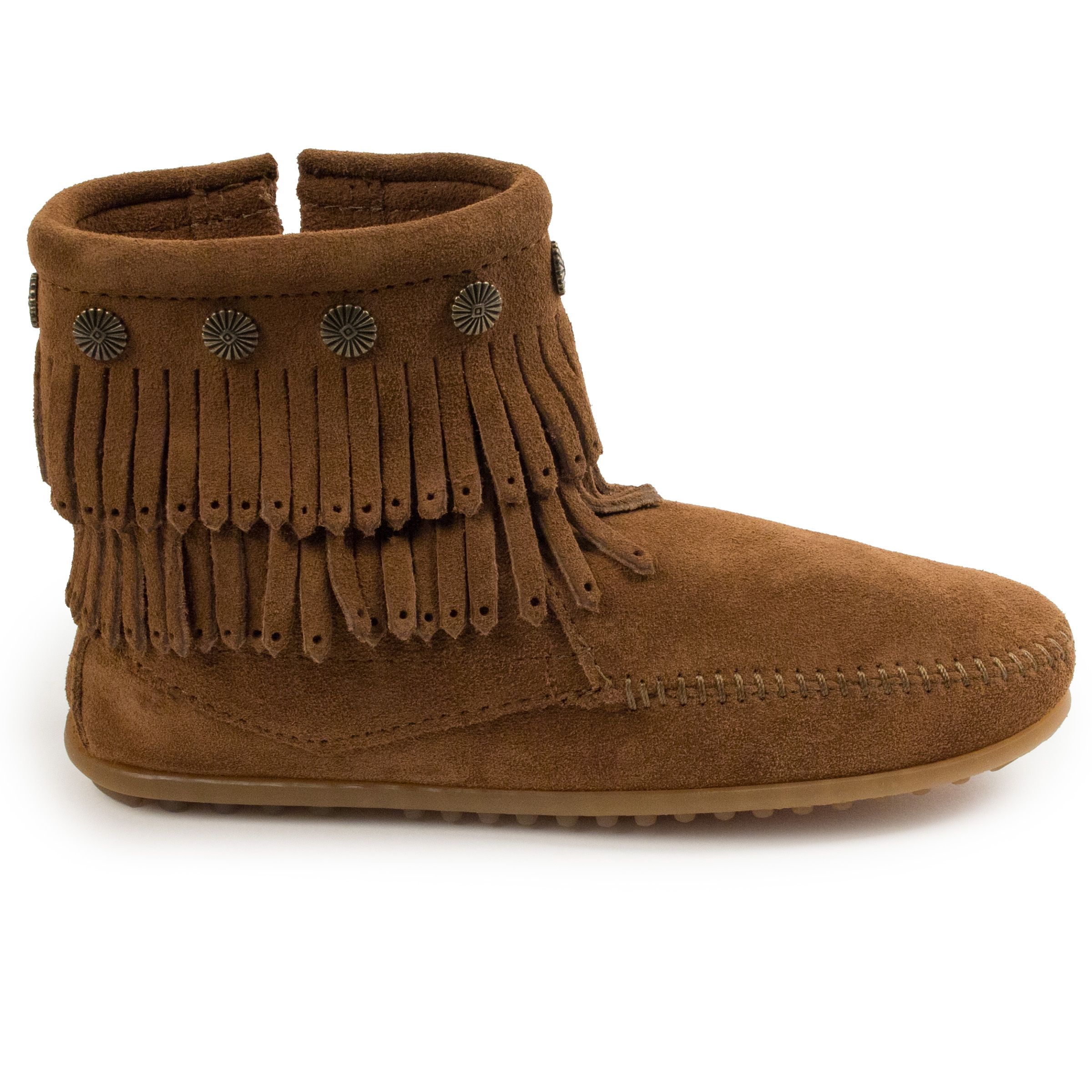 You just can't have a bad day when you're wearing a double dose of fringe. Rendered in supple suede with metal concho trim, this boot elevates your mood and your style quotient in one fell swoop. From Minnetonka.