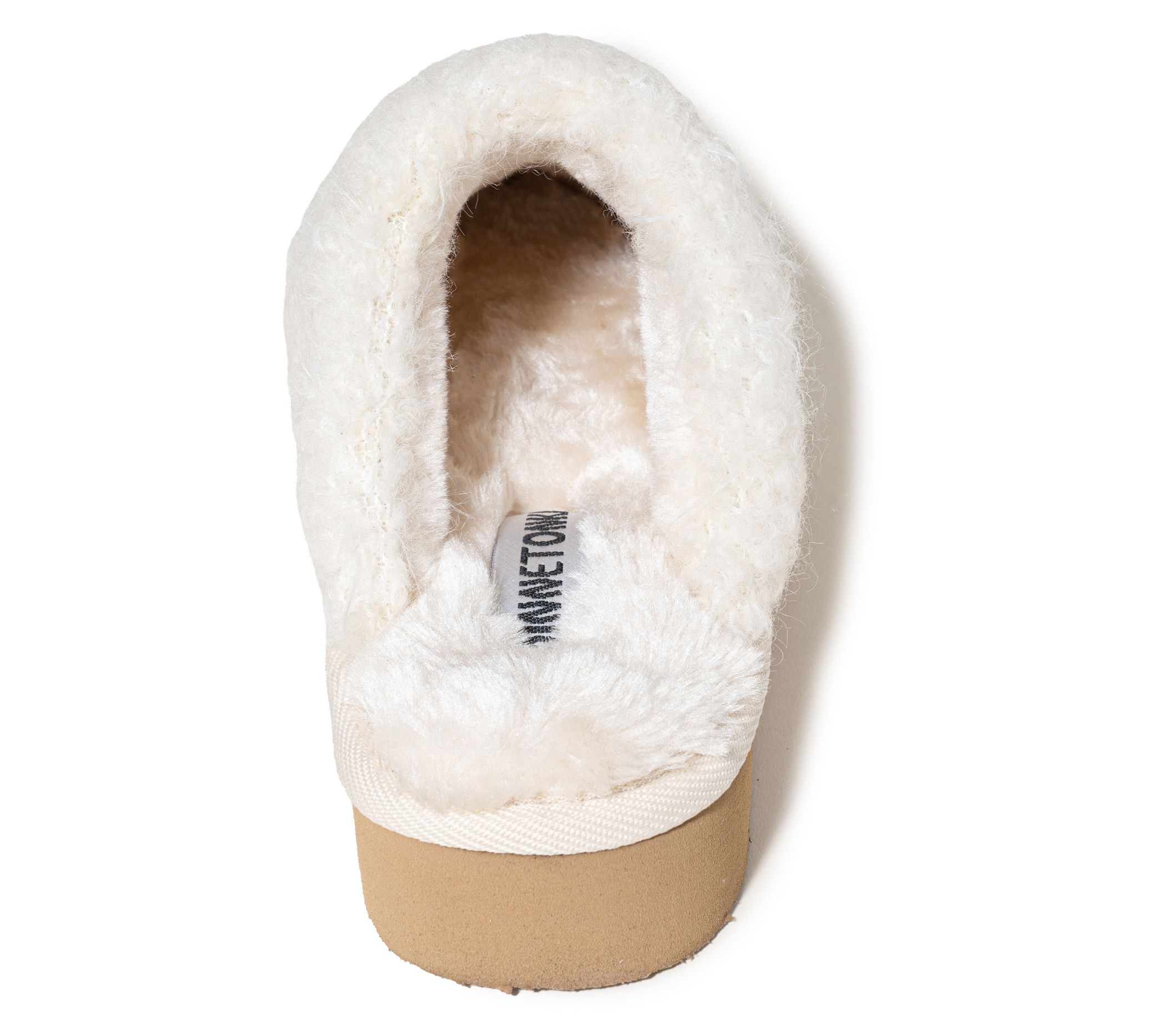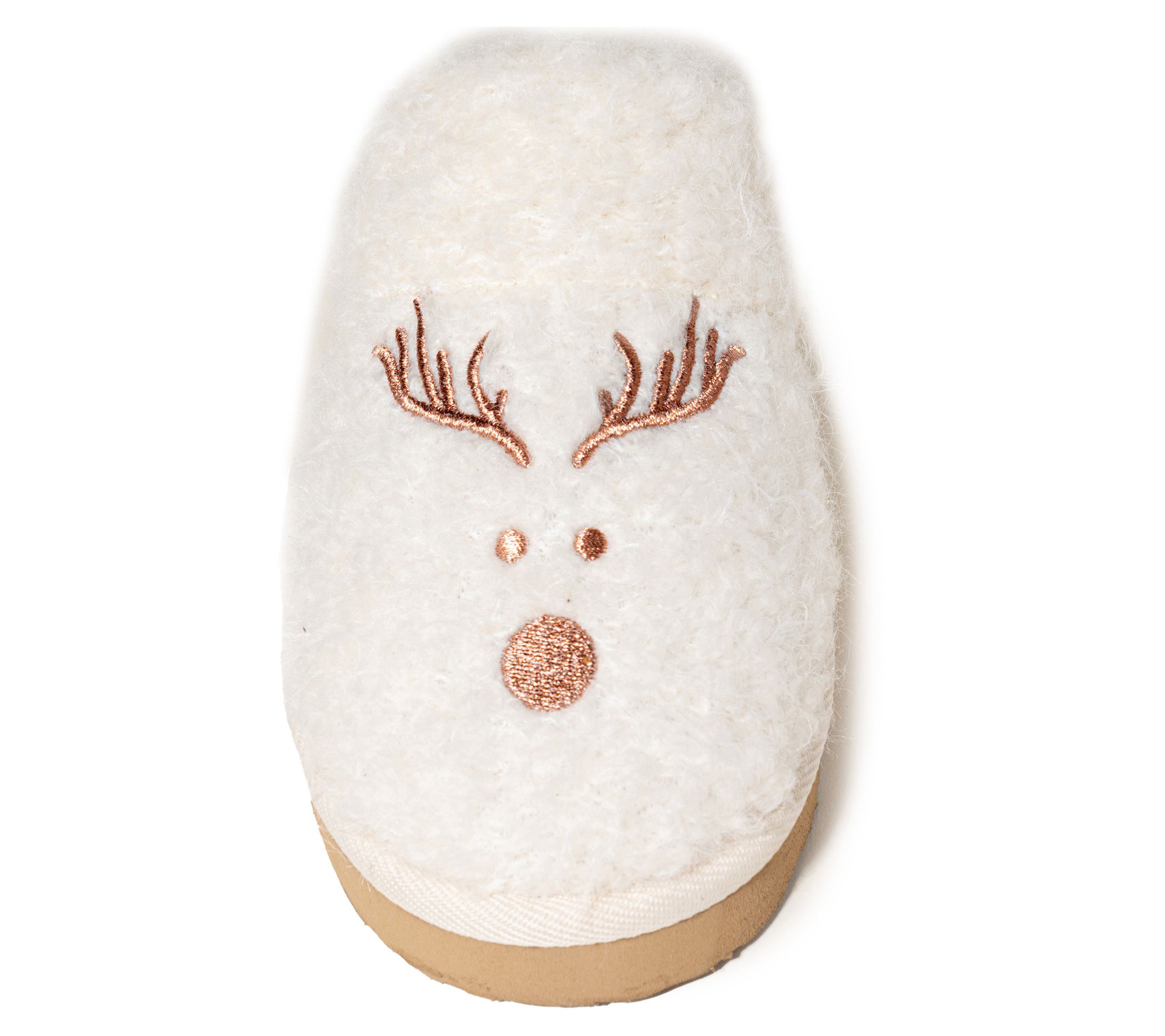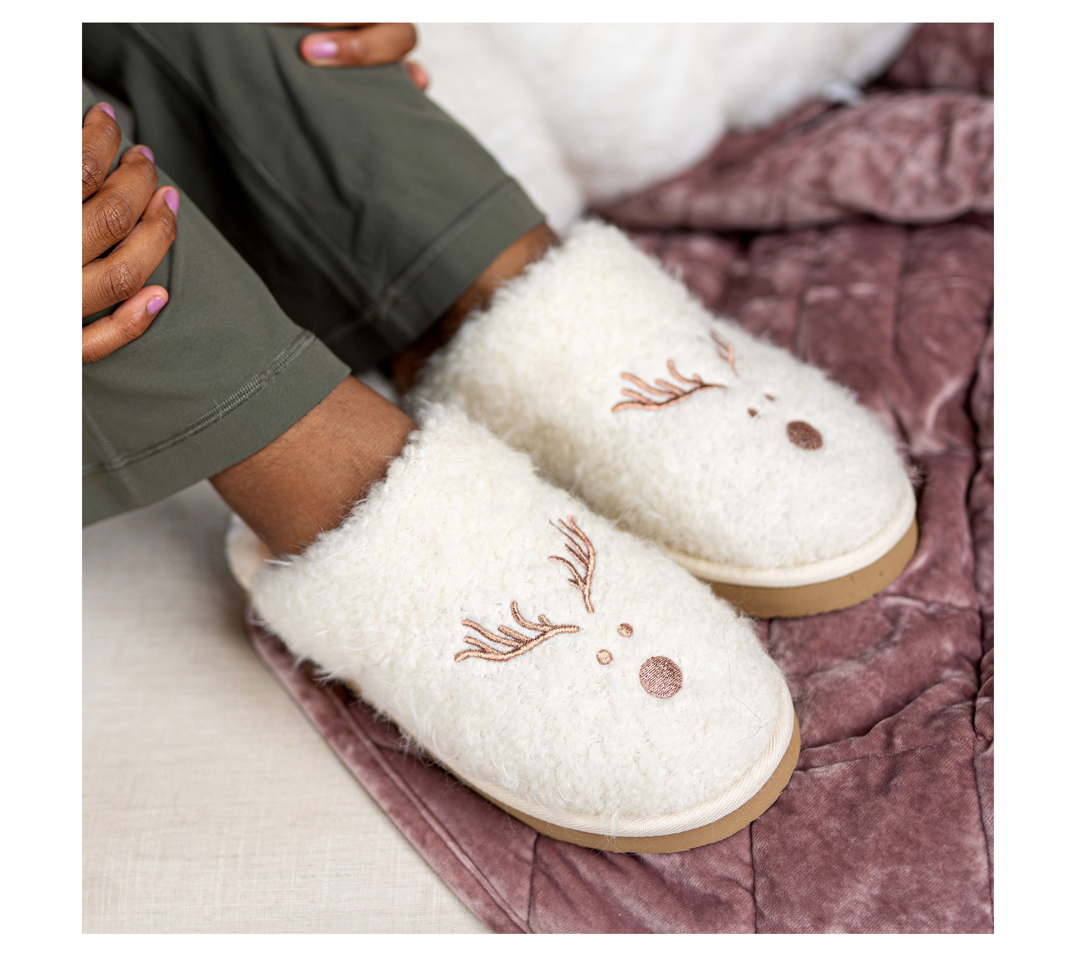 Lounge around in seasonal style with Minnetonka women's reindeer scuff slippers. Perfect for the chilly holiday season, these backless slippers feature a cozy pile lining and a whimsical reindeer design with metallic thread detail. The thick, flexible soles make them ideal for both indoor and outdoor wear. From Minnetonka.