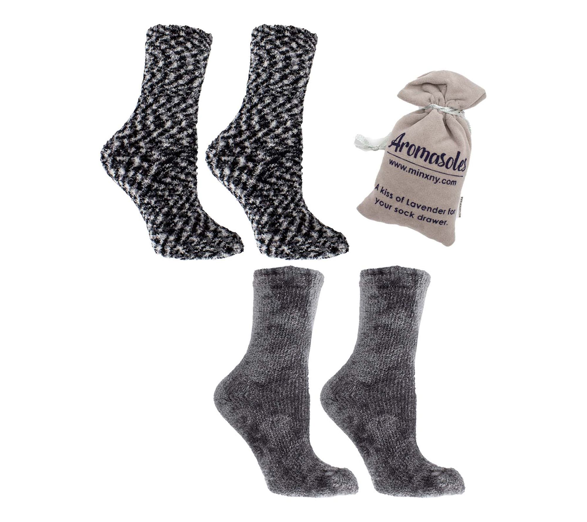 Slip into ultimate comfort with these MinxNY velvet slipper socks, infused with the dreamy essence of Shea Butter. These two pairs offer the perfect blend of style and coziness, featuring a solid and a pattern print for versatile wear. Experience the soft, luxurious feel on your feet with every step and enjoy the added stability of non-skid soles. Treat yourself or gift someone special with this little slice of heaven. From MinxNY.