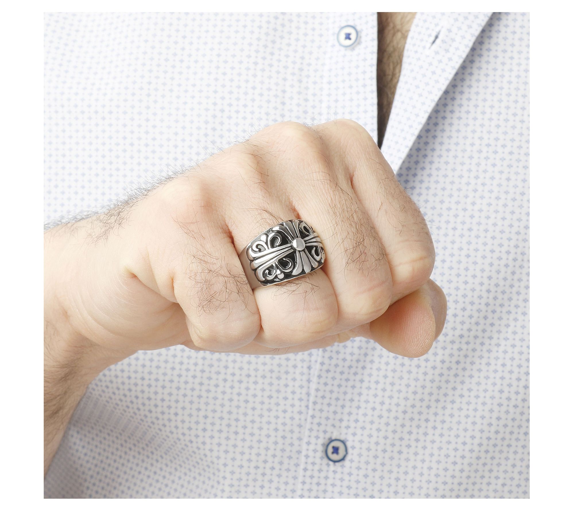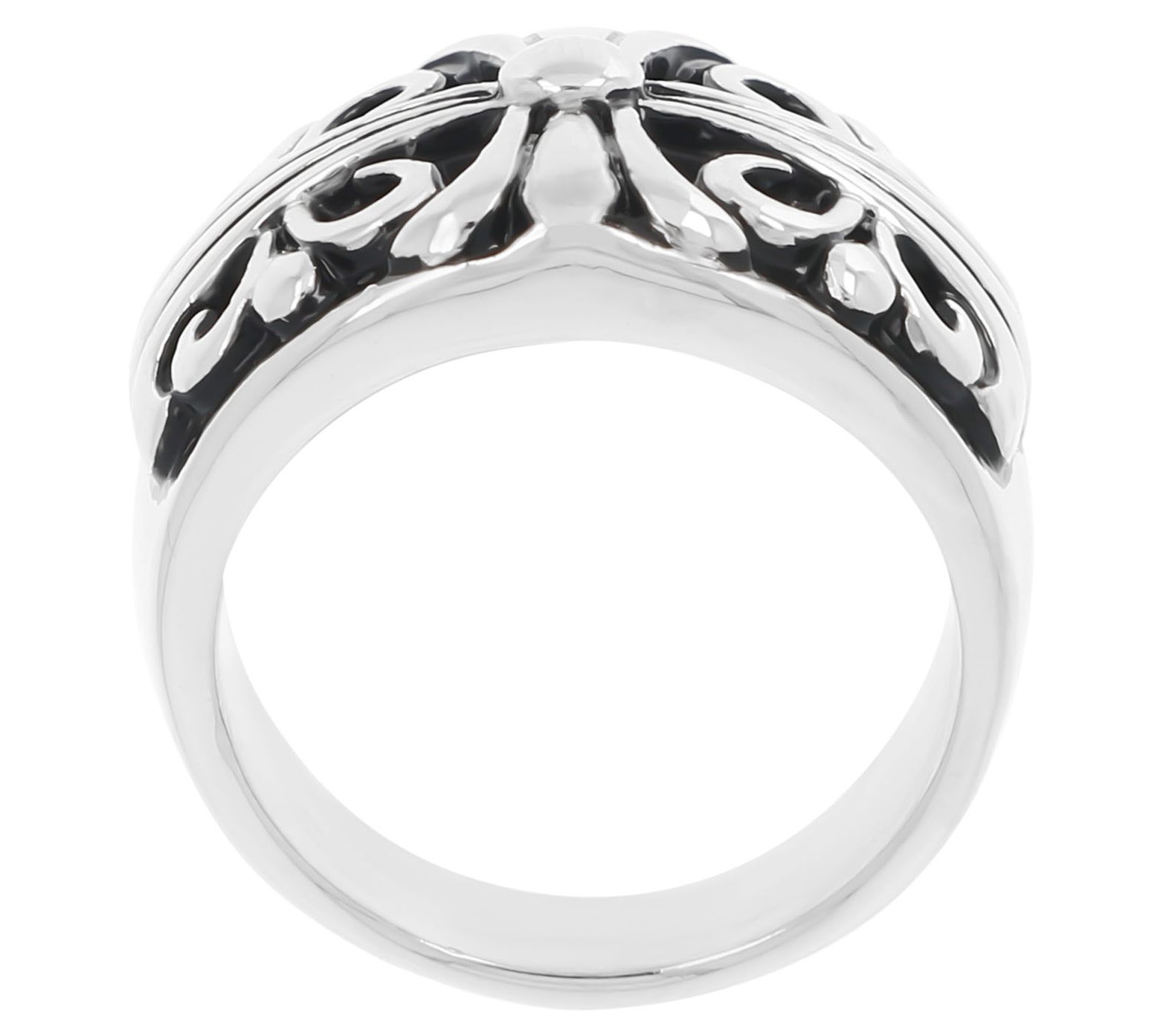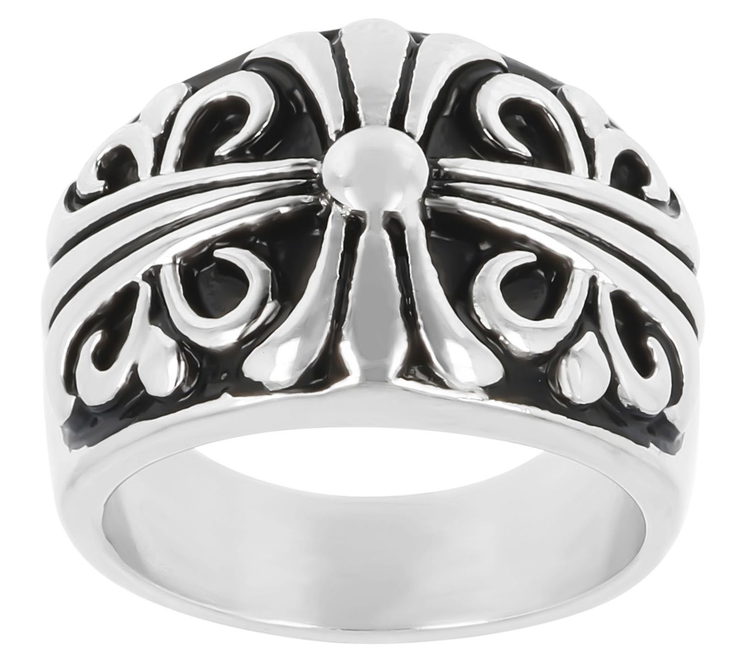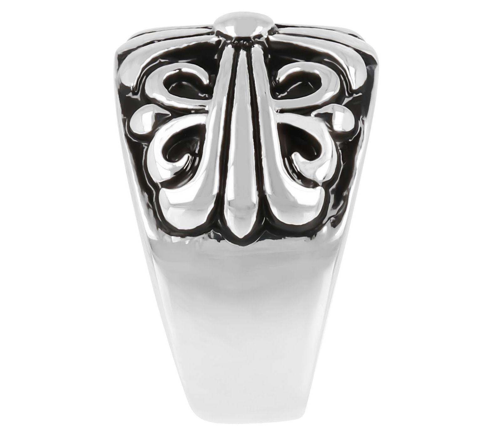 Handsome finishing details like this polished, graduated band ring can really elevate your look. A raised fleur-de-lis pattern gives this ring an air of classic heraldic style. From Mistero.