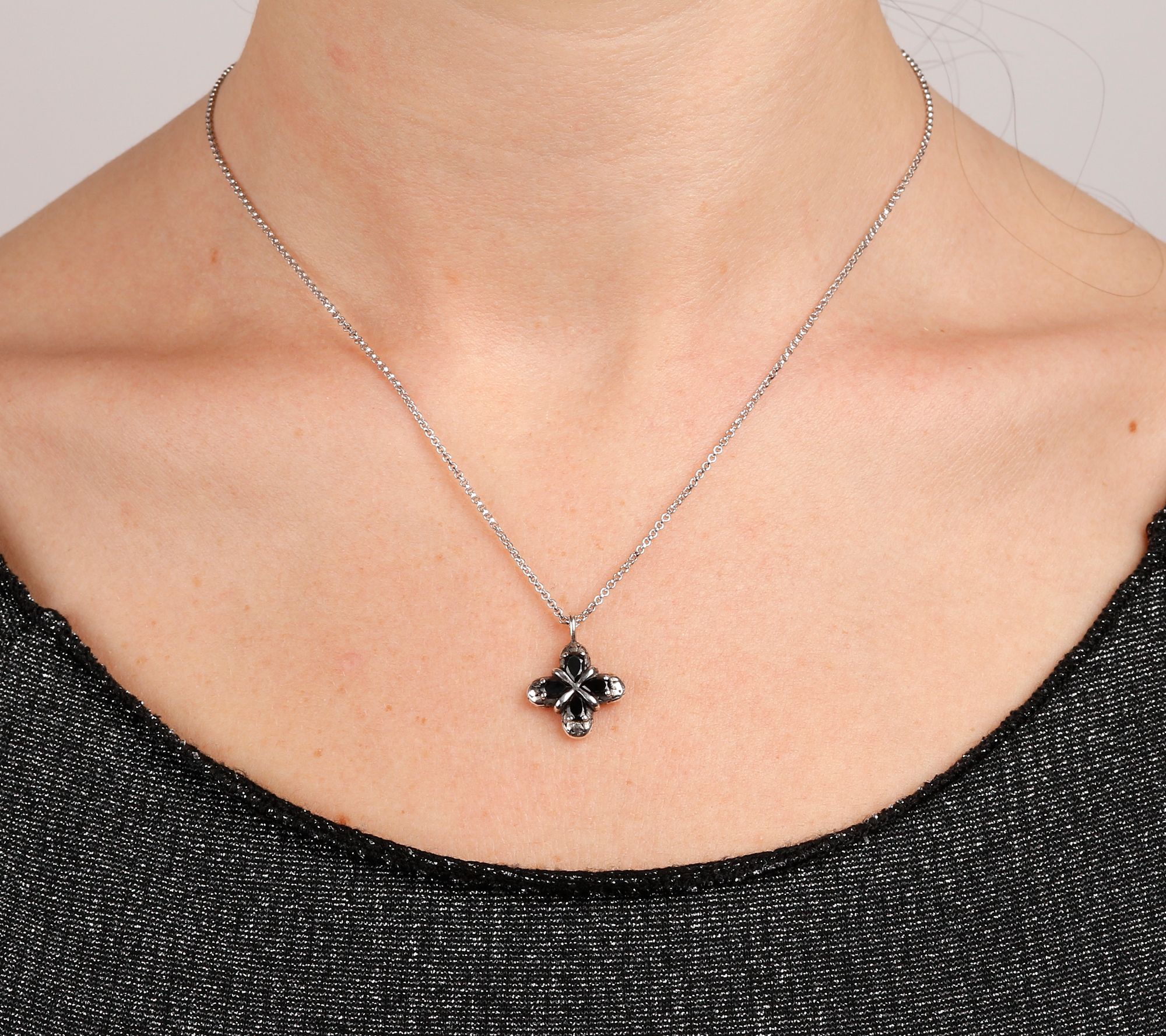- X-design center with prong-set, pear-shaped, faceted black spinel gemstones; textured border design; polished, oxidized finish