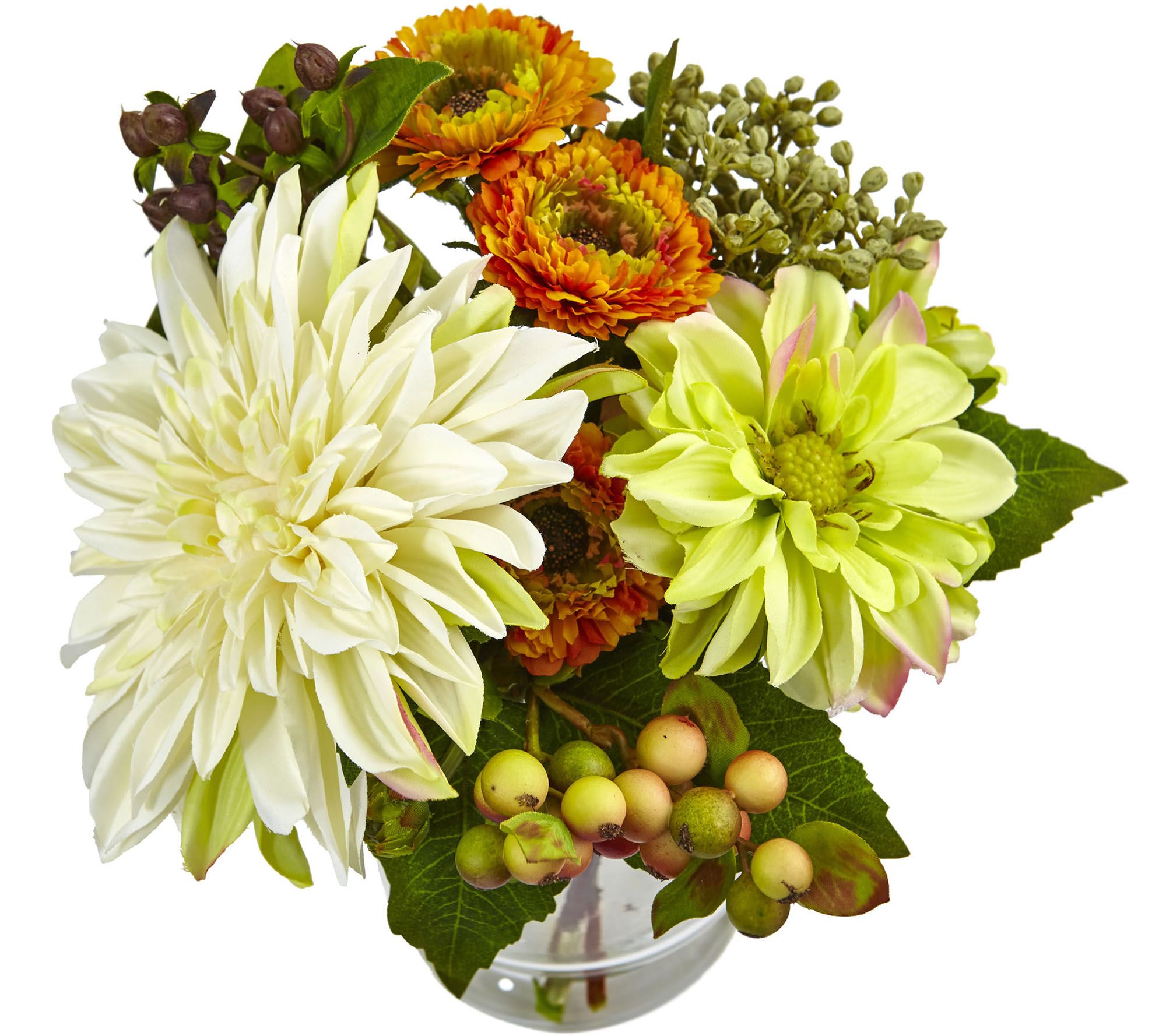 • Lifelike dahlias and mums in a glass vase with faux water