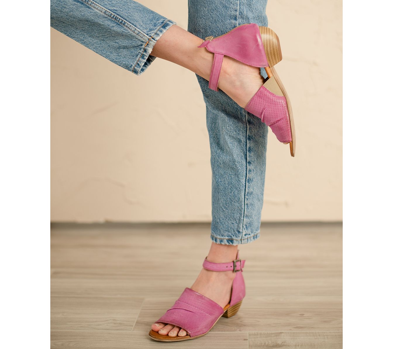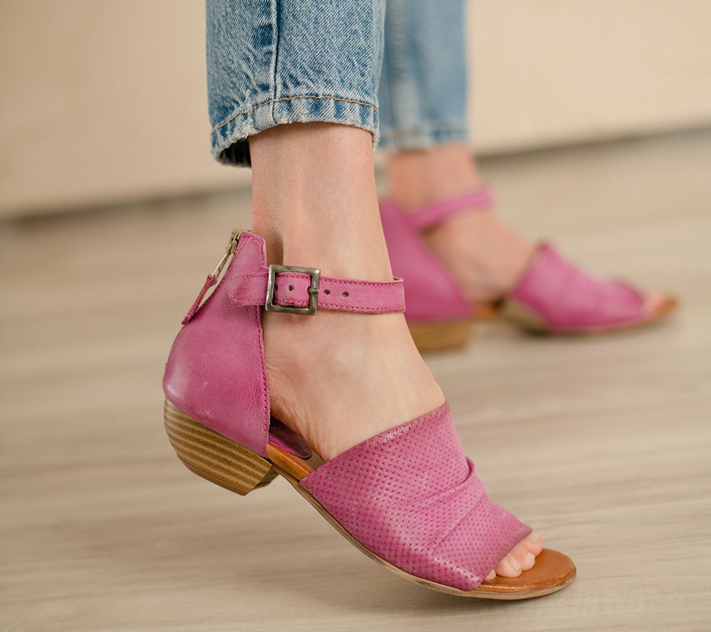 • Two-toned textured upper (smooth and perforated), adjustable buckled ankle strap, back zipper