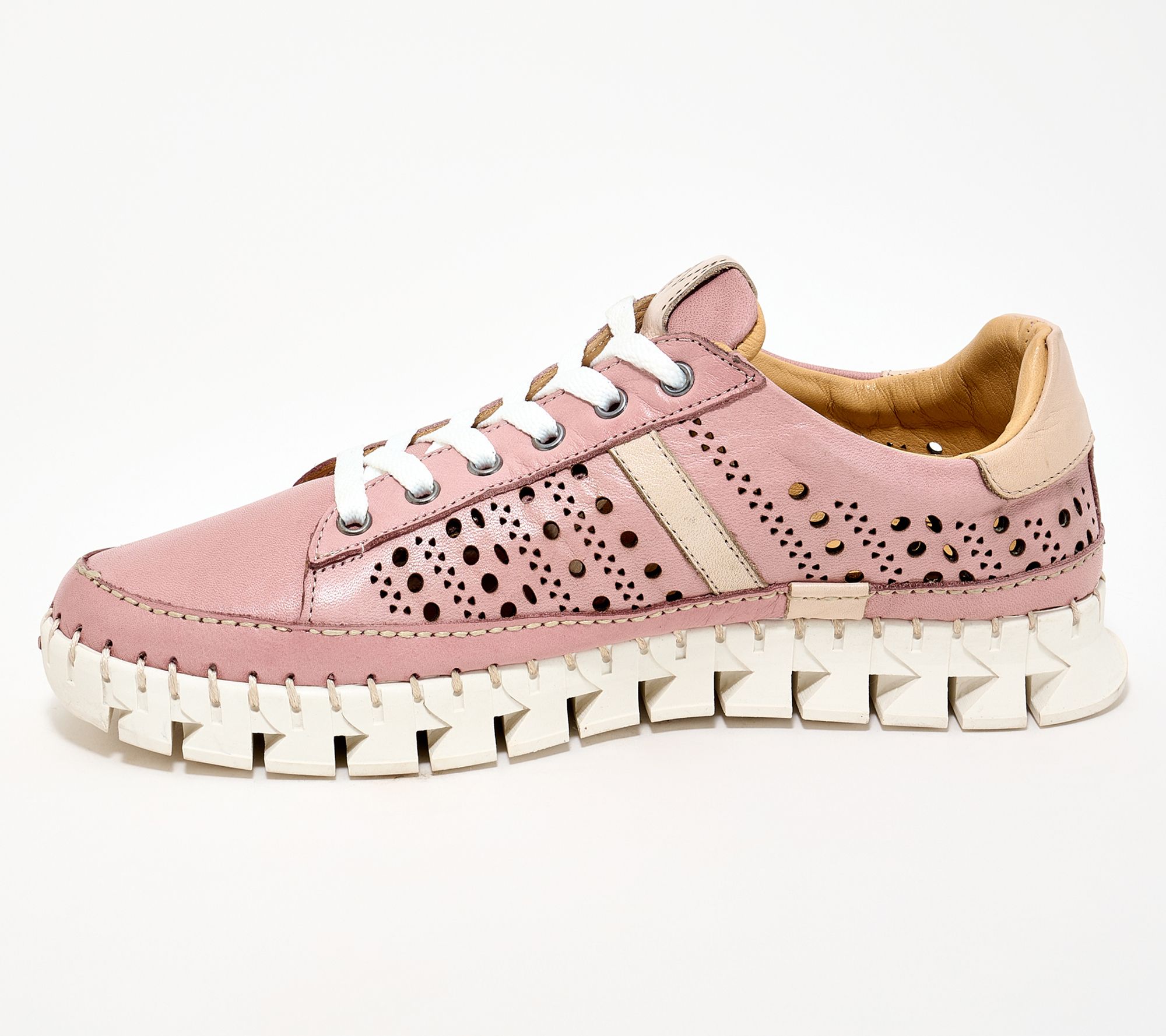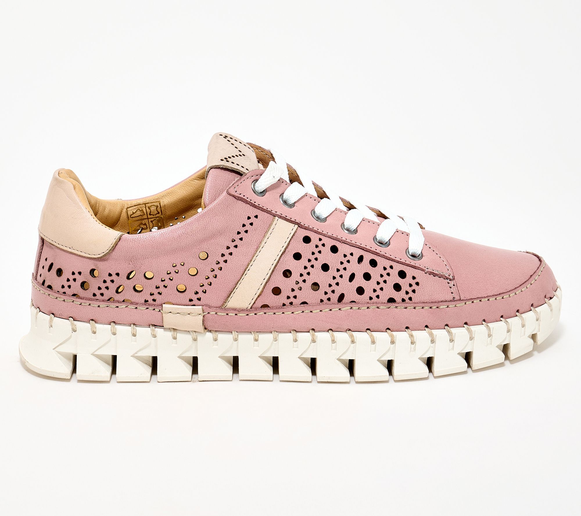 Slip on these leather perforated sneakers for a laid-back stroll around the city or spontaneous meetups with friends -- supple European leather feels soft from the first wear, while the lace-up design lets you adjust the fit just how you like. The dual-density insole delivers cushioned support so you can stay comfortable, no matter how busy your day gets. From Miz Mooz.