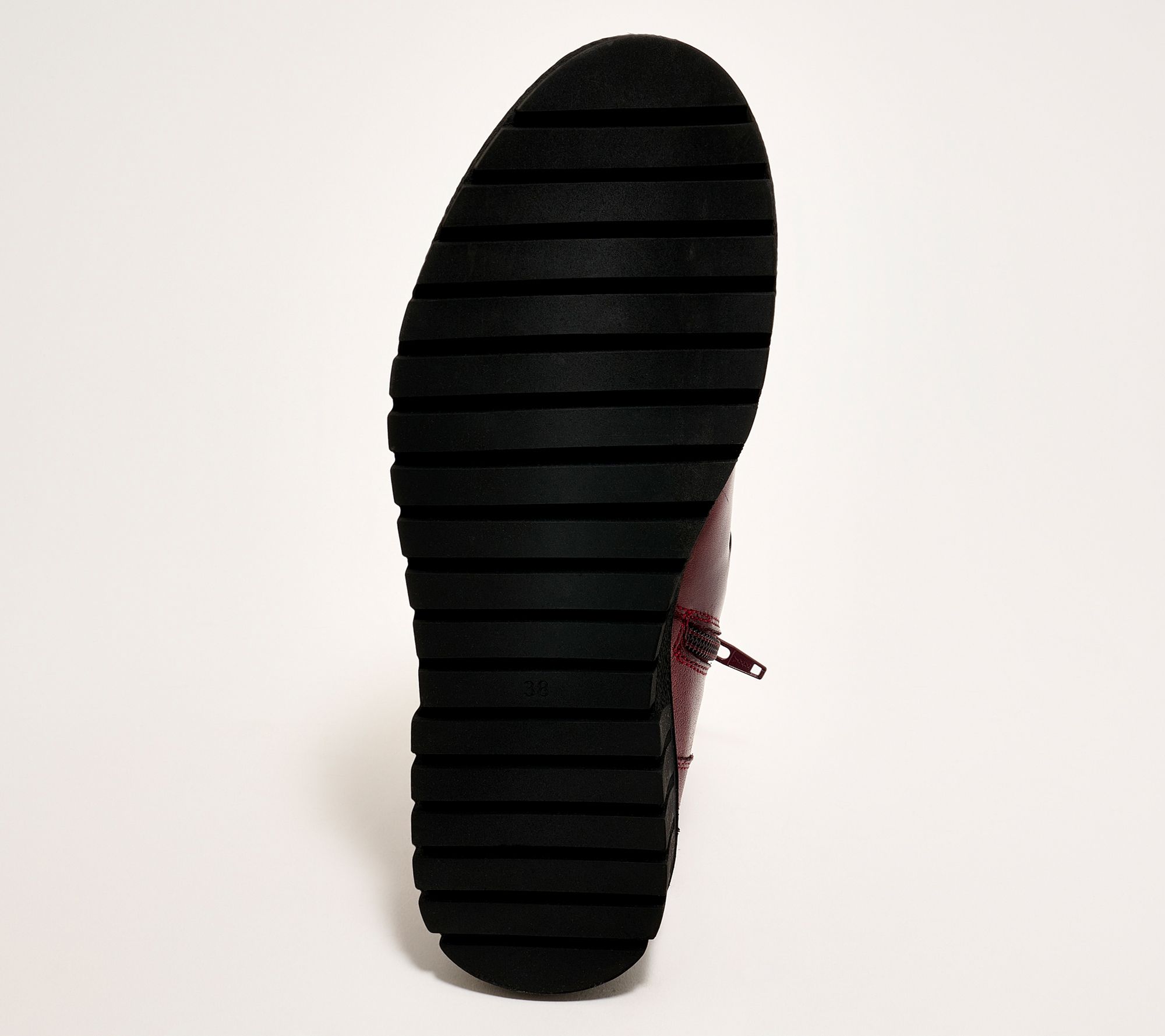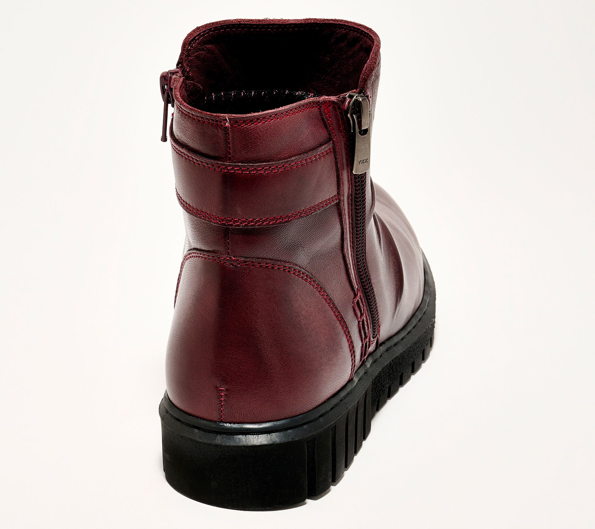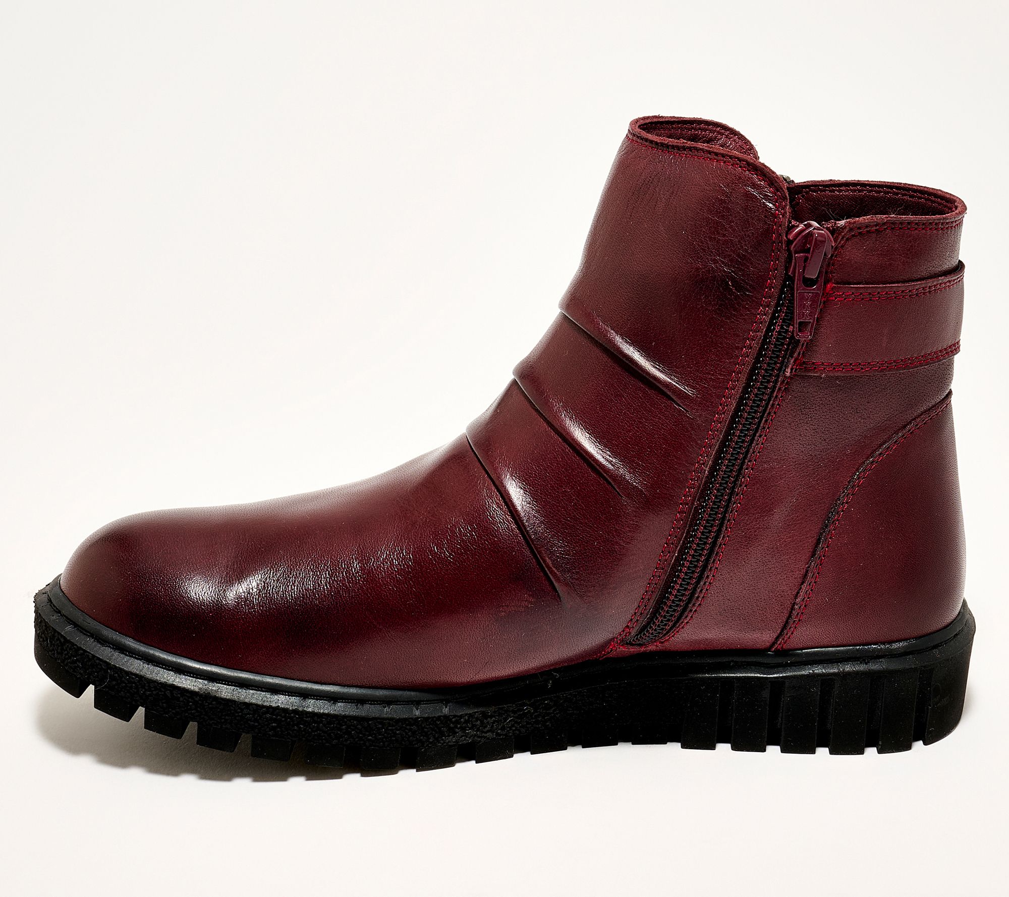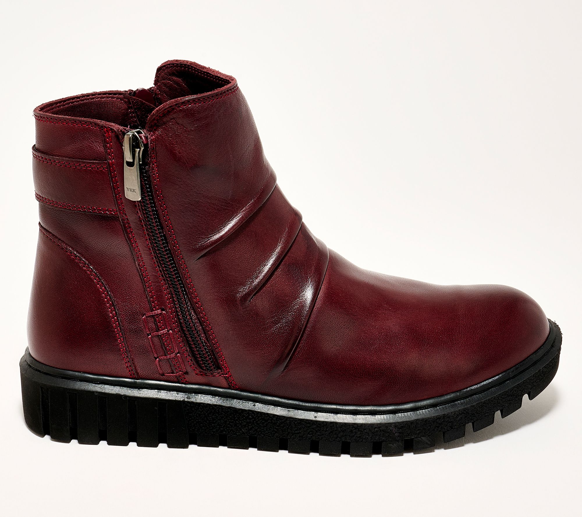 Inside and outside zippers, ruched leather upper, ankle boot design