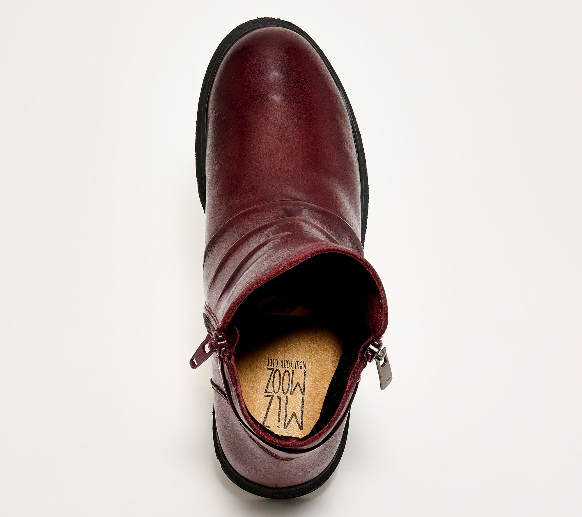 Whether you're running errands or meeting friends for brunch, these leather ruched ankle boots add a boost of style and comfort to your day. The dual zippers make slipping them on and off a breeze, while the cushioned footbed supports you with every step. From Miz Mooz.