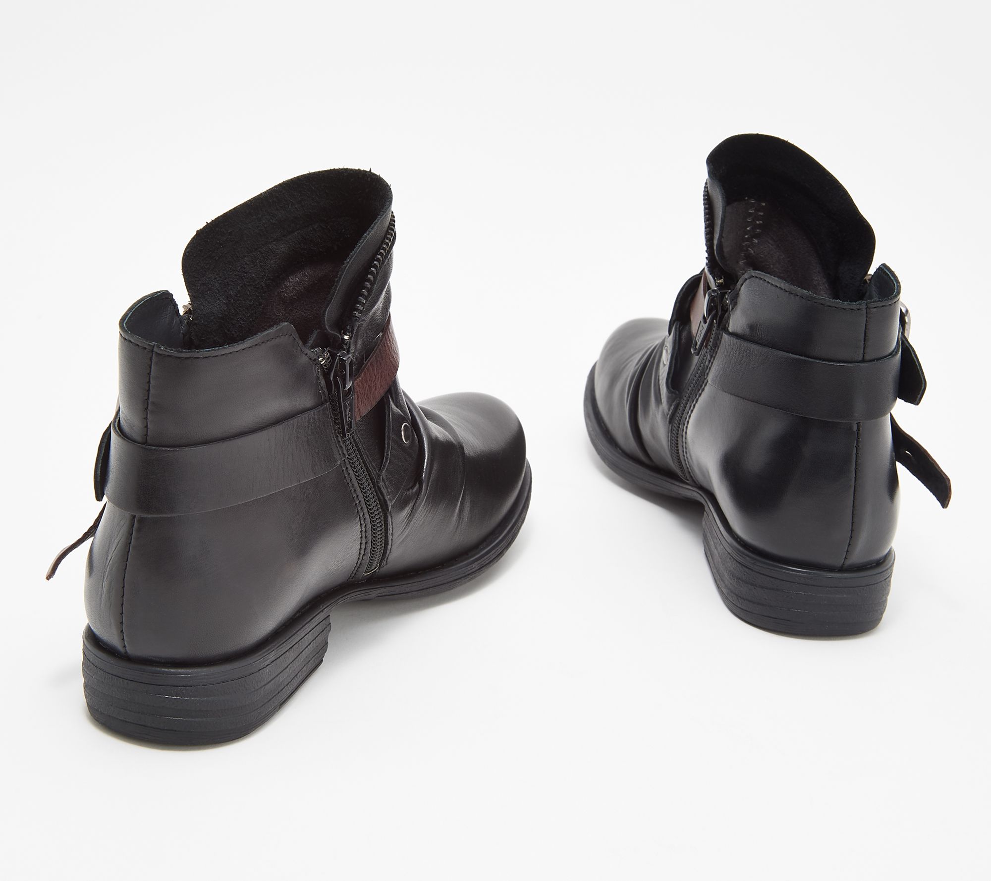 • European leather upper, rounded toe, decorative zipper and buckled strap detail, inside zip entry
