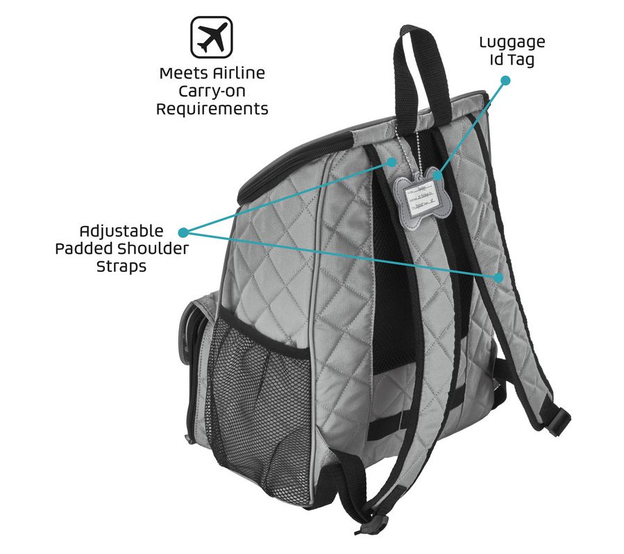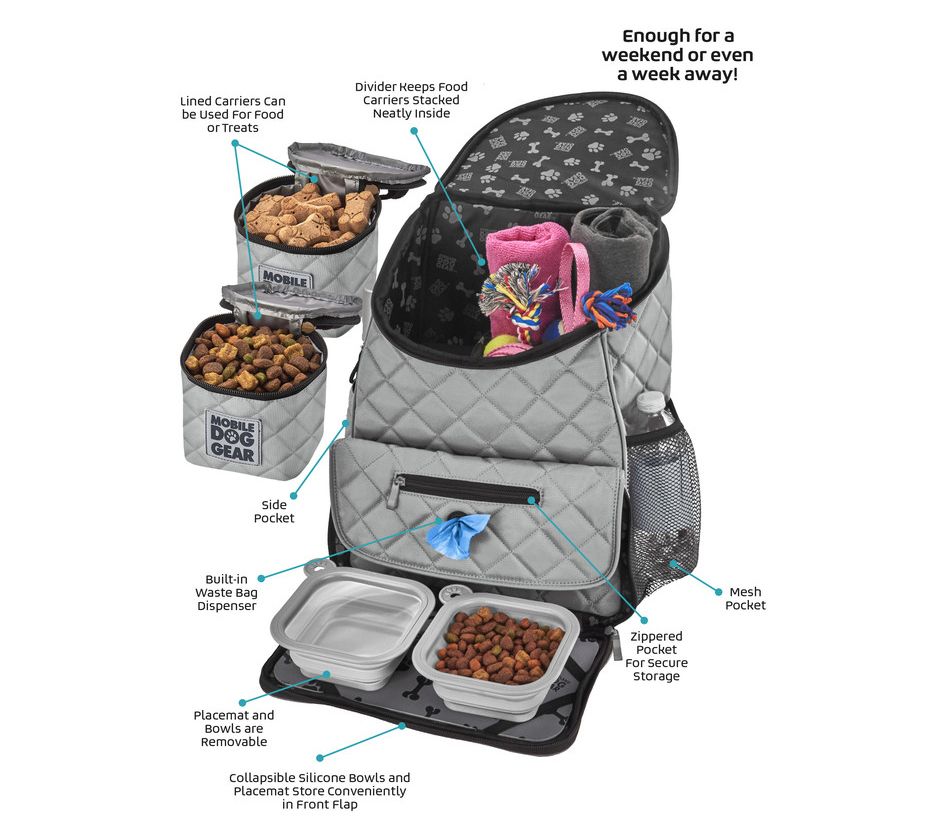 • Includes backpack, two 2-cup collapsible silicone bowls, two 5-cup food/treat carriers, ninstick feeding mat, and dog bone ID tag