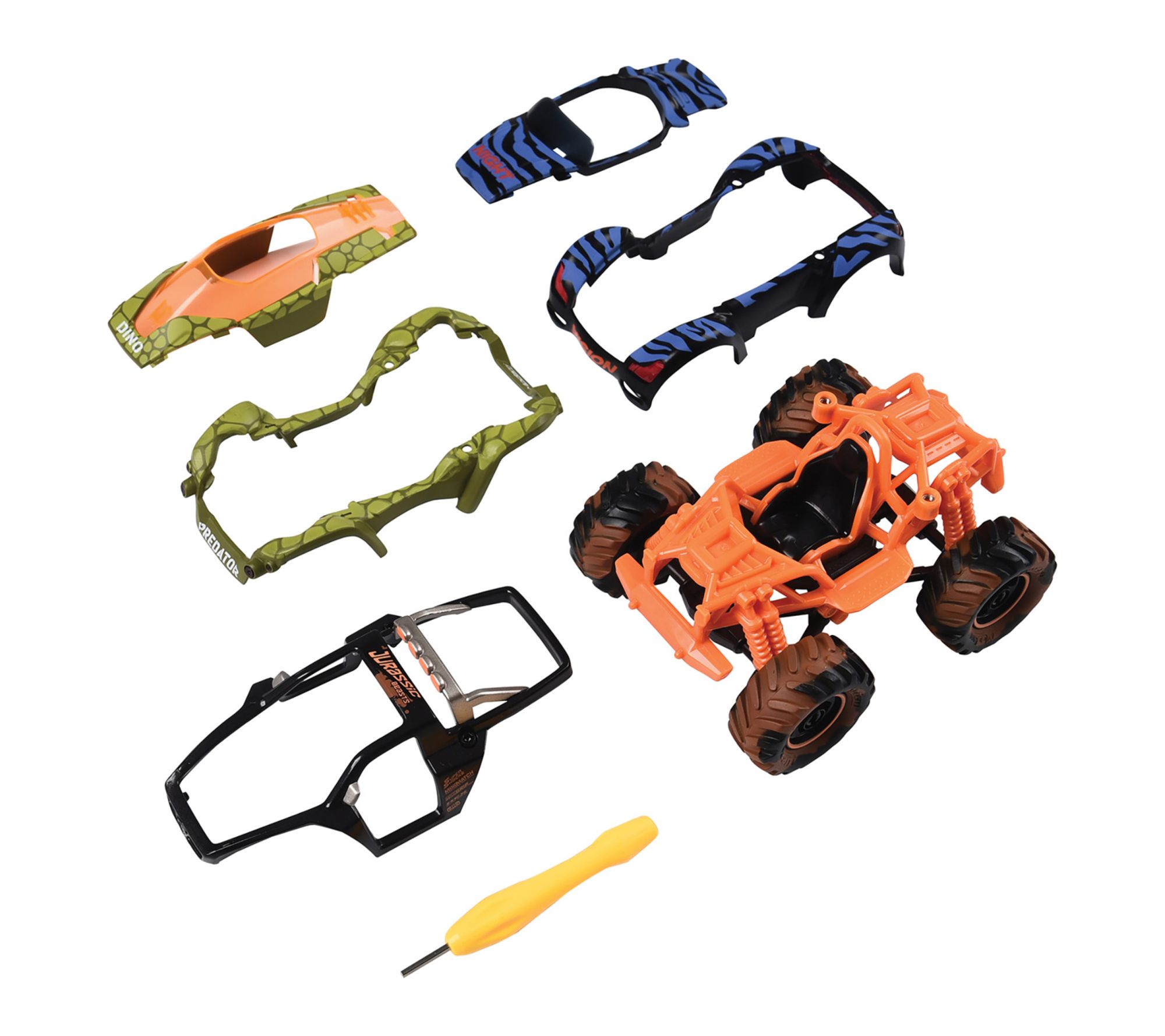 • Includes hex tool, metal frame, two hoods, two fenders, seat, chassis, front and rear suspension, and four wheels