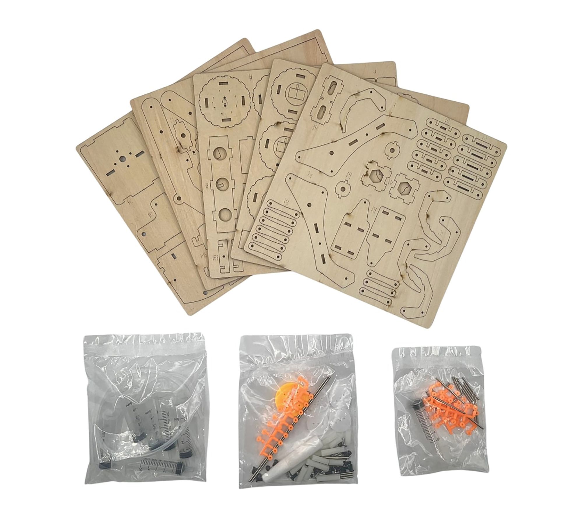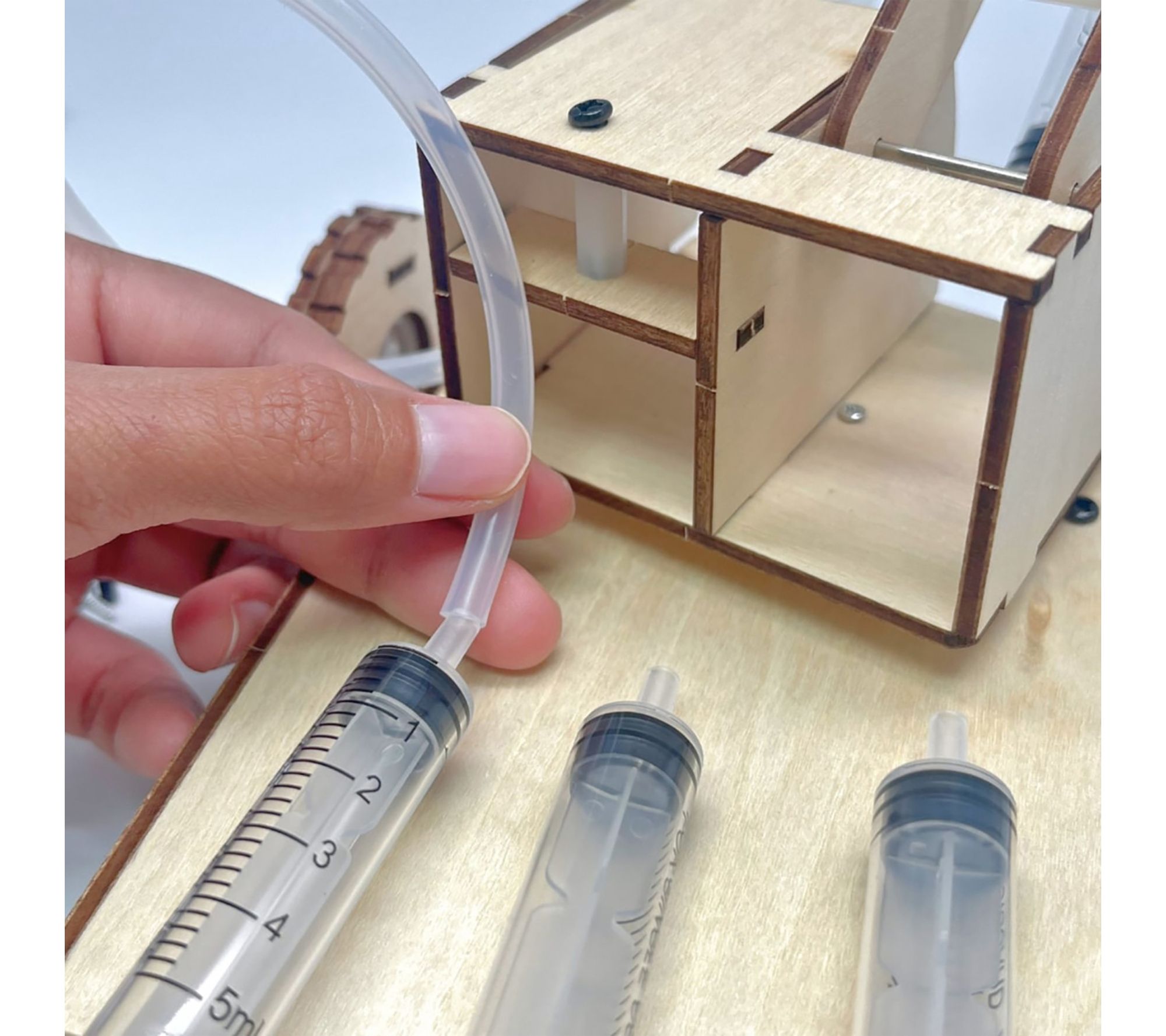 • Includes wood assembly pieces, five syringes, plastic tubing, and hardware