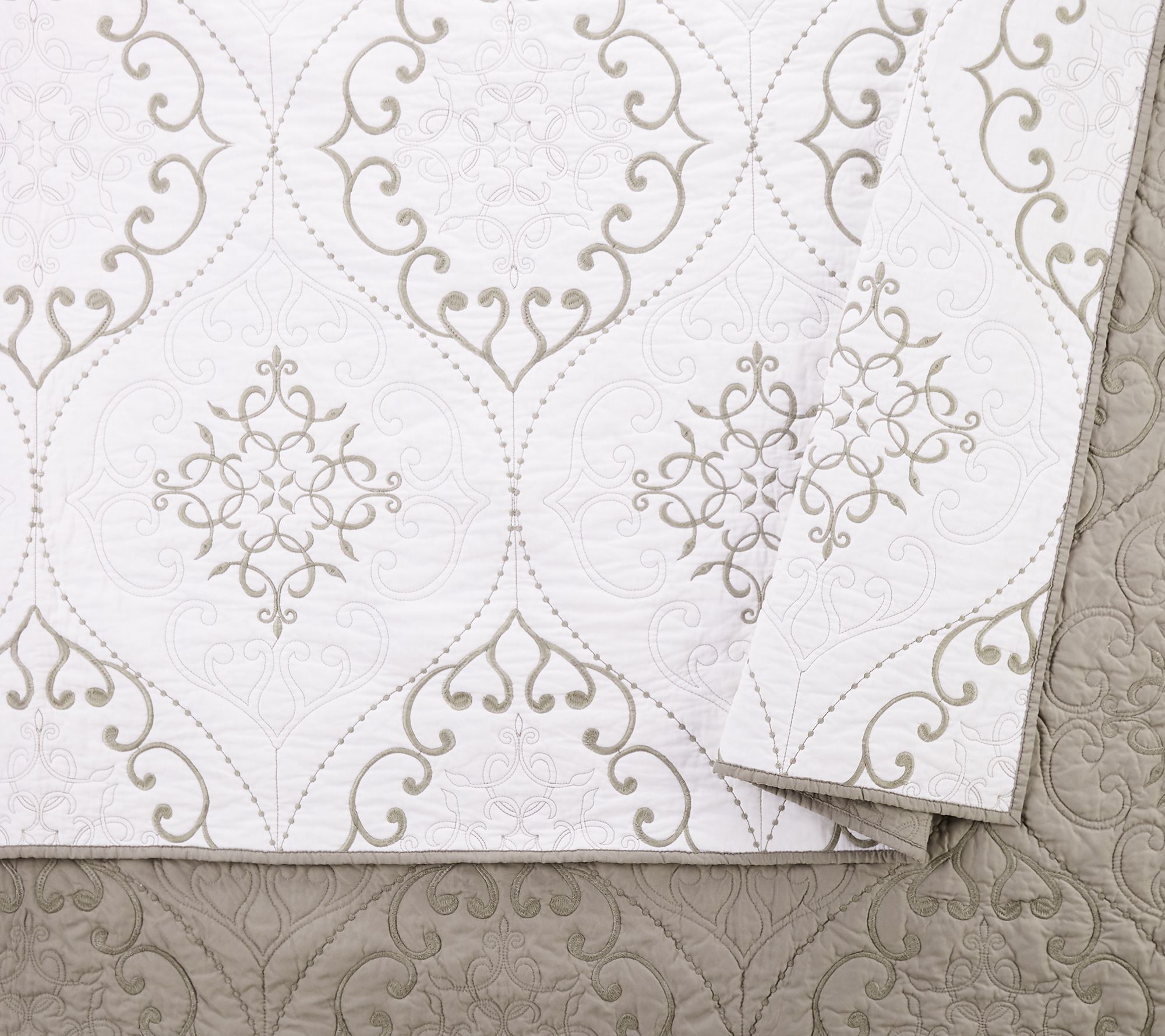 Solid-color embroidery and a reversible design lend versatile appeal to this Chambers quilt set. The intricately-scrolled medallions outlined in dotted ogees add texture and elegance to your bedroom. From Modern Heirloom.