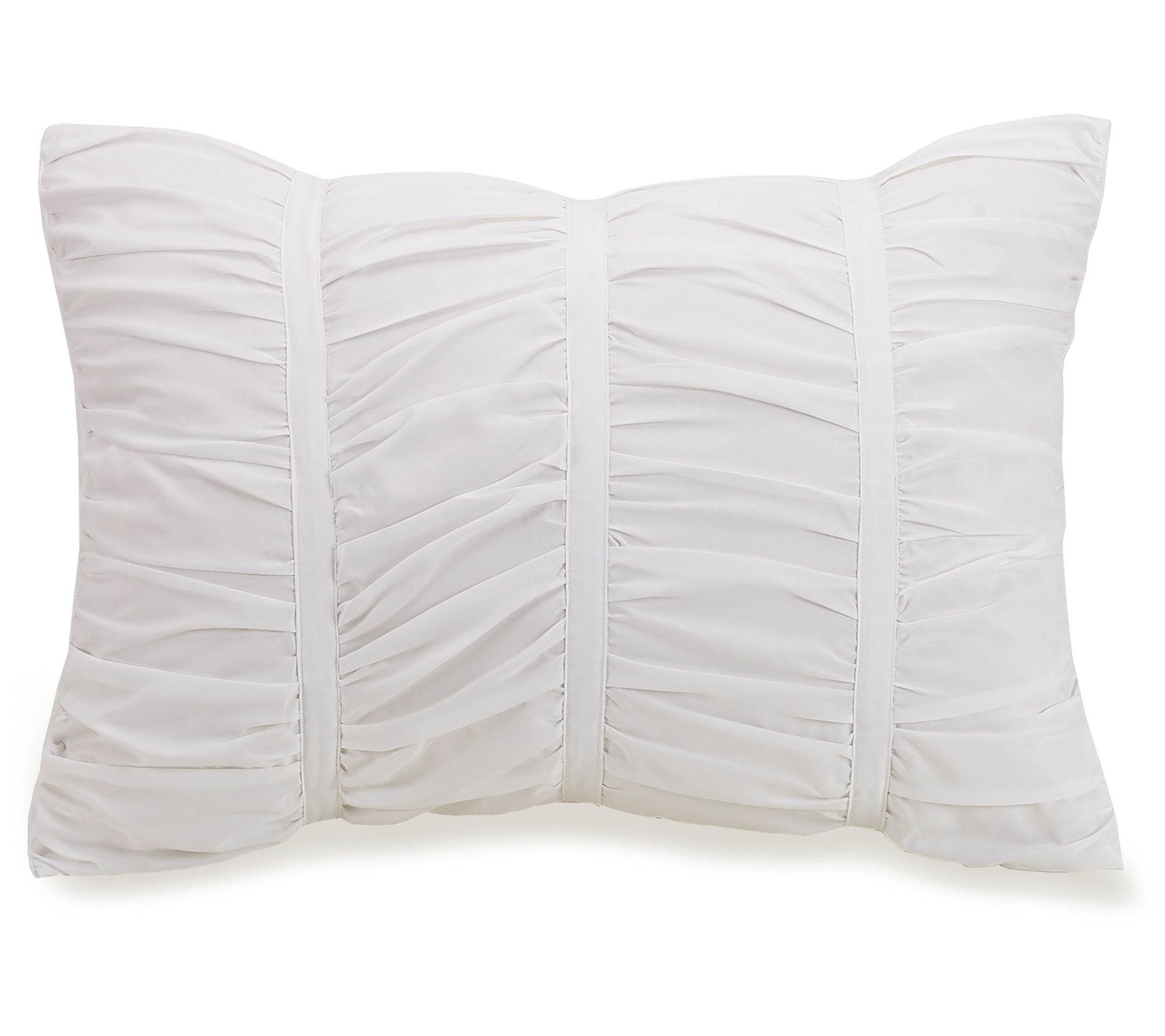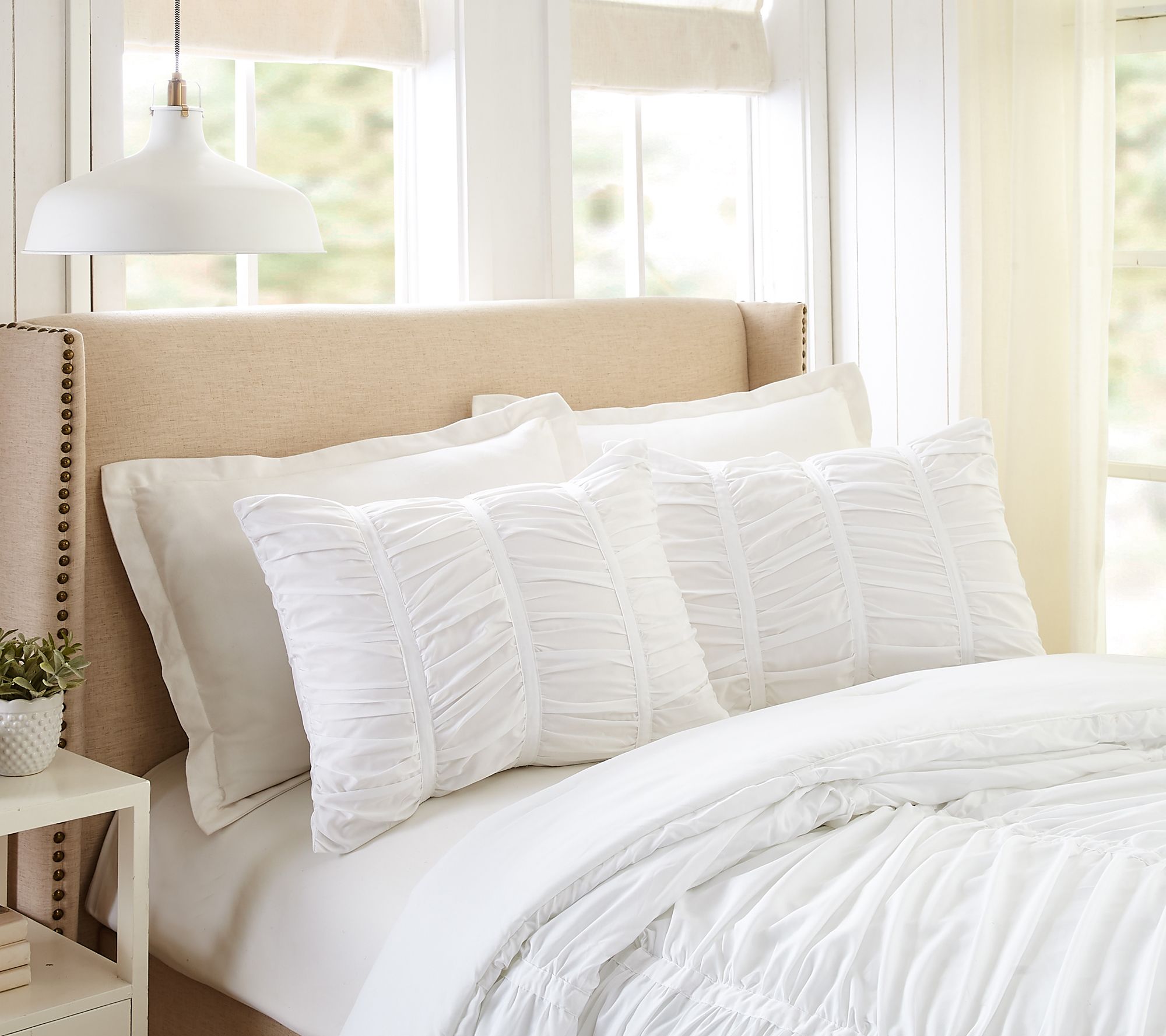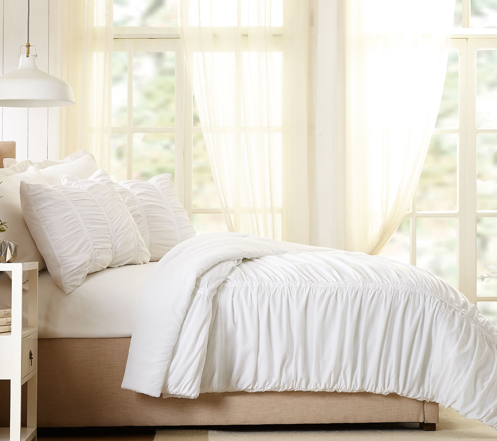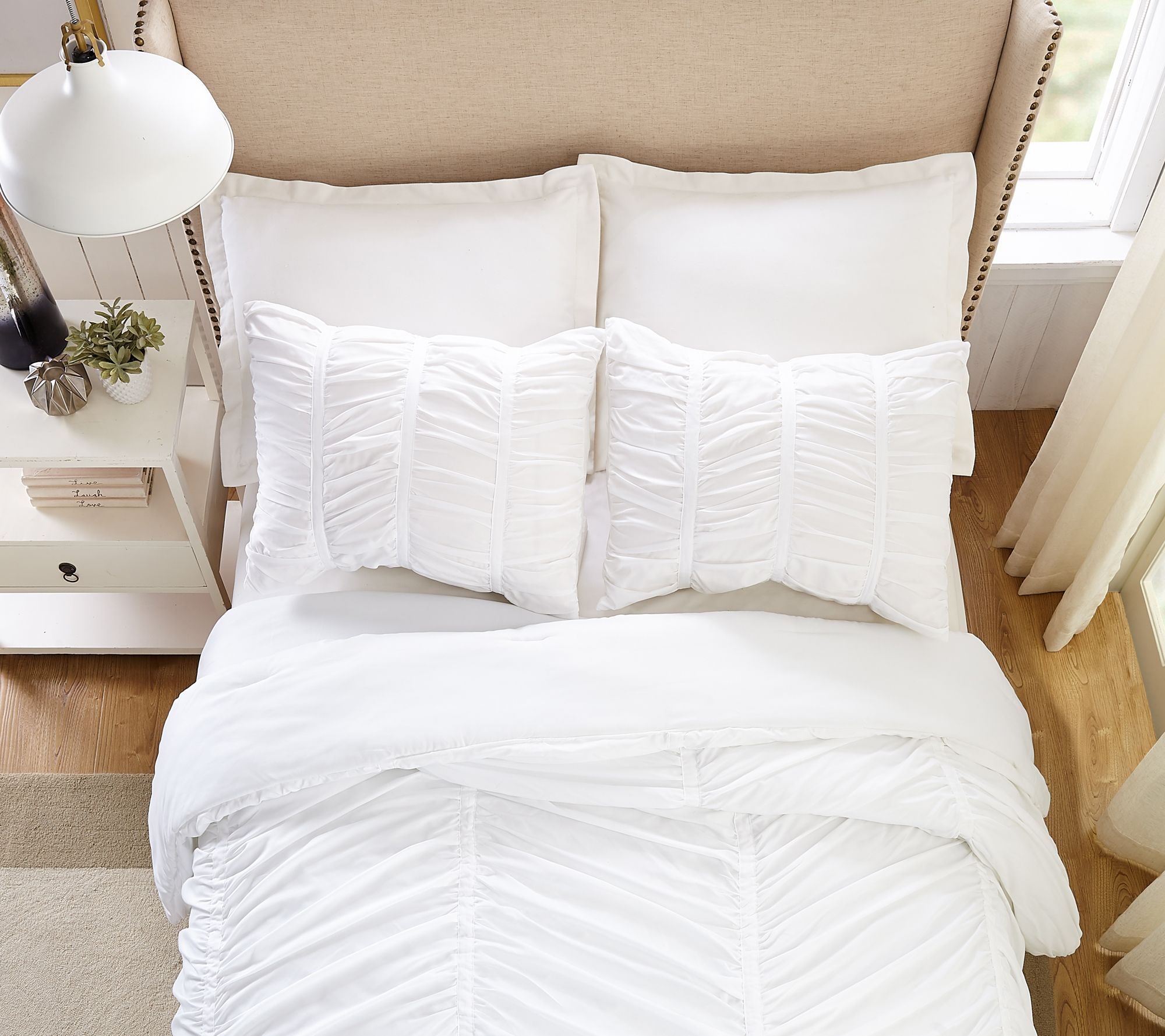 With an elegant, eye-catching rouched effect, this three-piece comforter set's gathered fabric technique creates volume, creating an airy, casual aura. From Modern Heirloom.