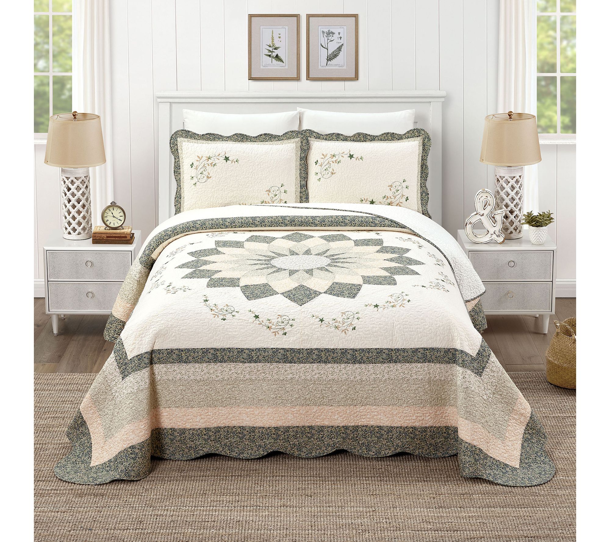 Add a touch of timeless elegance to your bedroom with this sophisticated pillow sham. The delicate embroidered green floral scrolls beautifully contrast against the off-white ground, enhanced by the floral printed border and gently scalloped edge. Perfectly complementing the Harper Bedspread, it adds a romantic touch to any decor. From Modern Heirloom.