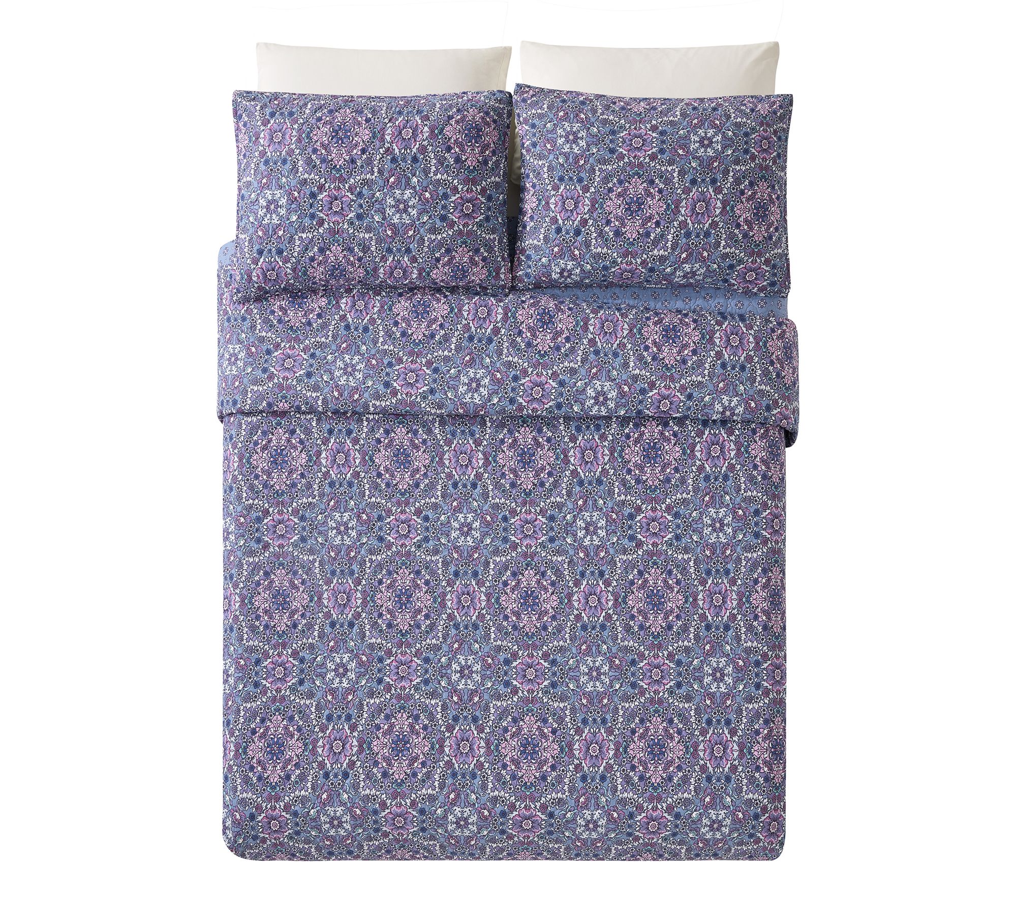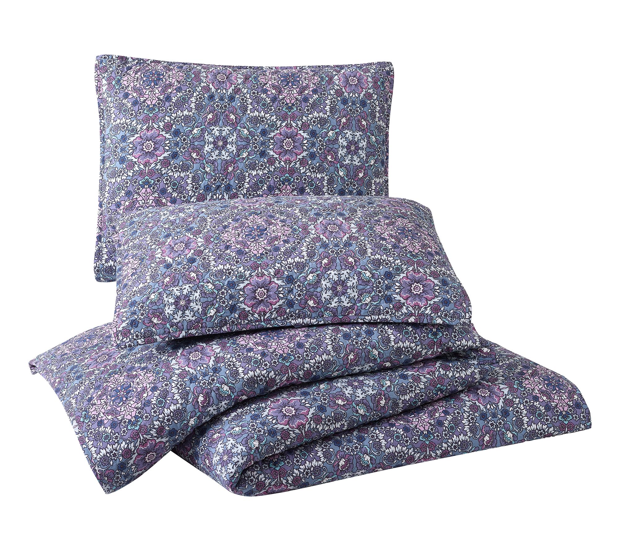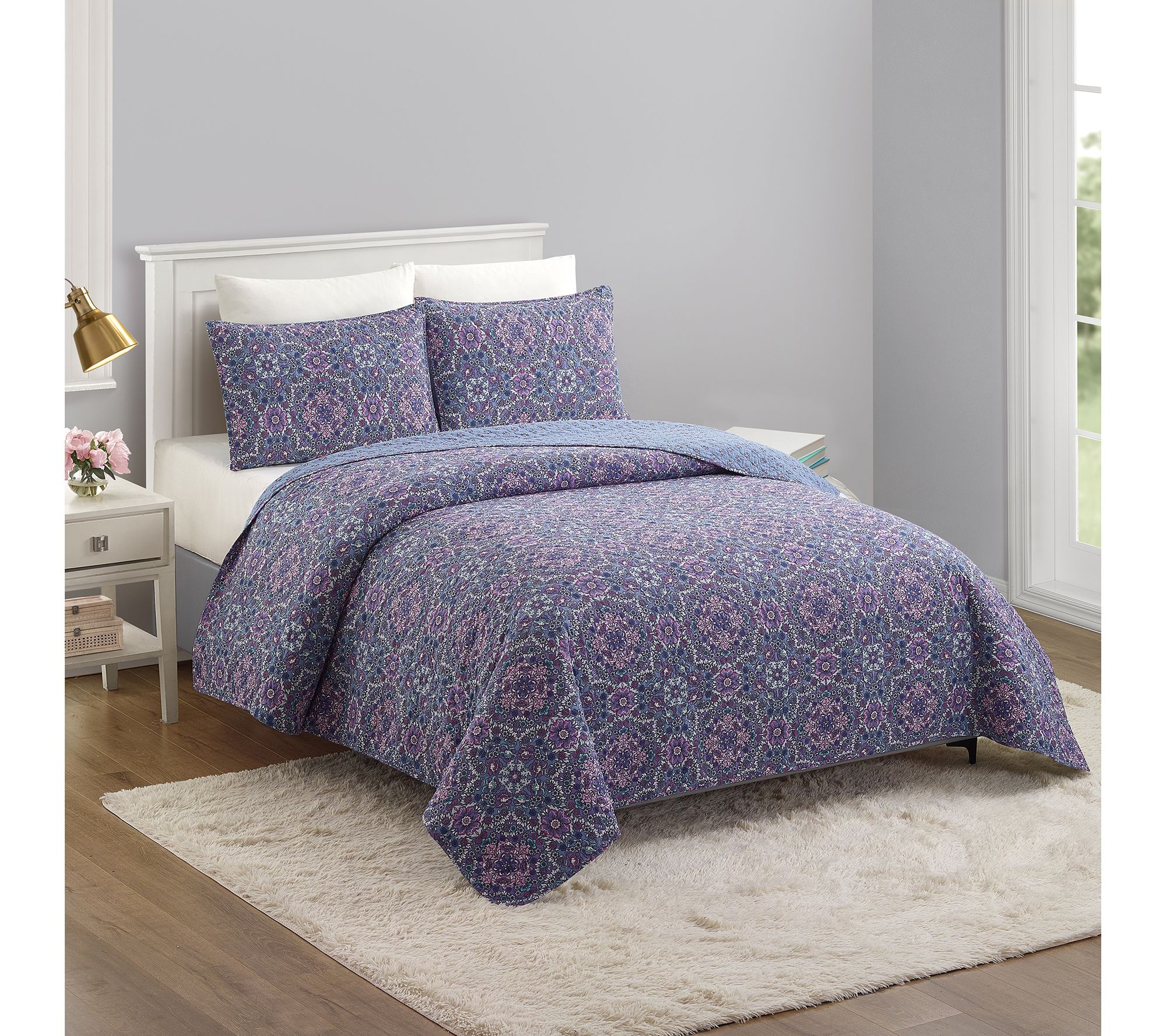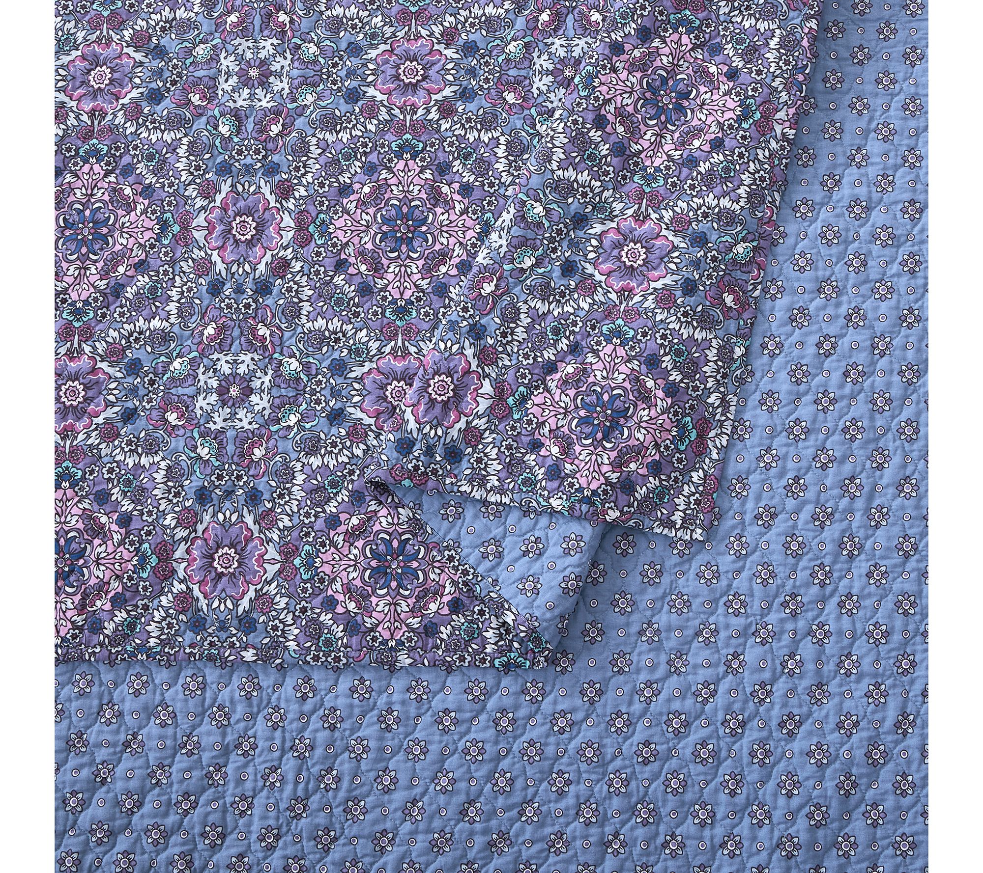 Transform your bedroom with the tranquil elegance of this quilt set, featuring a delightful medallion floral pattern in soothing lavender and blue hues. The reversible design lets you refresh your space with ease. From Modern Heirloom.