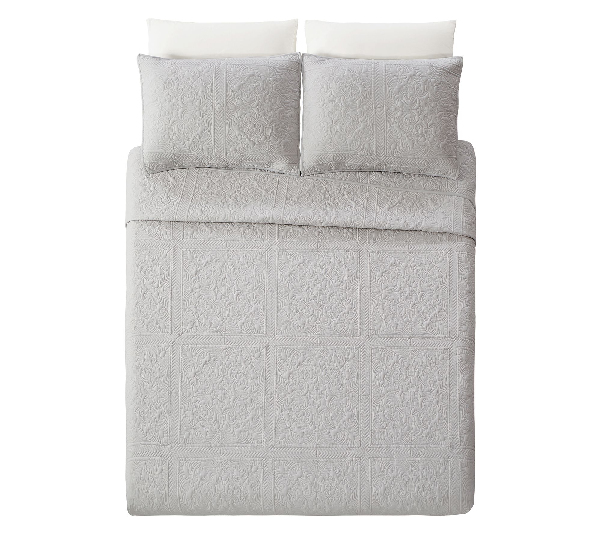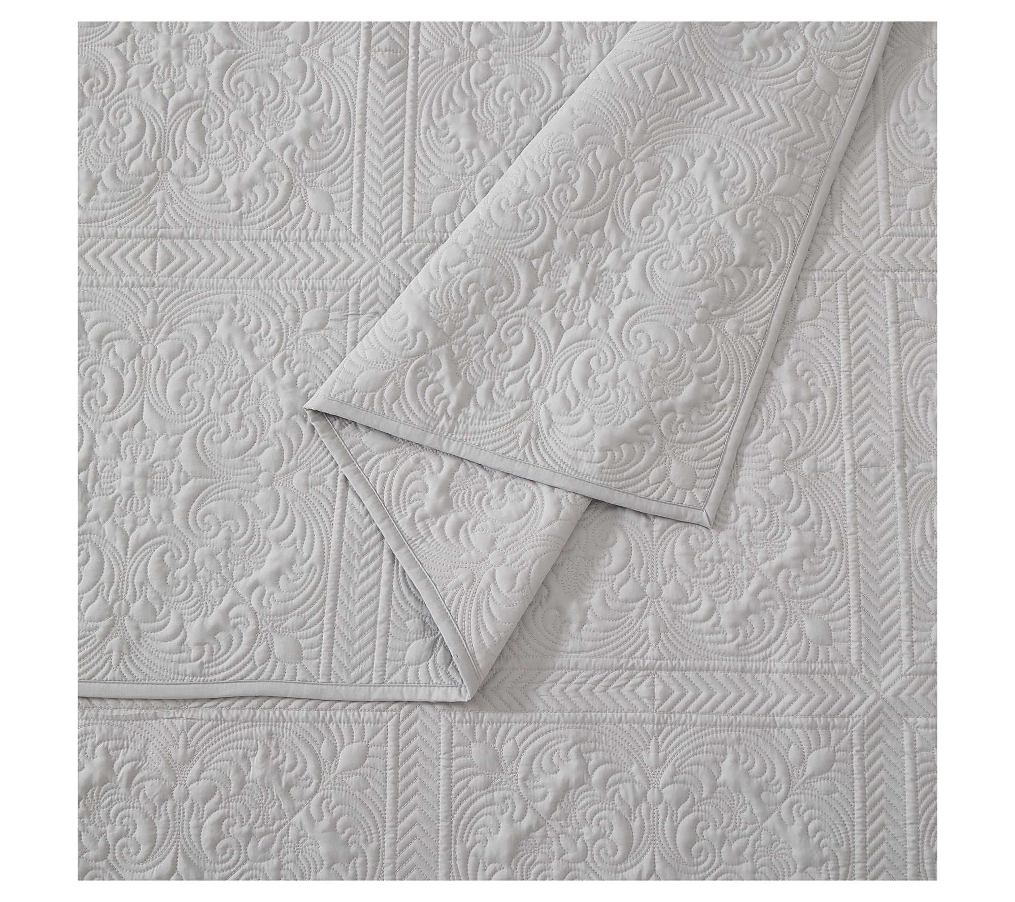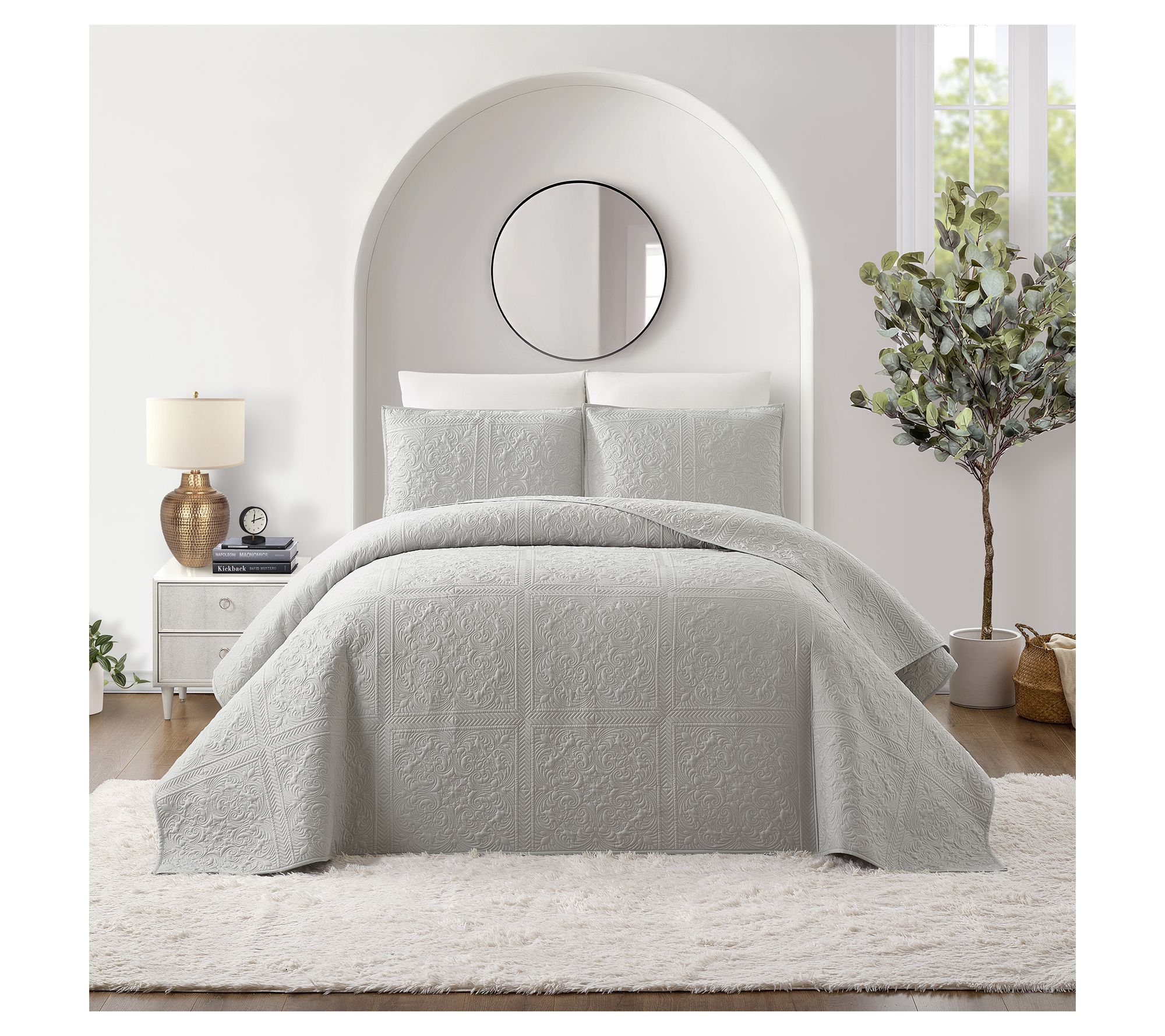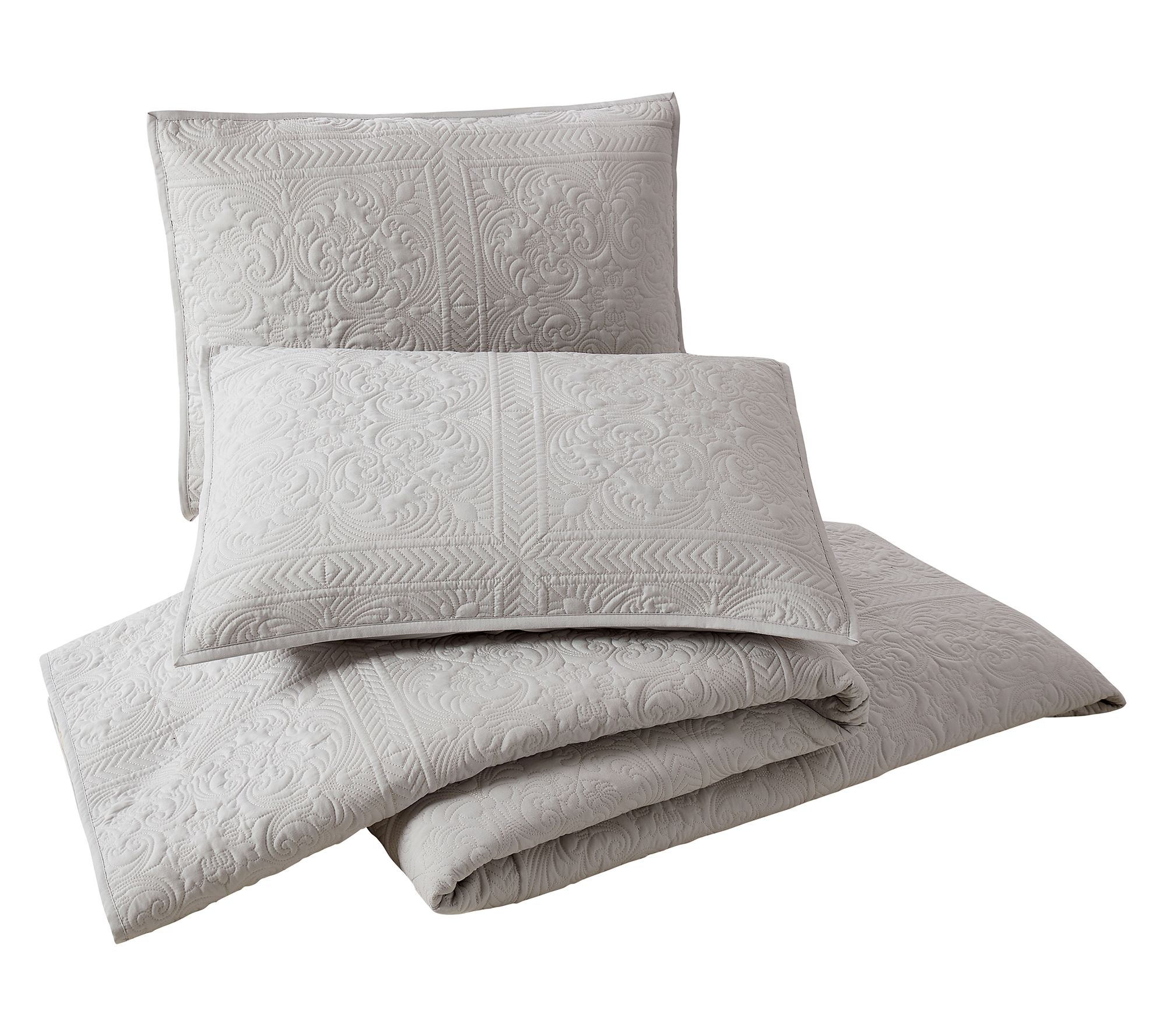 Transform your bedroom into a serene retreat with this classic yet contemporary bedspread set. Available in versatile white or gray, it complements any color scheme while providing a plush, inviting layer to your bed. Crafted from soft, brushed 100% polyester, this set is both durable and cozy. The intricate stitched pattern adds a touch of sophistication, while the lightweight polyester fill adds just the right amount of warmth for year-round comfort. From Modern Heirloom.