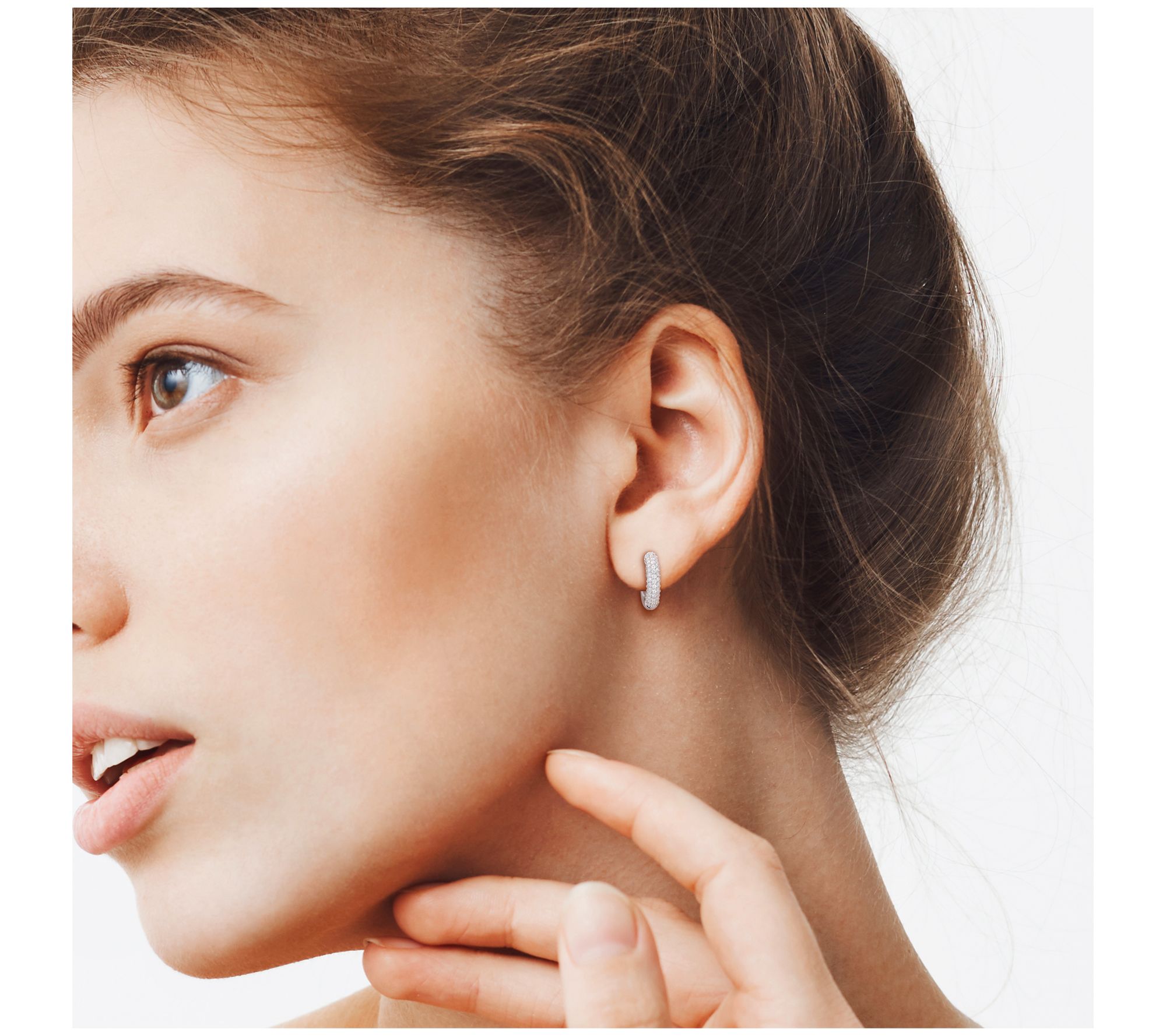 Hoop design with rows of round-cut, pave-set lab-created moissanite; polished finish