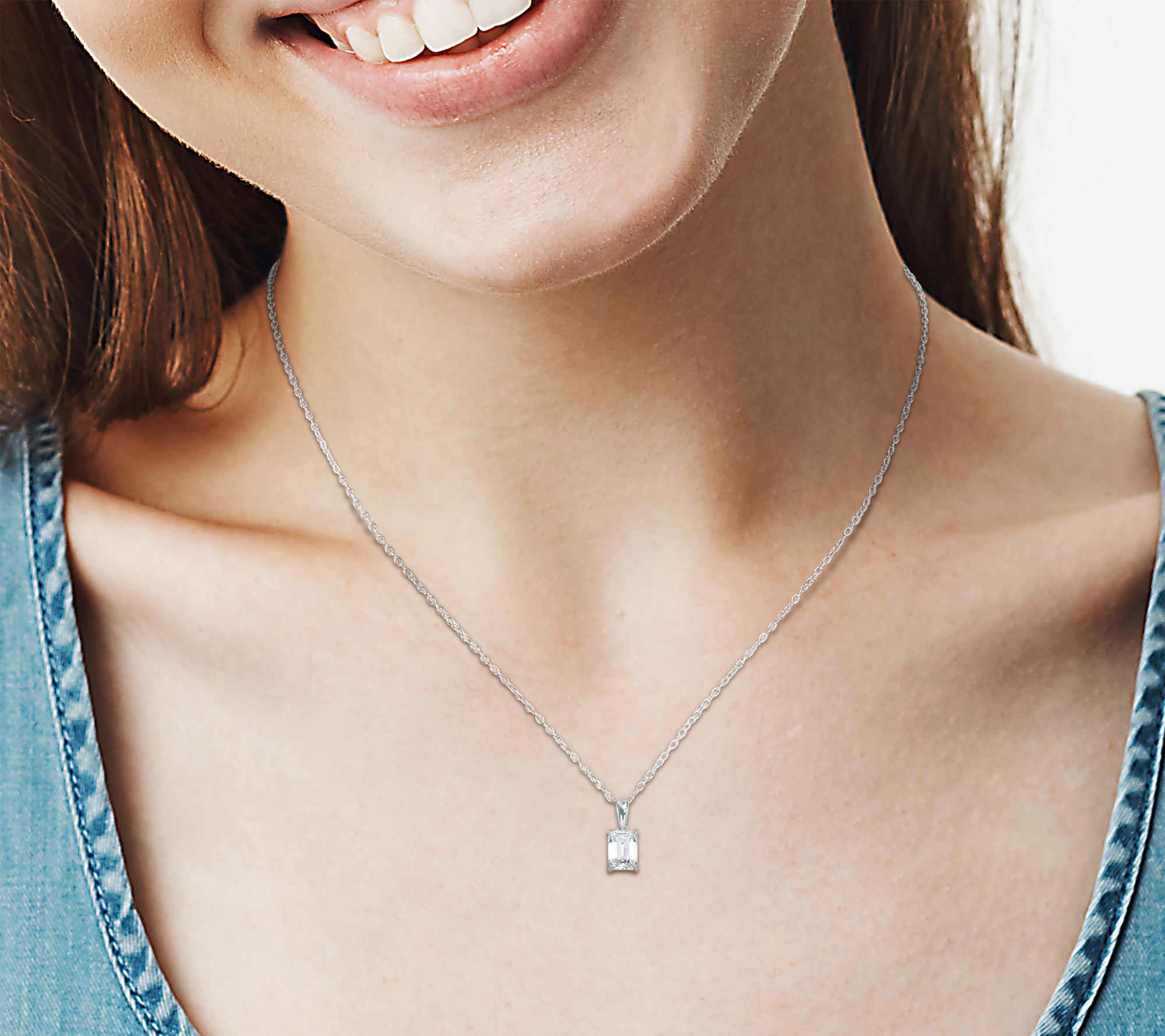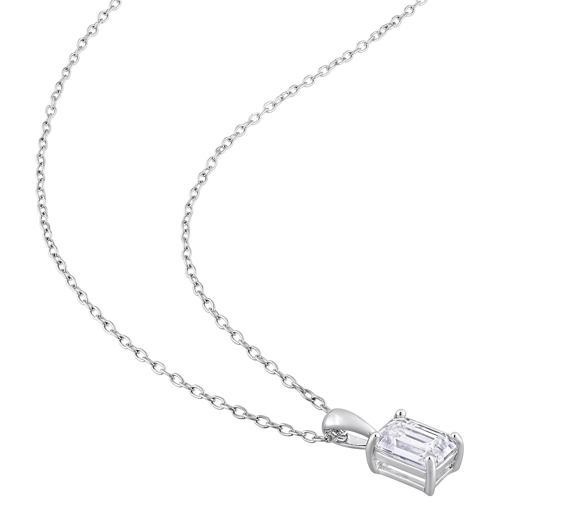 Solitaire pendant with emerald-cut prong-set lab-created moissanite gemstone; polished finish