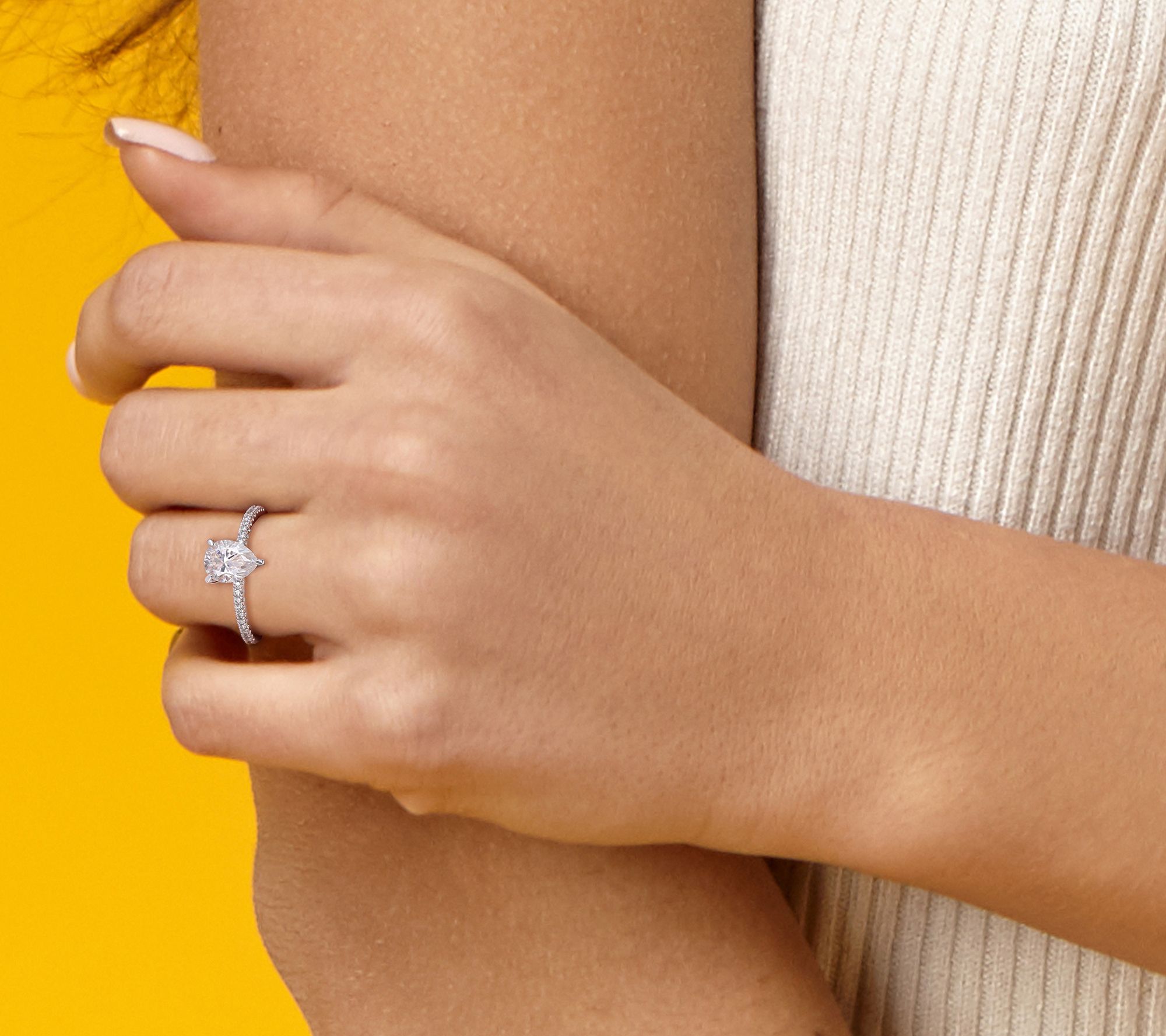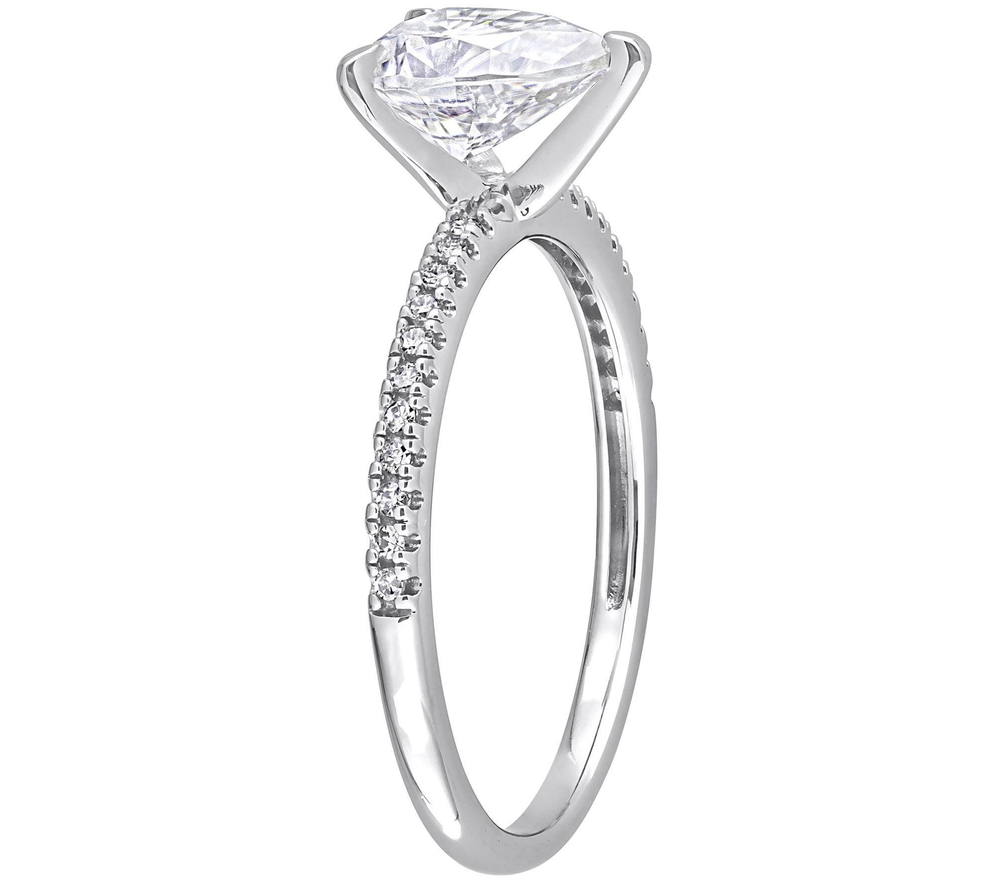 Add a sparkling reminder of romance to your finger with this timeless engagement ring featuring a large lab-grown moissanite gemstone surrounded by eye-catching diamonds. From MoissanIce.