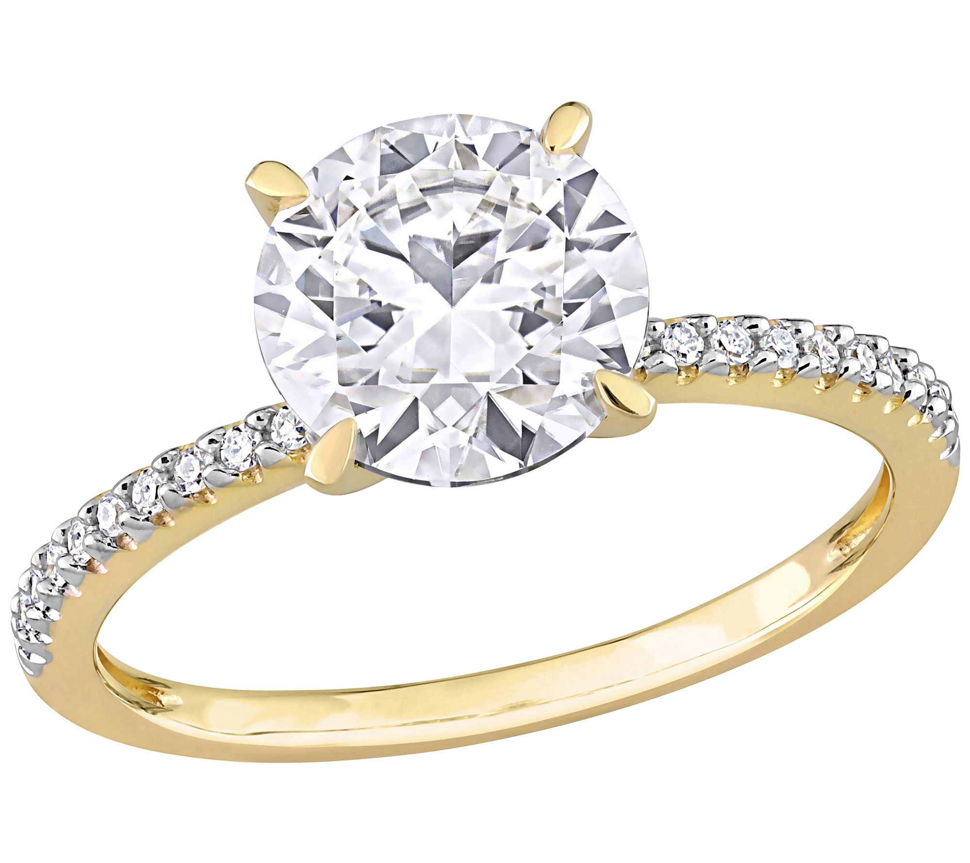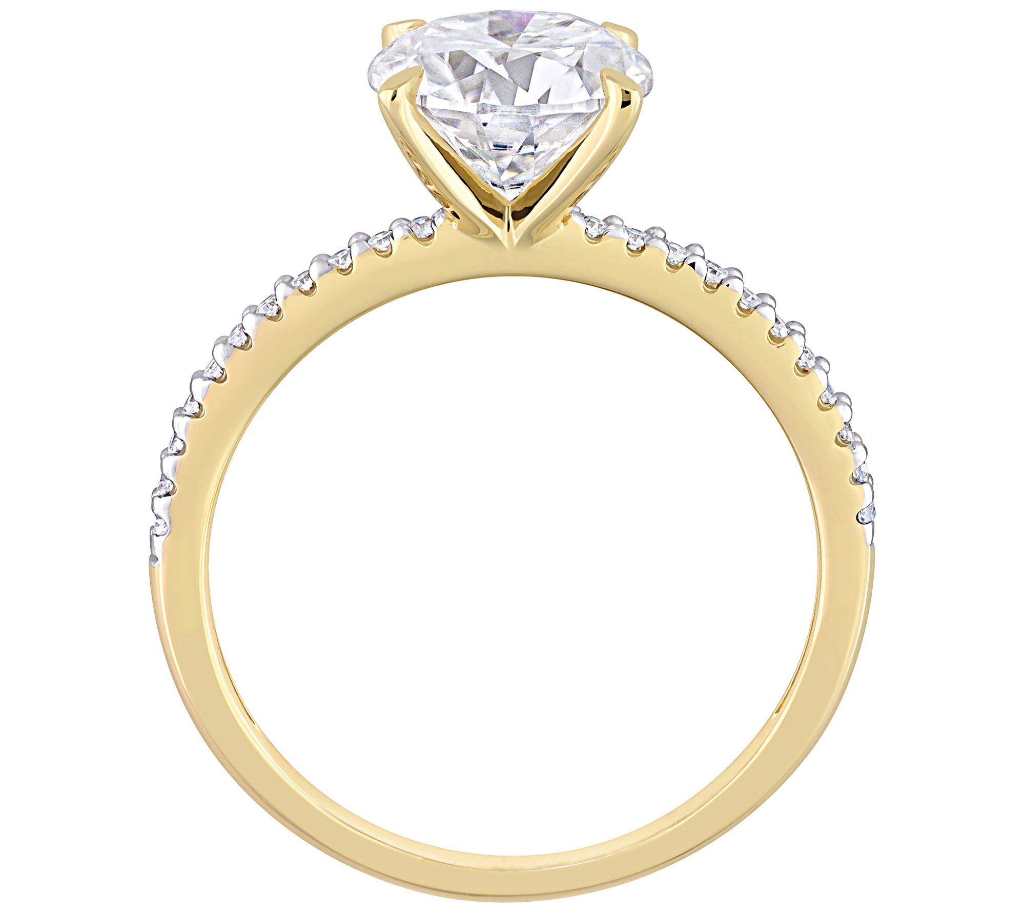 Round-cut, prong-set moissanite center stone; round-cut, pave-set diamond side stones; polished finish