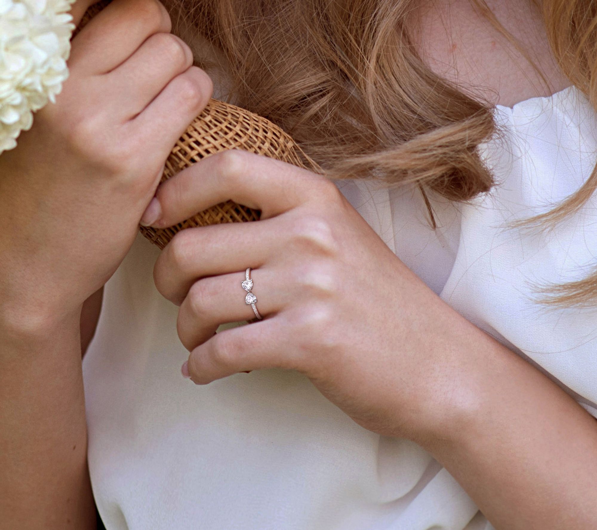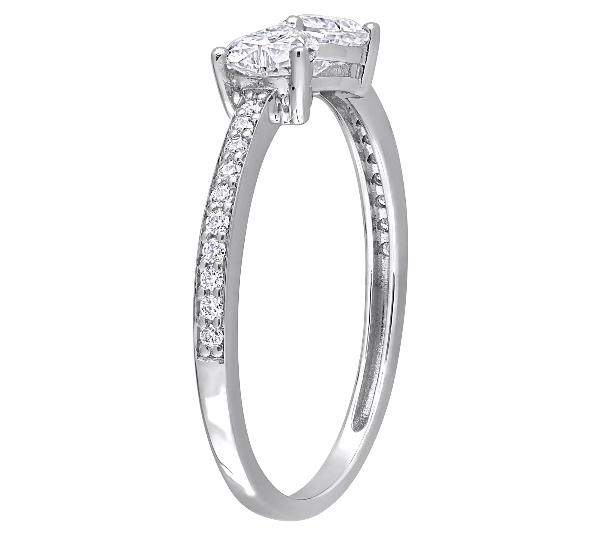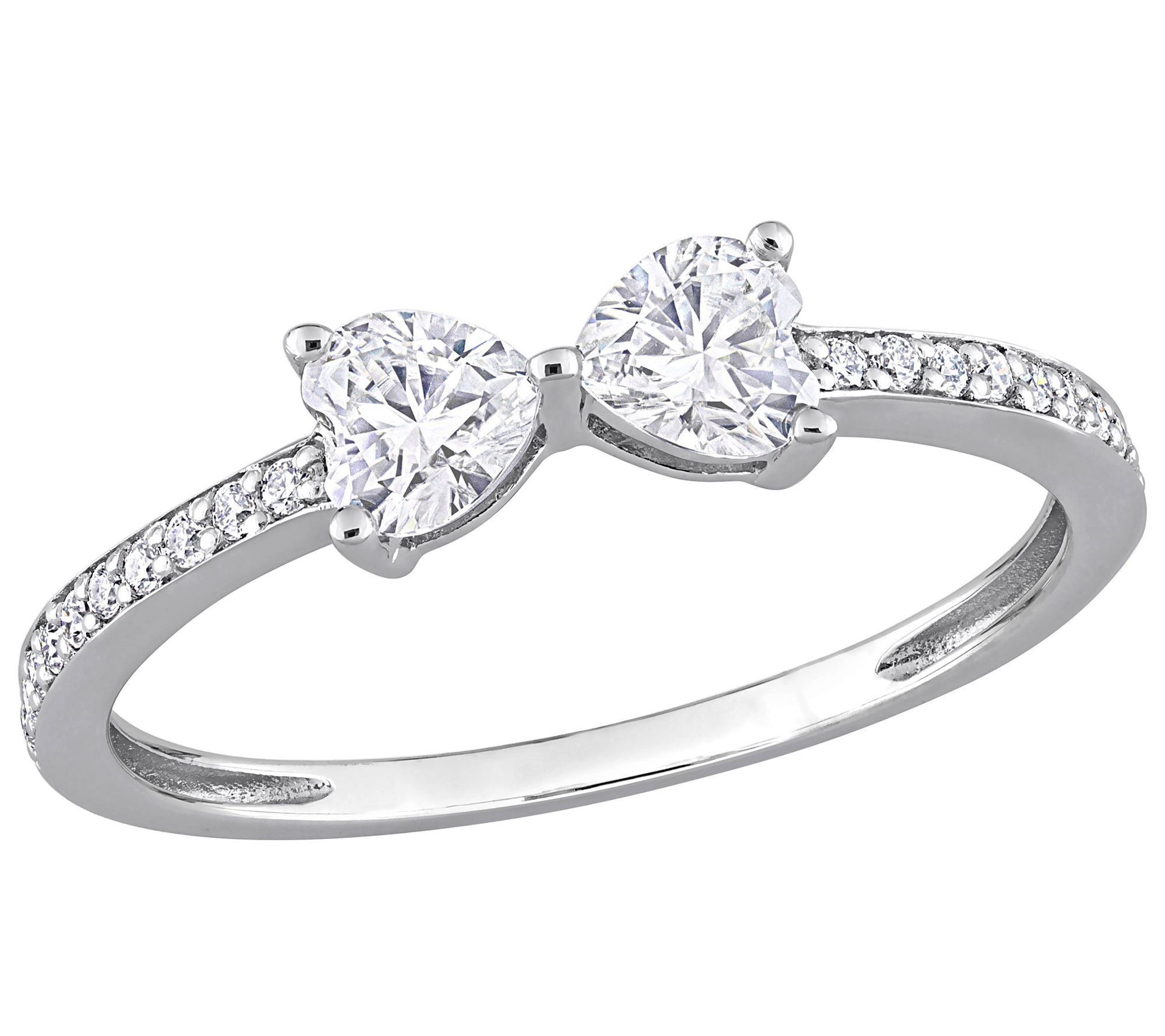 - Heart-cut prong-set and round-cut prong-set lab-created moissanite stone; polished finish
