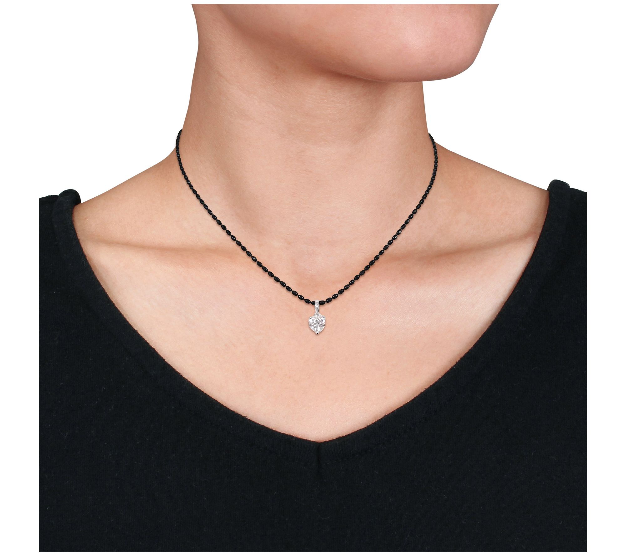 Solitaire pendant with heart-cut, prong-set lab-created moissanite stone; polished finish; black ion-plated oval diamond-cut cable chain