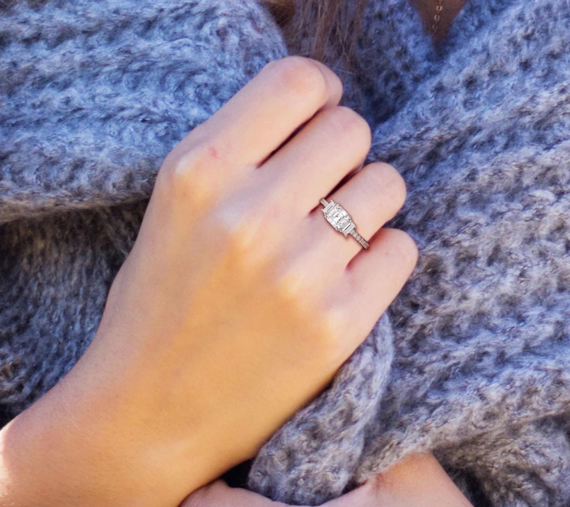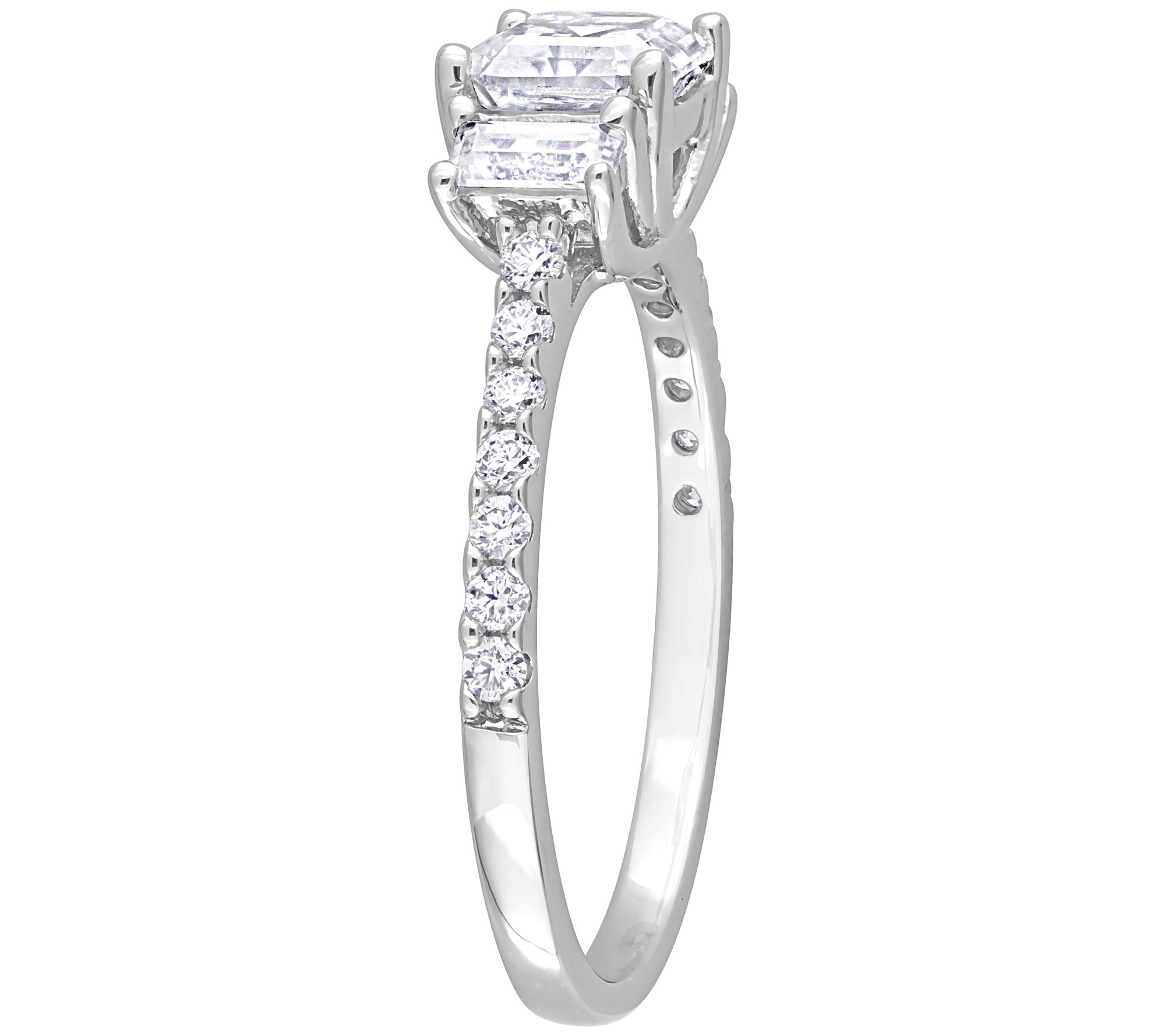 Three-stone ring with octagon asscher, baguette-cut prong-set lab-created moissanite at the center, and round-cut prong-set lab-created moissanite gemstones at both sides; polished finish