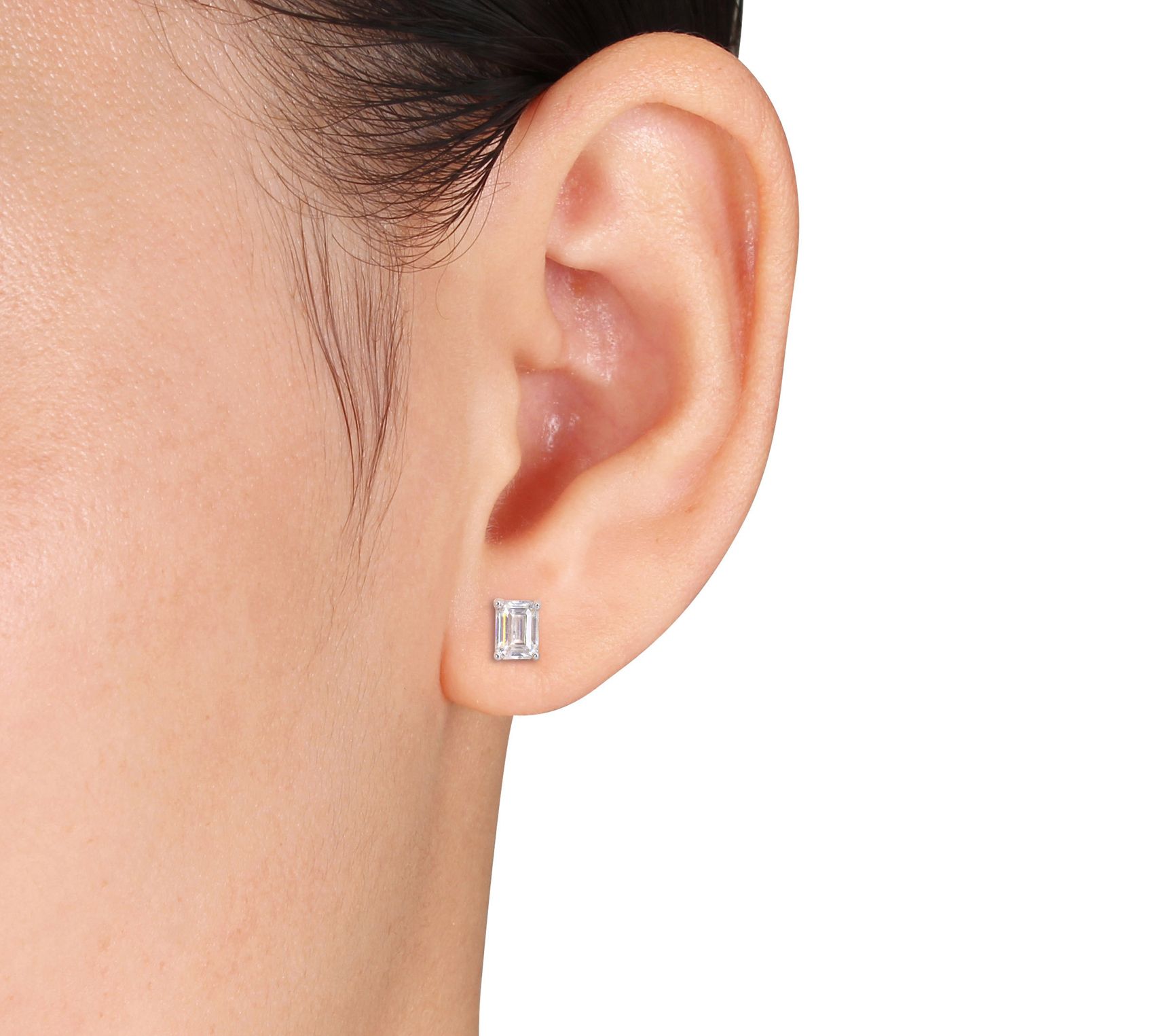 Stud earrings with emerald-cut, prong-set created moissanite stones; polished finish