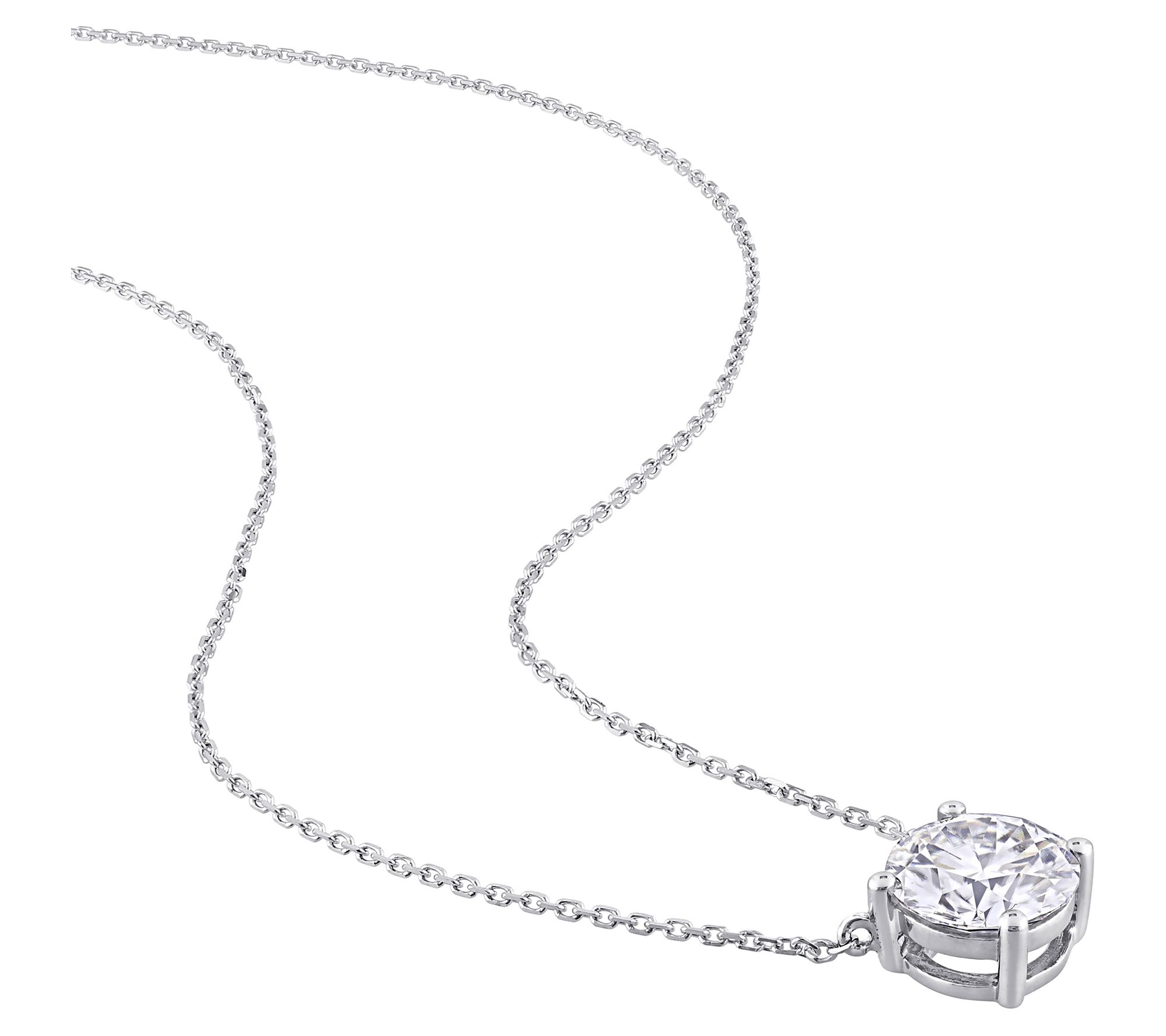 Solitaire pendant with round-cut, prong-set lab-created moissanite; polished finish; cable chain