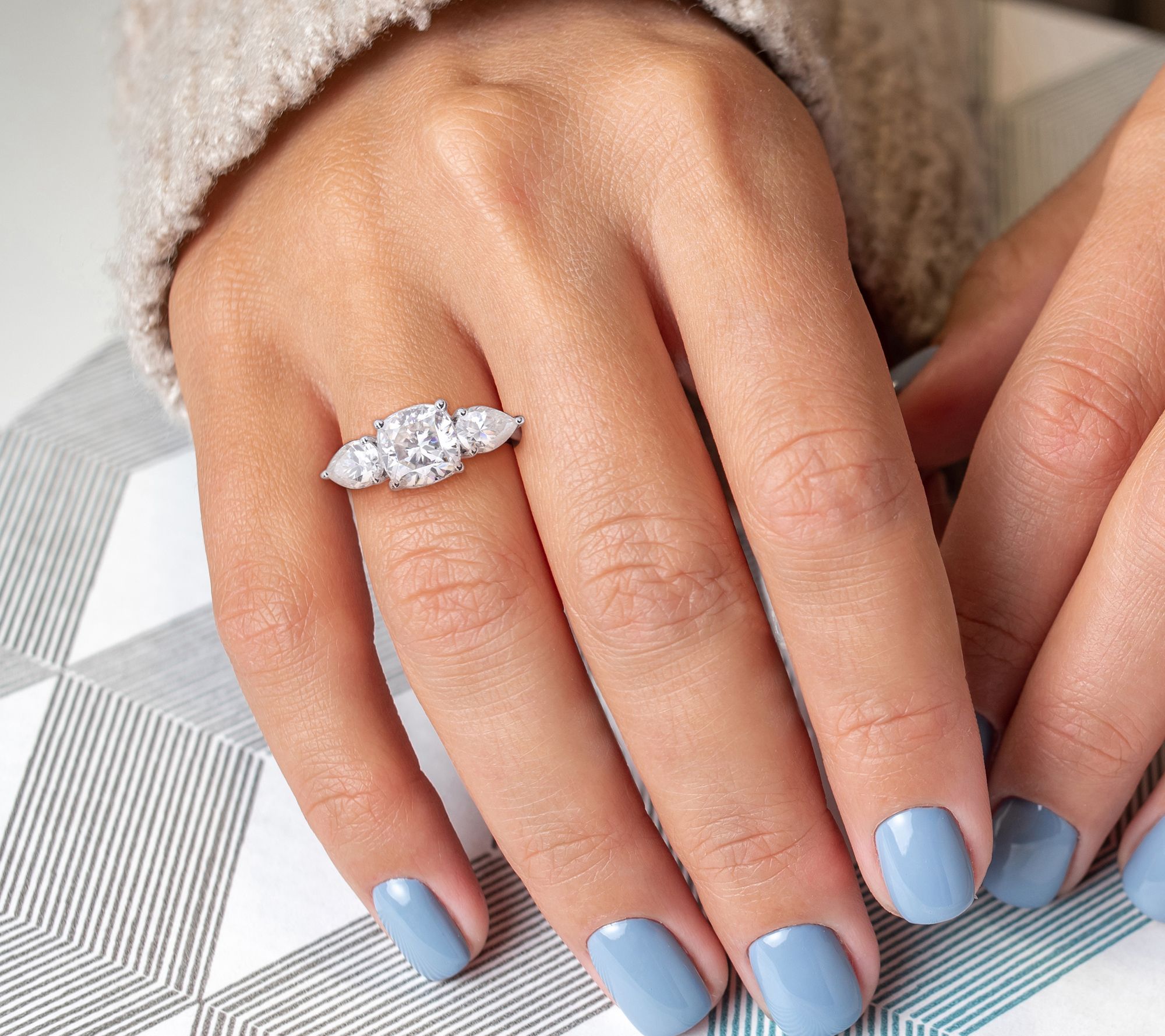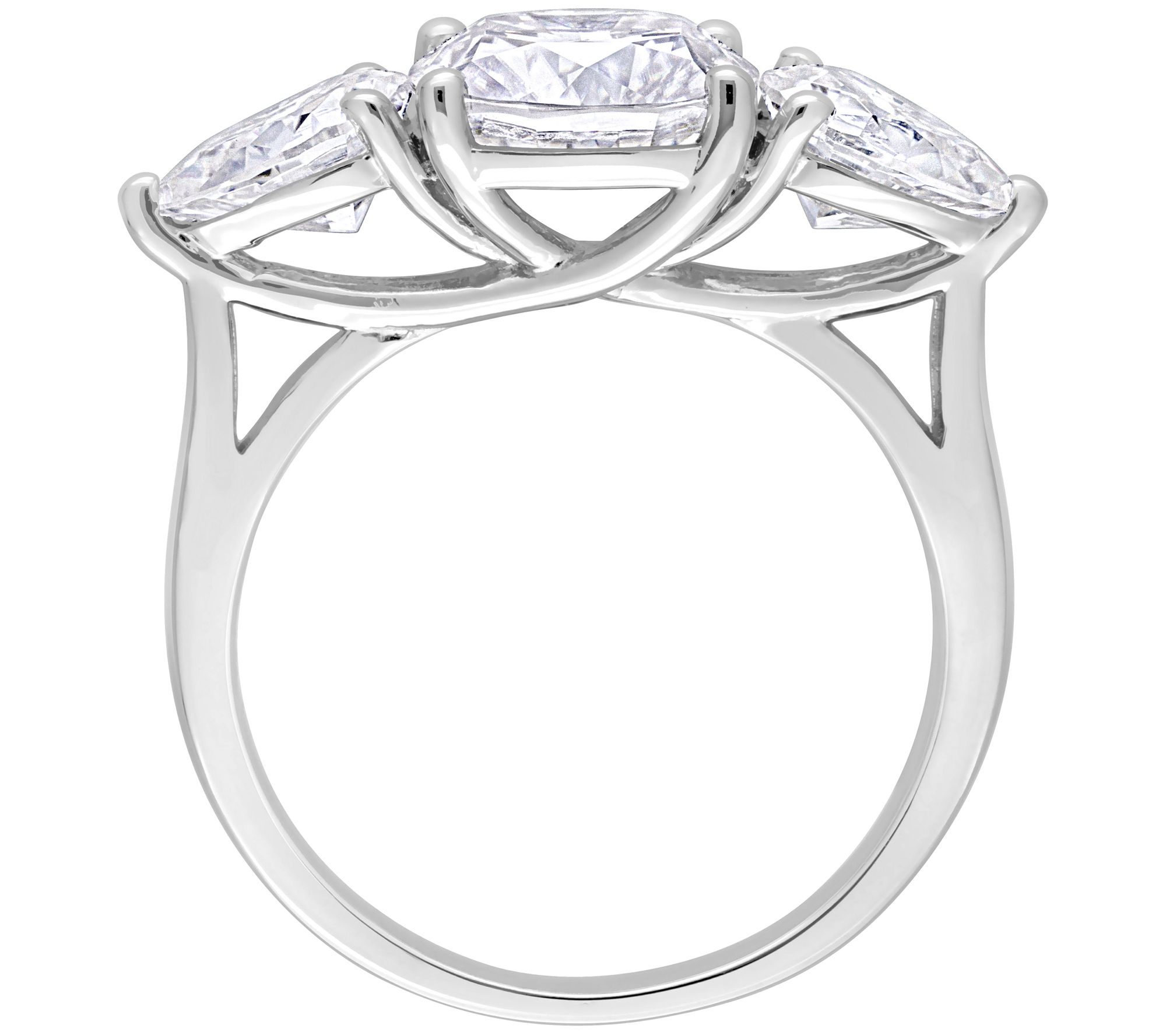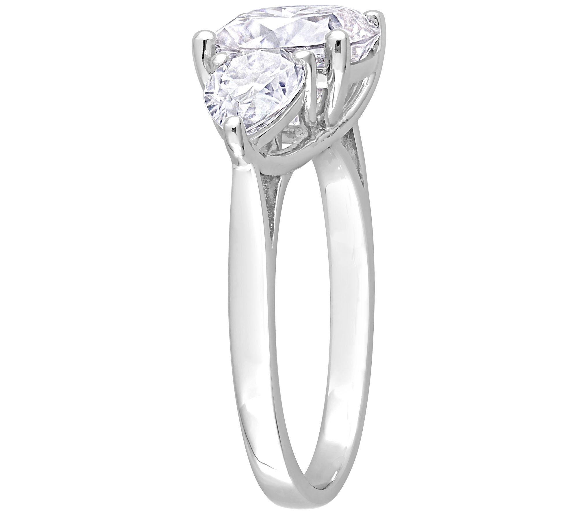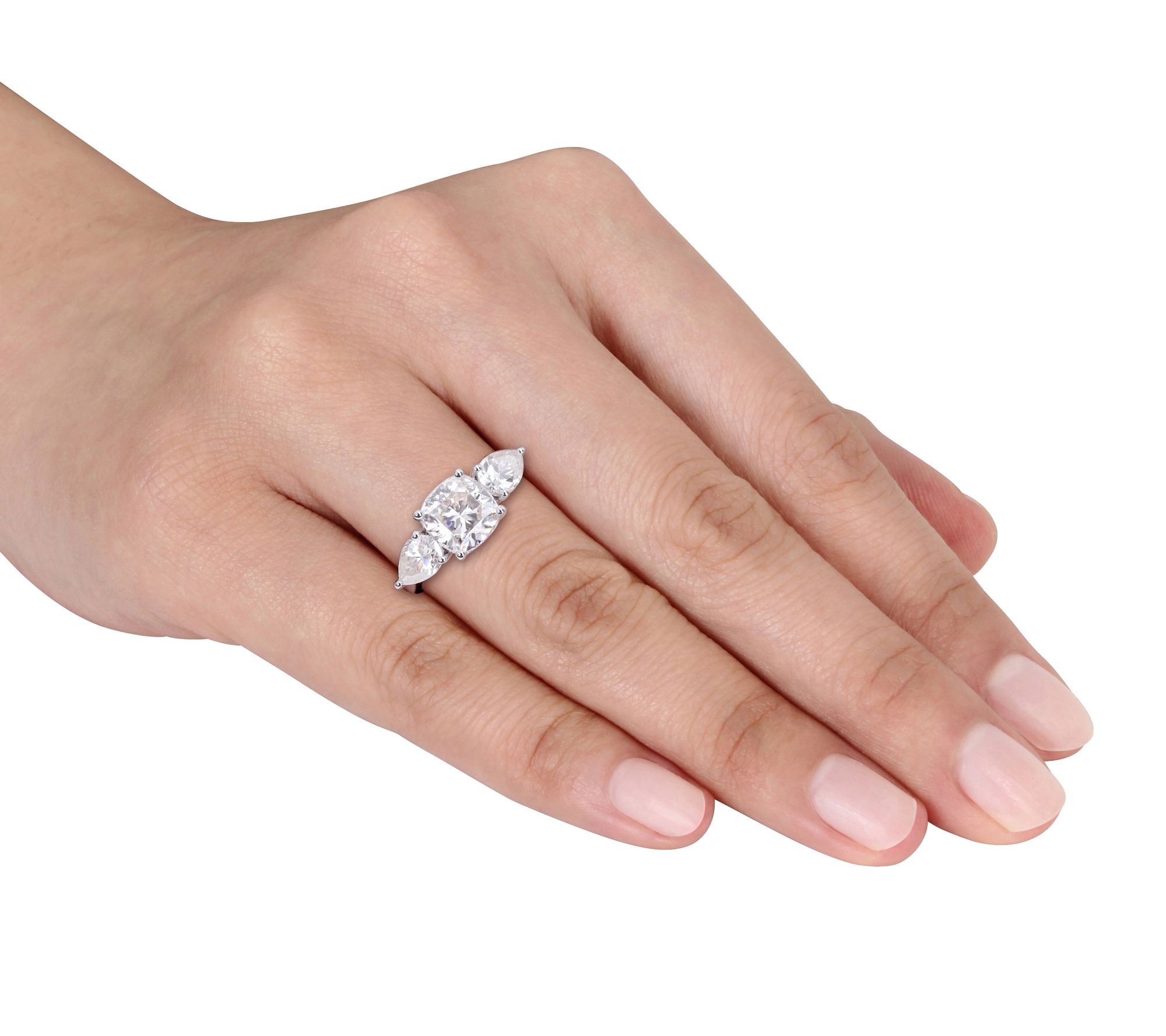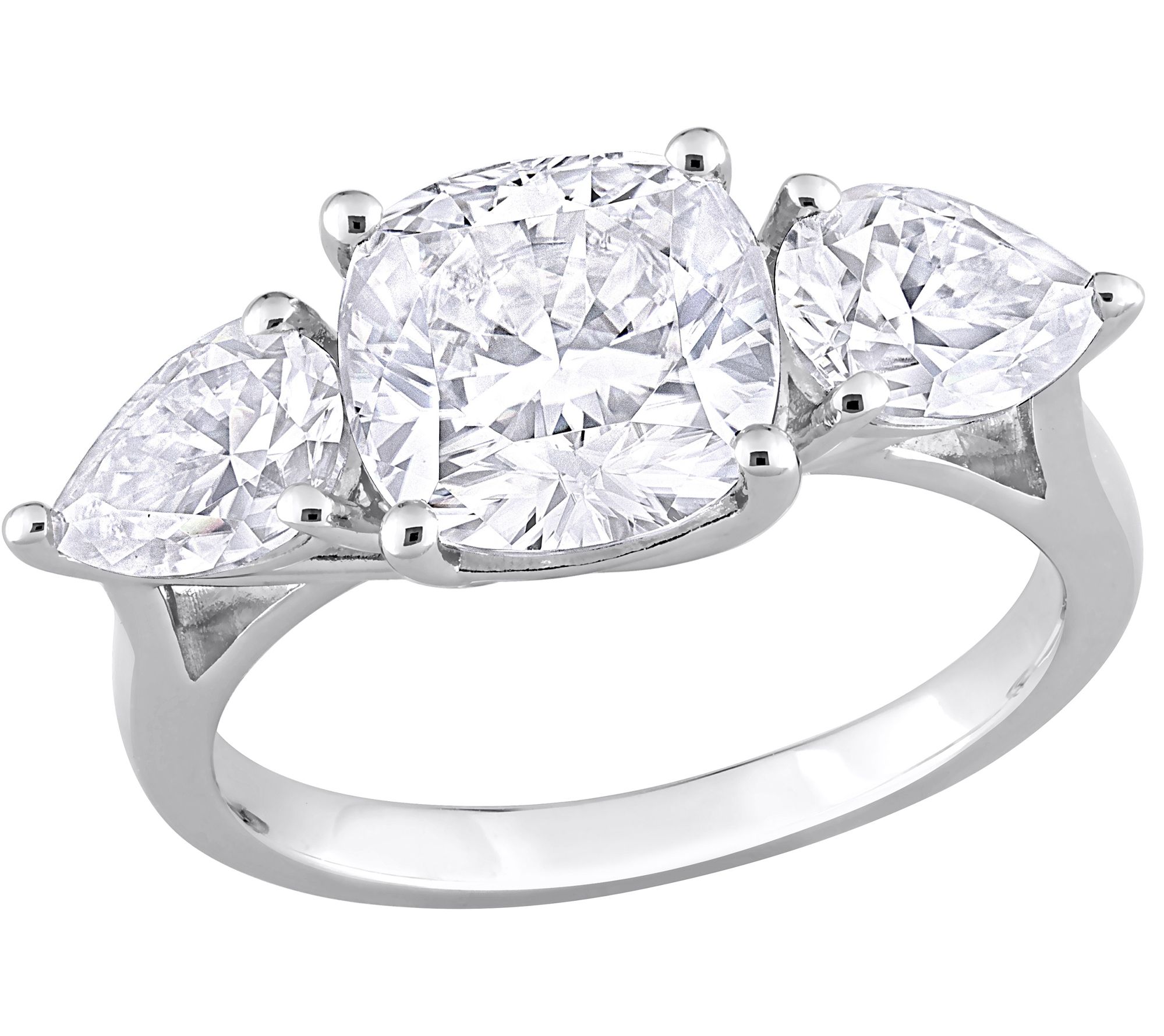 Three-stone ring with cushion- and pear-cut, prong-set lab-created moissanite stones; polished finish