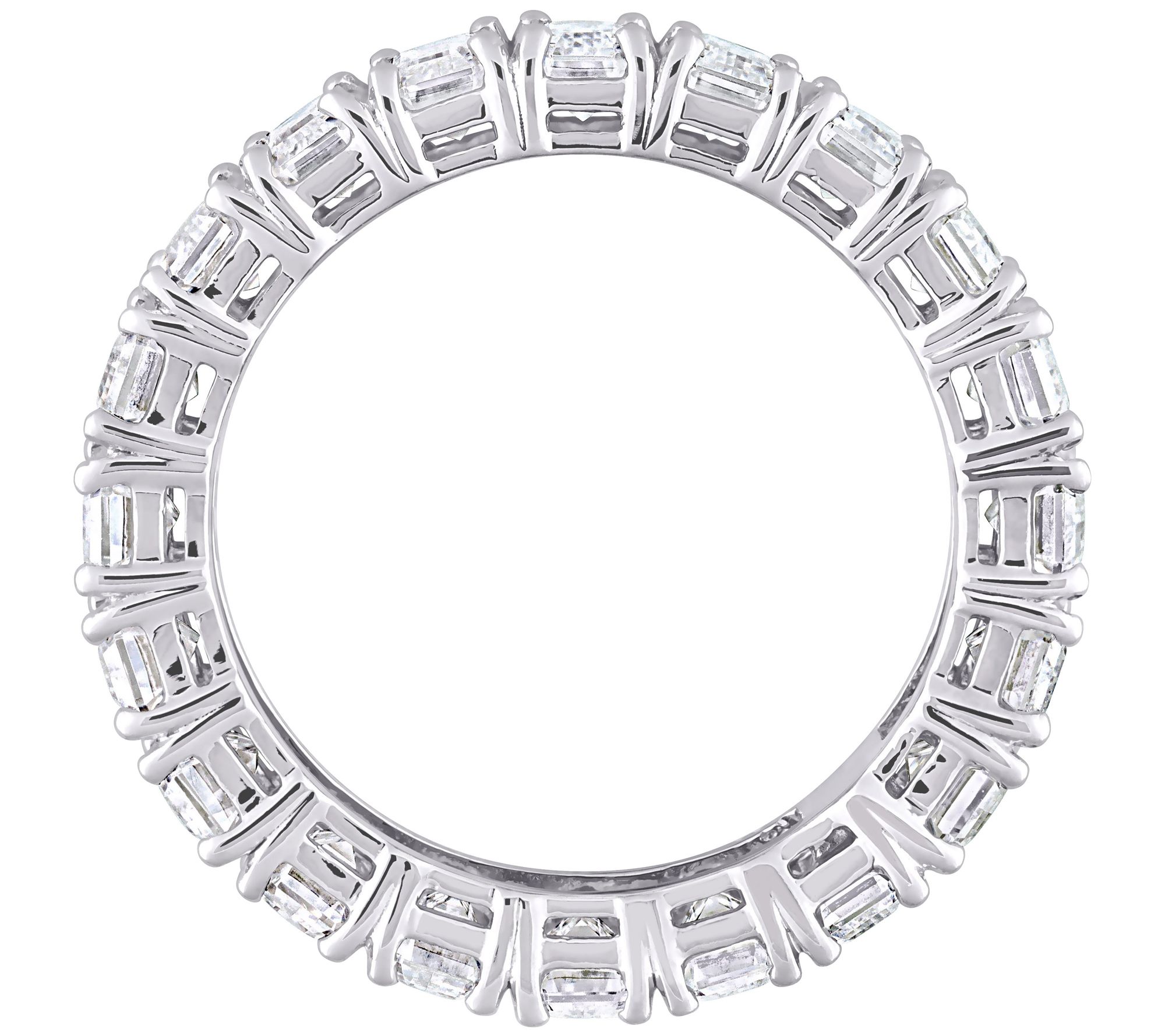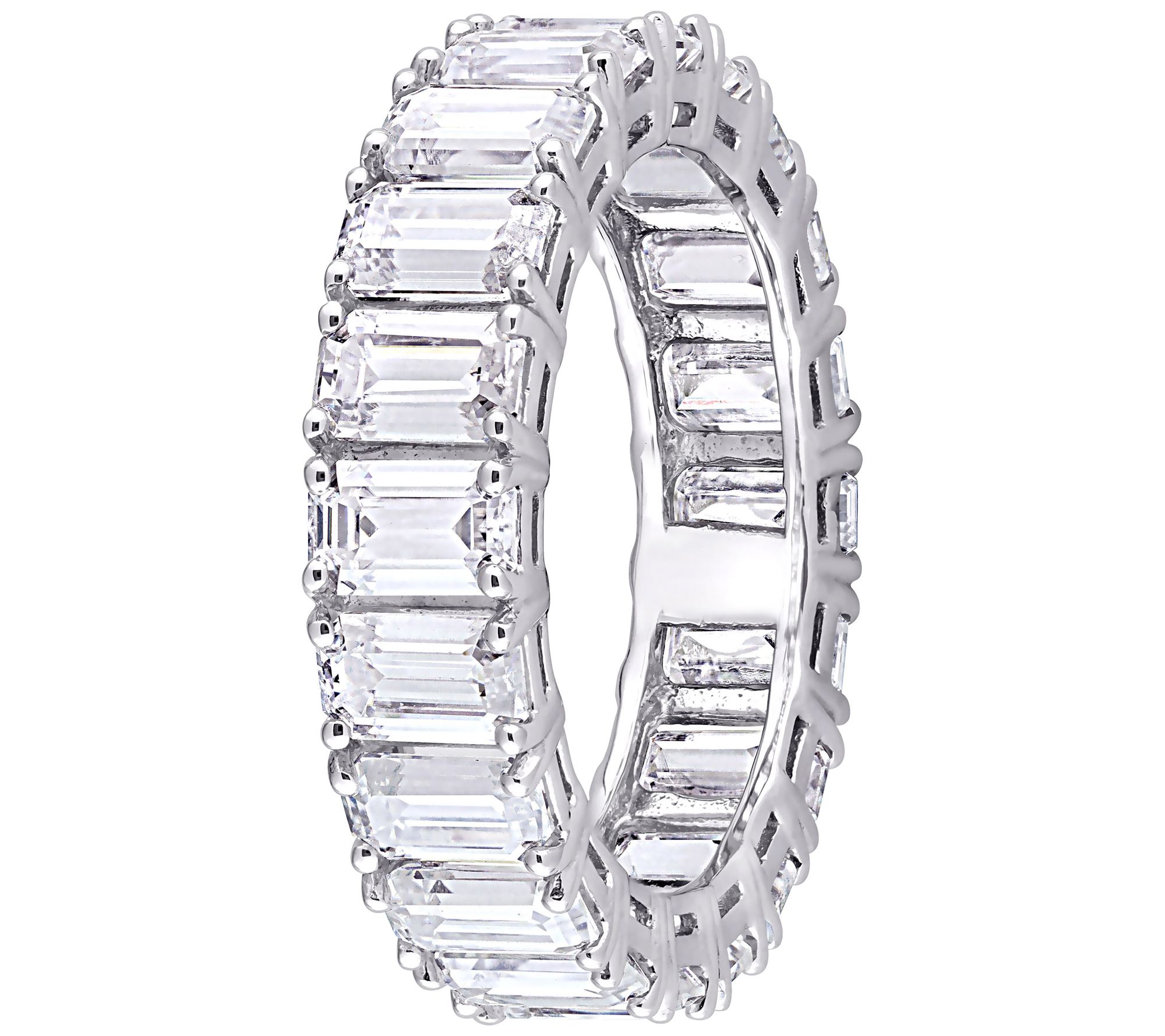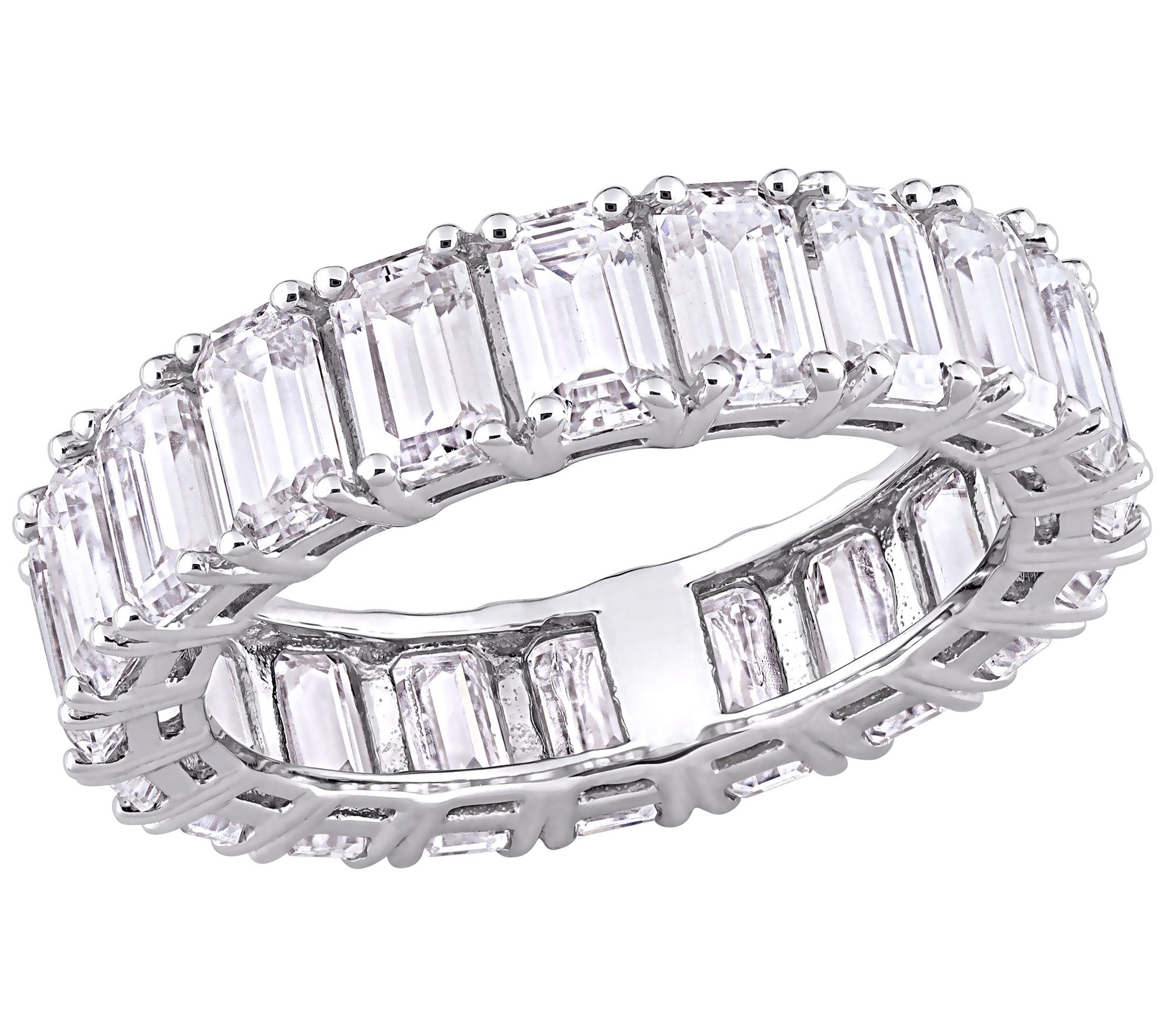 - Full eternity band with an octagon-cut, prong-set lab-created moissanite gemstone; polished finish