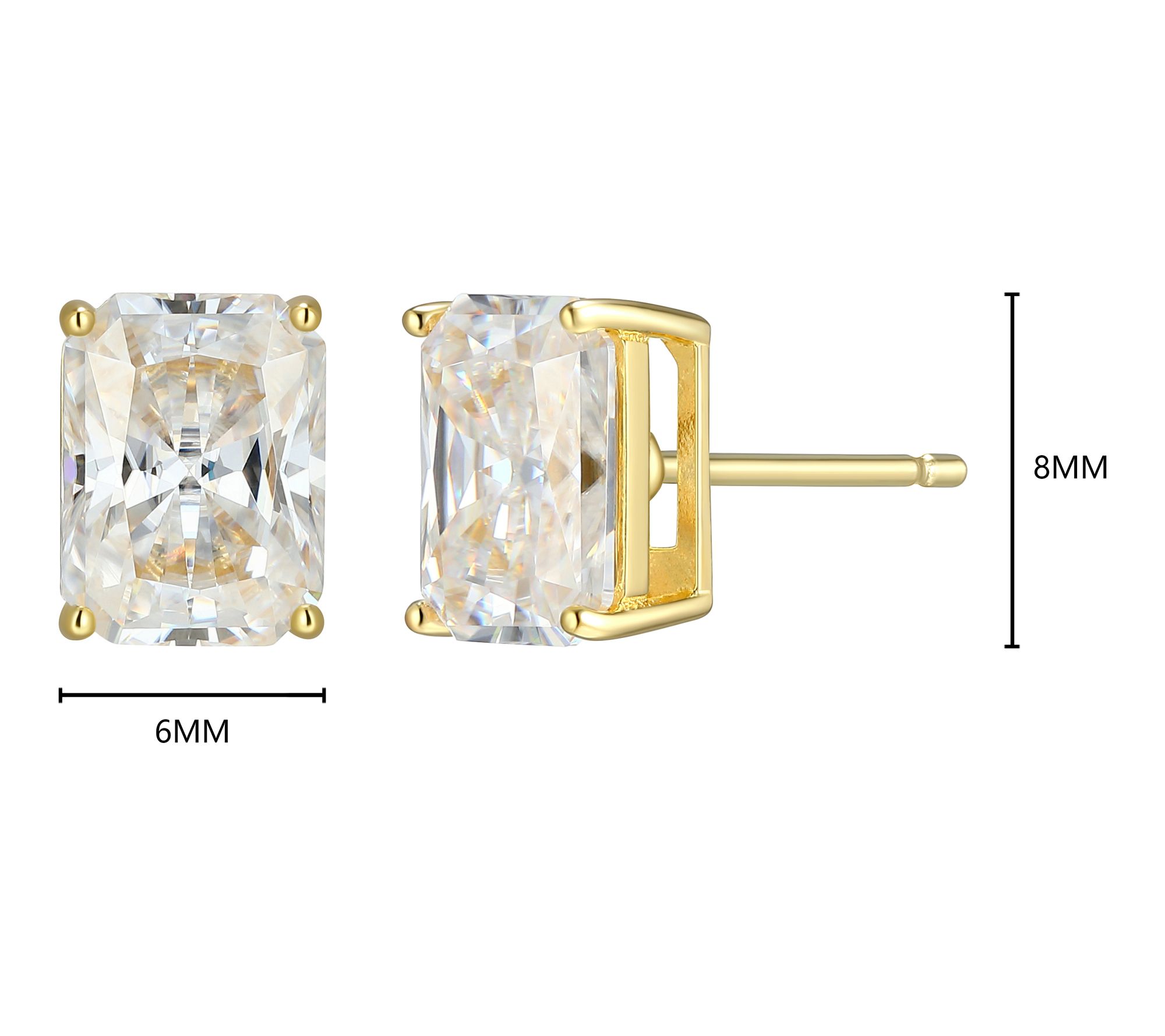 Emerald-cut, lab-grown moissanite stones measure approximately 8mm x 6mm; prong settings