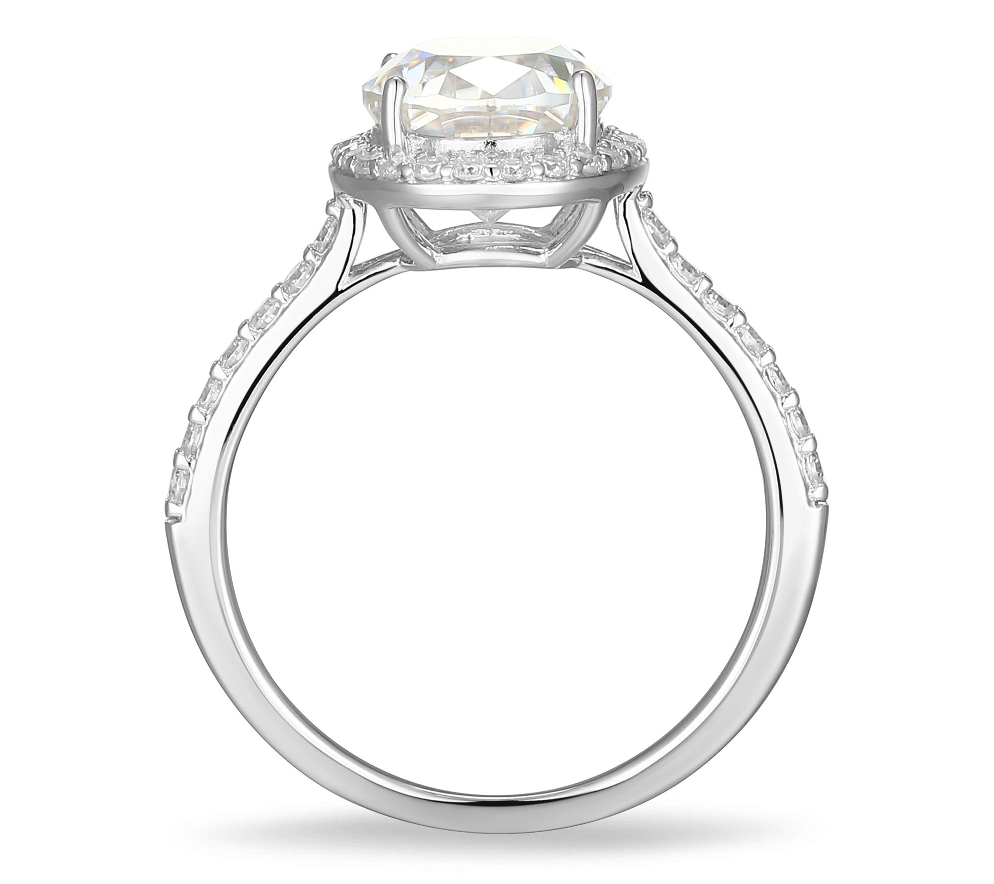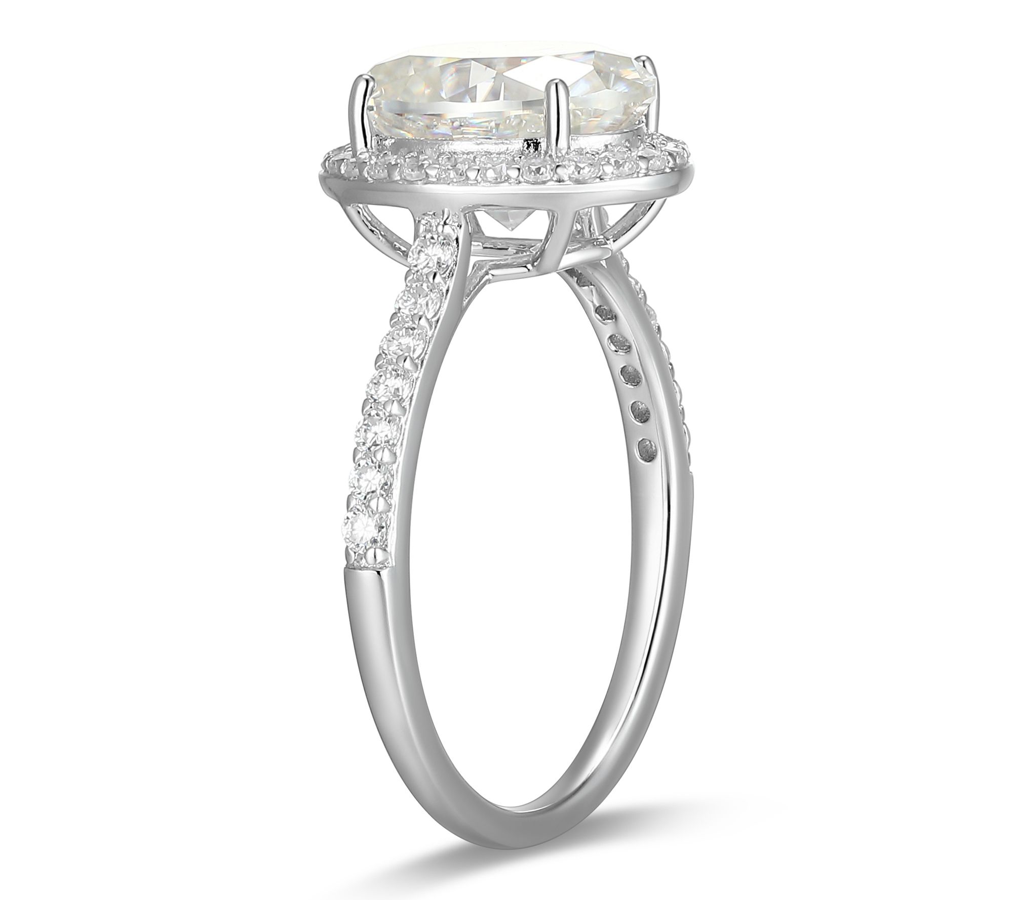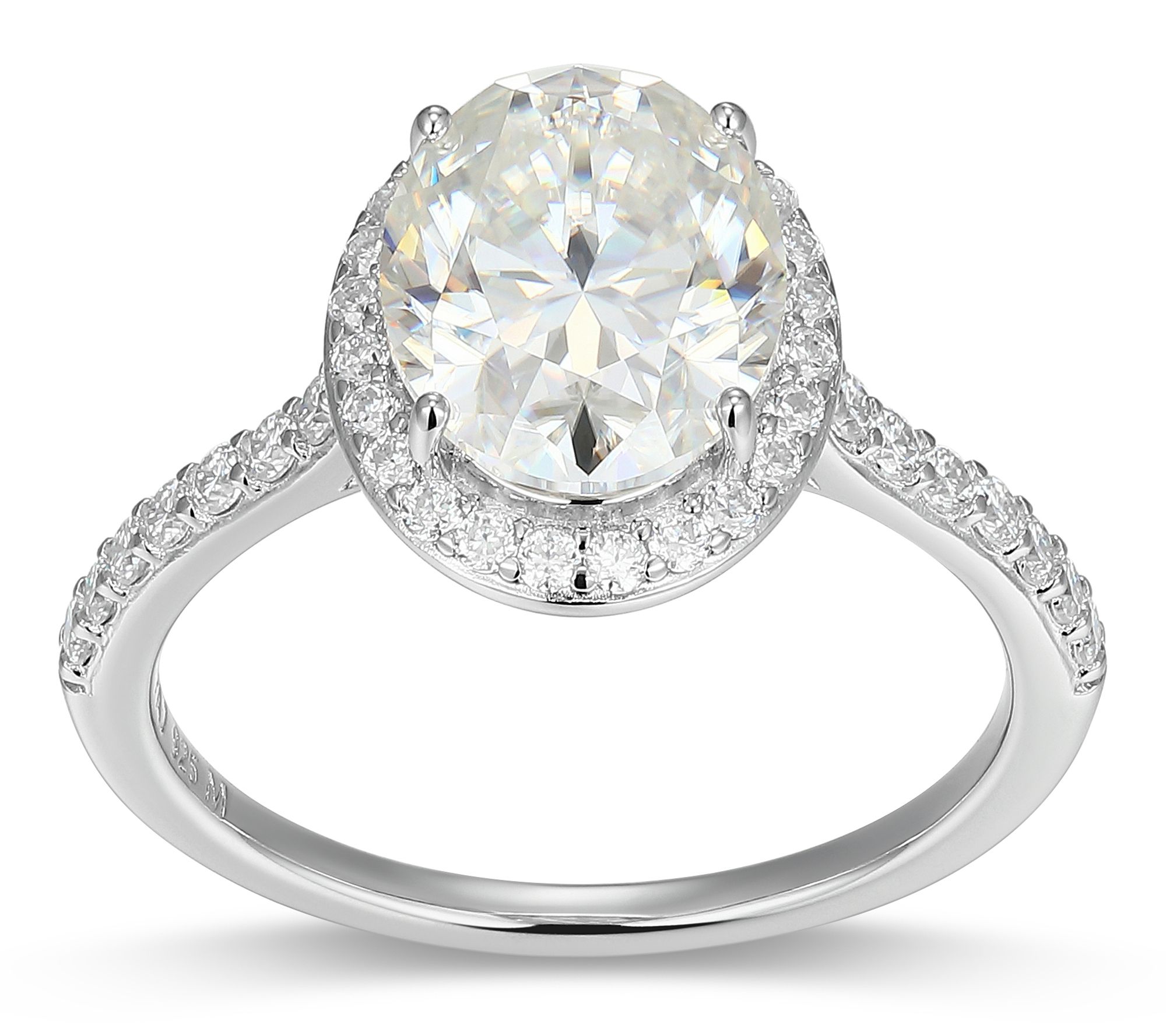 Oval, prong-set lab-grown moissanite with halo and accent stones on band