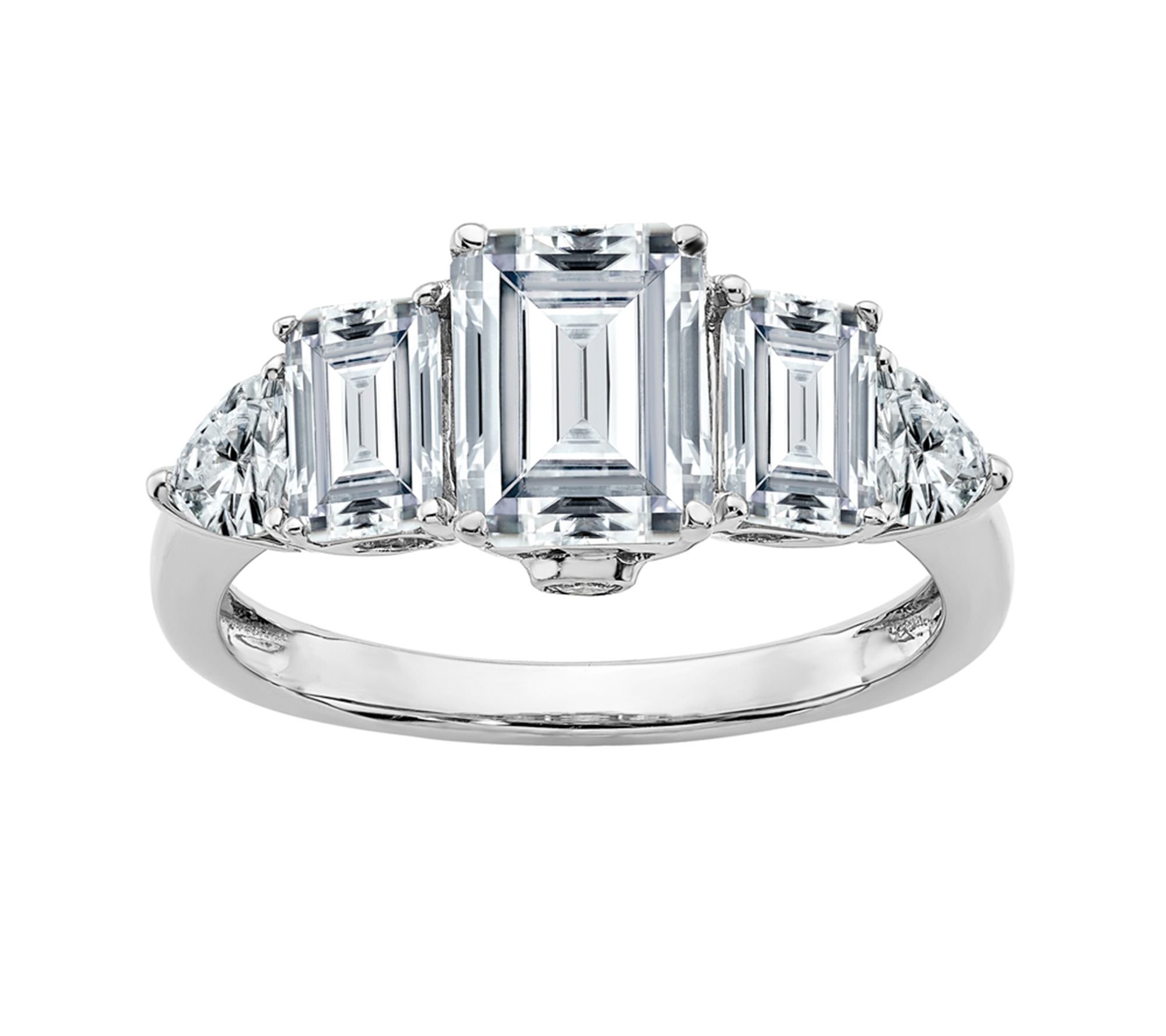 • Three graduated emerald-cut, lab-created moissanite gemstones with a trillion-cut, lab-created moissanite gemstone at each end; bezel-set, round gemstone on face; polished finish