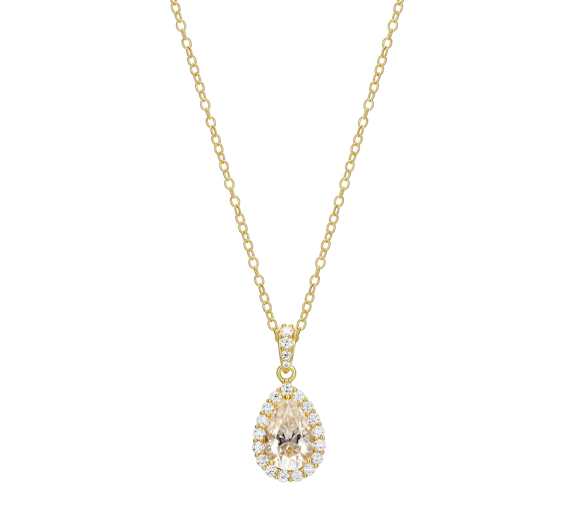 Pear and round lab-grown moissanite stone pendant; prong and pave settings; halo pendant style; cable link chain