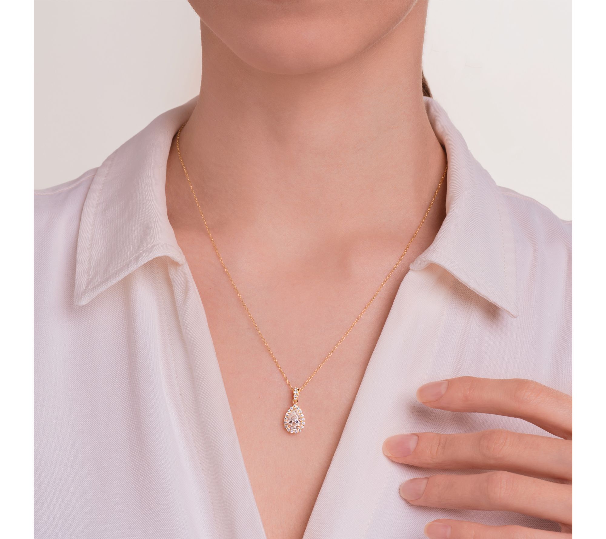Shimmering with a pear-shaped lab-grown moissanite surrounded by a halo of round stones, this halo necklace brings elegant sparkle to every occasion. Whether dressing up for a dinner date or adding a radiant accent to a daytime outfit, the pendant offers a sophisticated way to stand out.