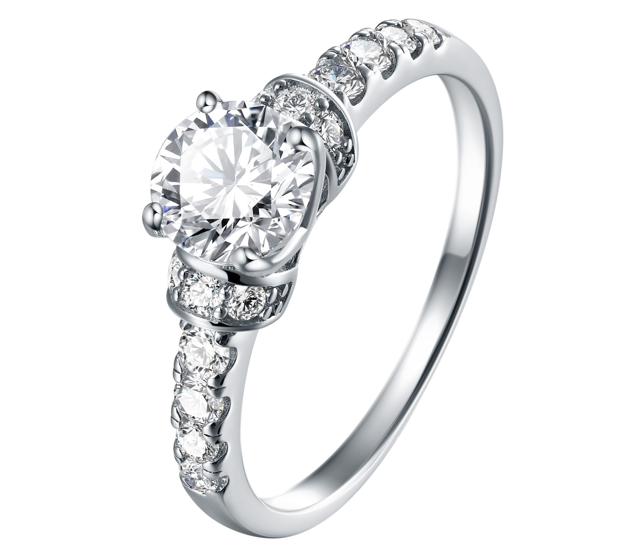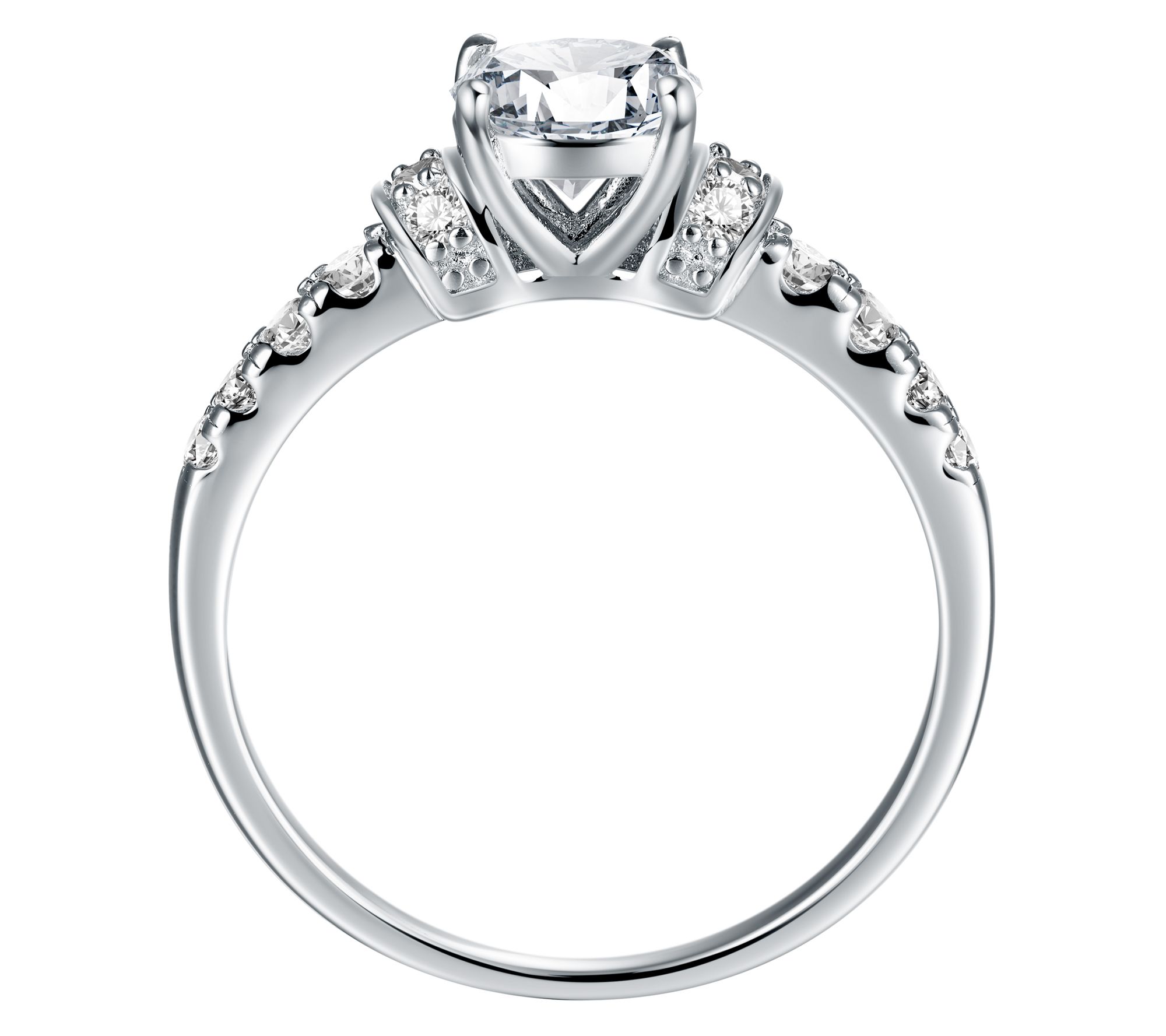 Celebrate your commitment with this exquisite engagement ring. Set in lustrous rhodium-plated sterling silver, the ring features multi-sized round-cut lab-created moissanite stones. Each prong-set gem sparkles with a total carat weight of approximately 0.95, which has a diamond equivalent weight of about 1.15 carats â perfect for adding a touch of elegance to your special moment. From Moissanite Luxe.