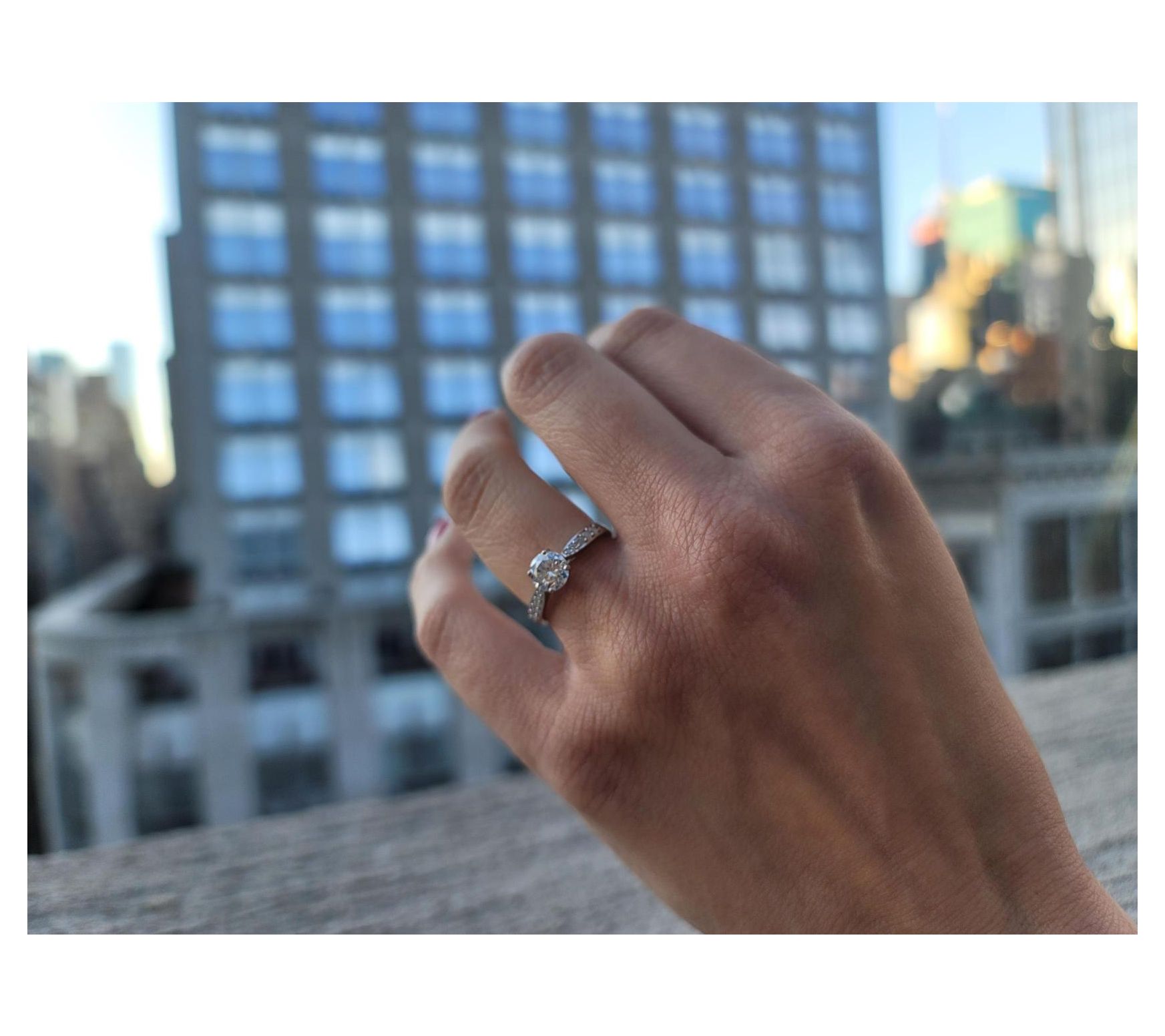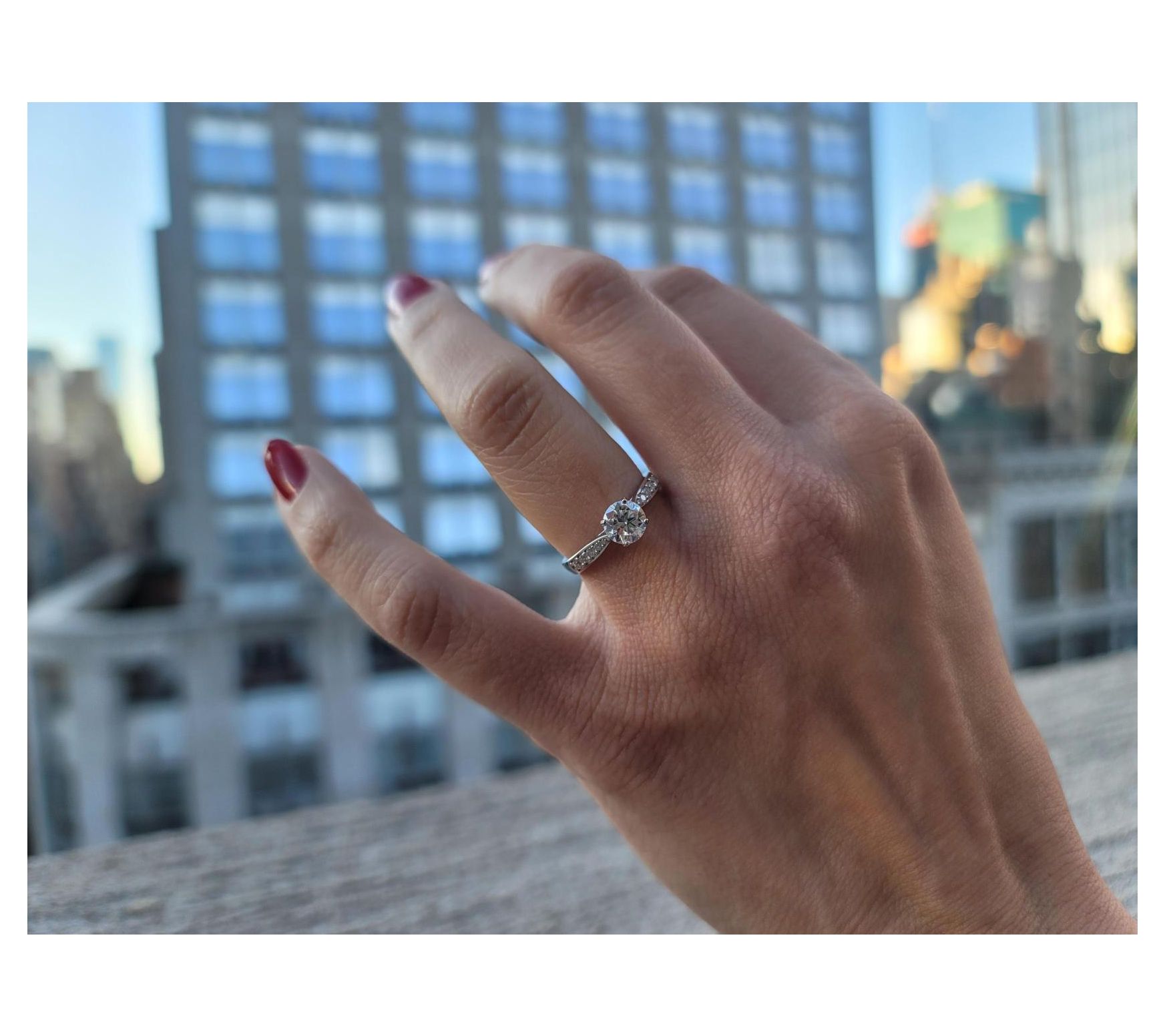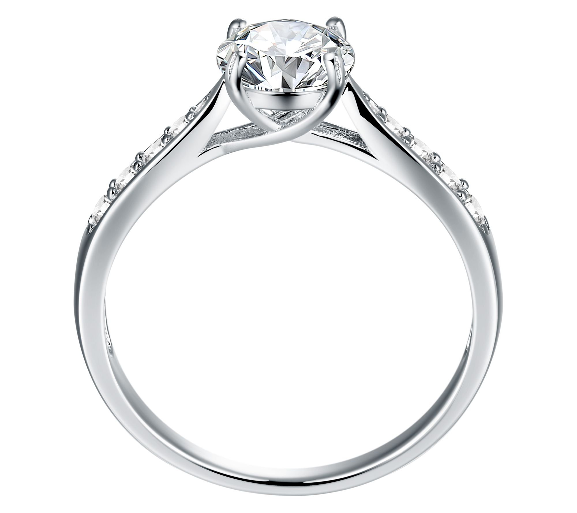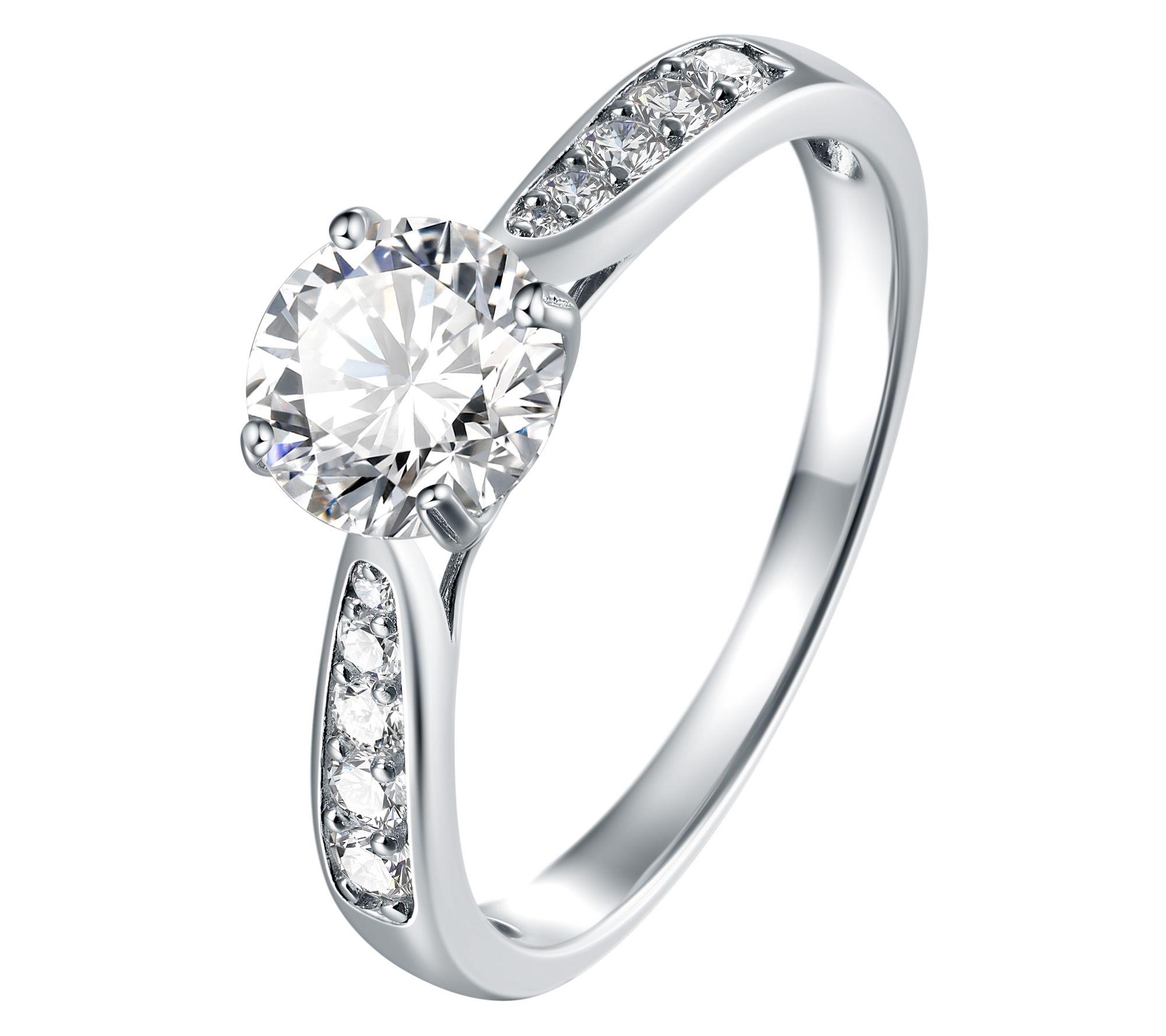 Brighten your jewelry collection with this dazzling created moissanite ring. The prong-set, round-cut center stone is beautifully accented by additional stones, creating an exquisite sparkle.