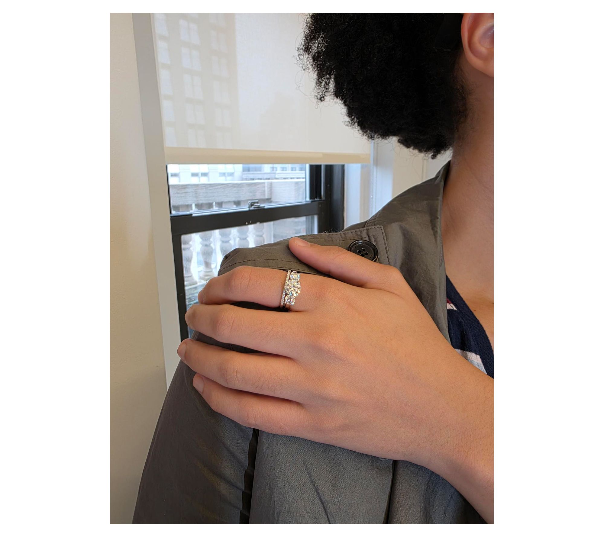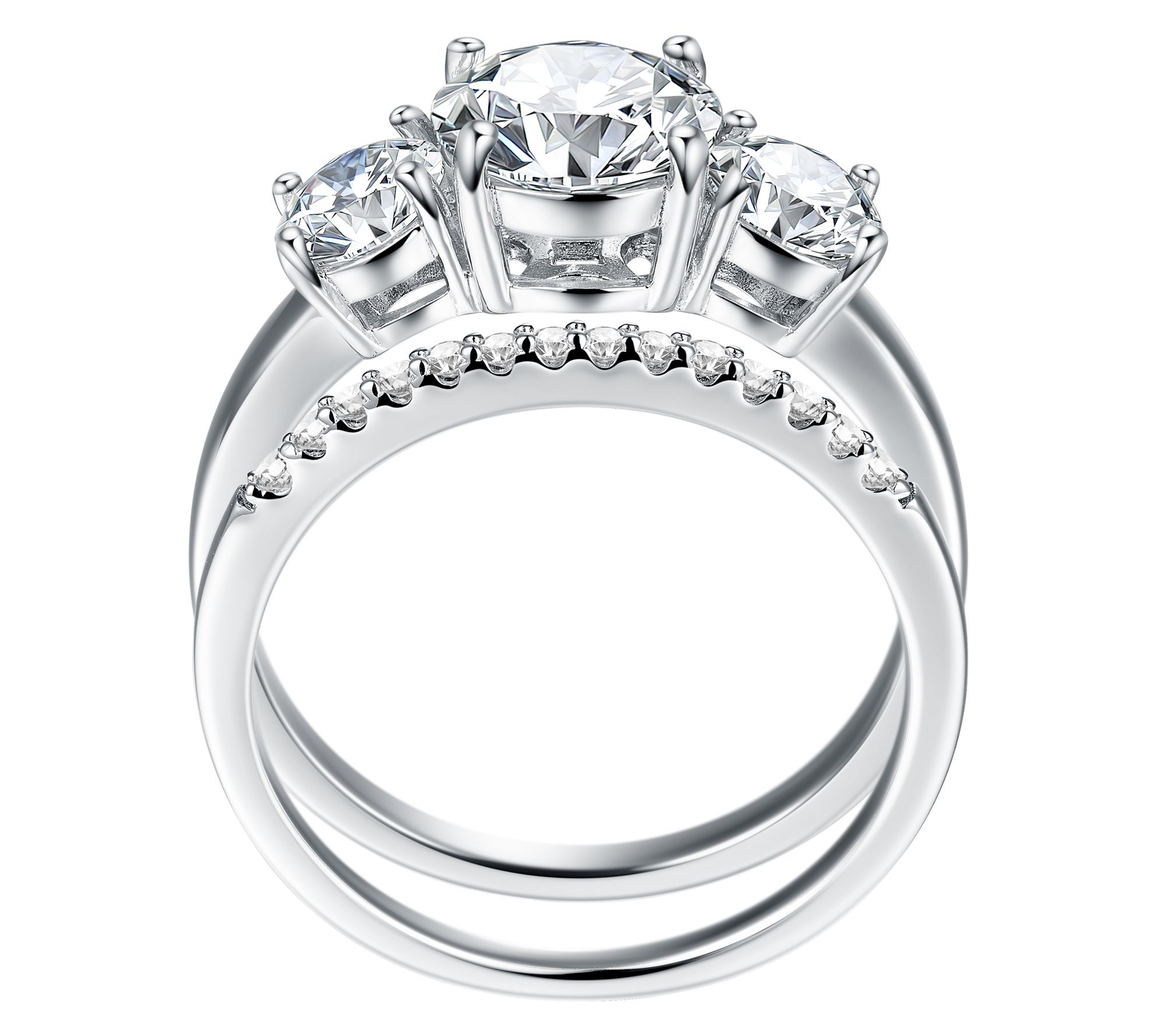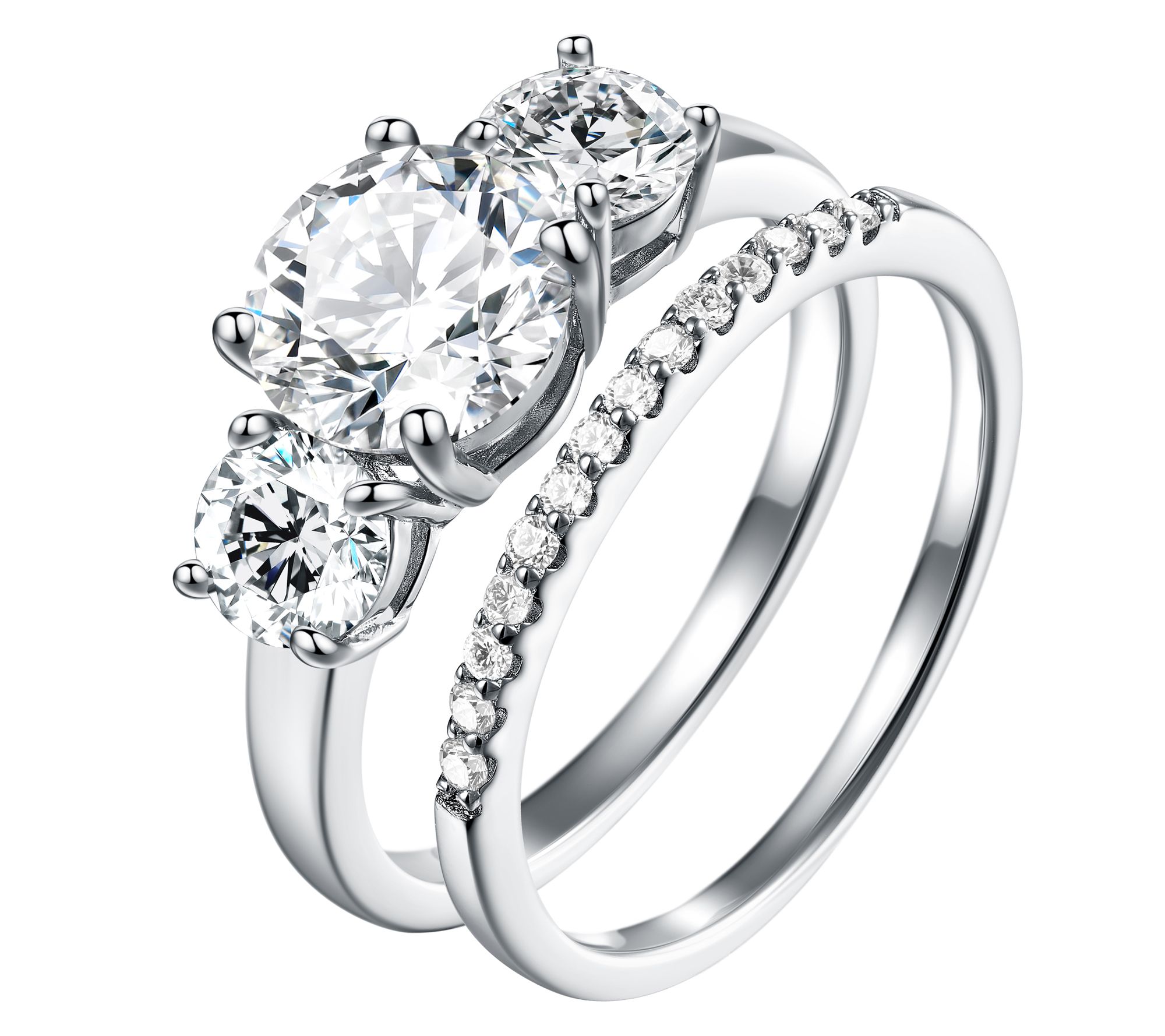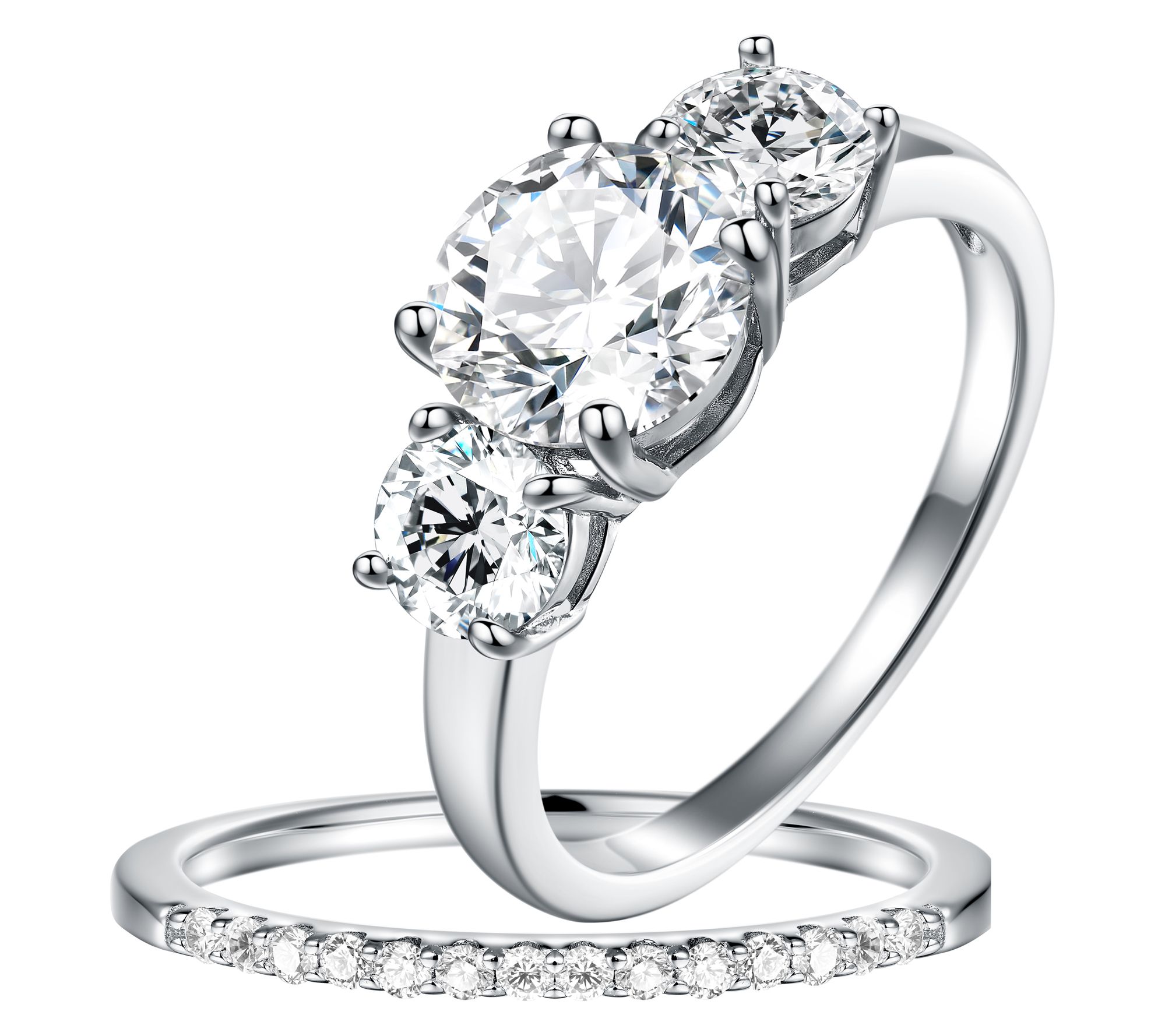 Round-cut, prong-set moissanite; three-stone ring and eternity band design