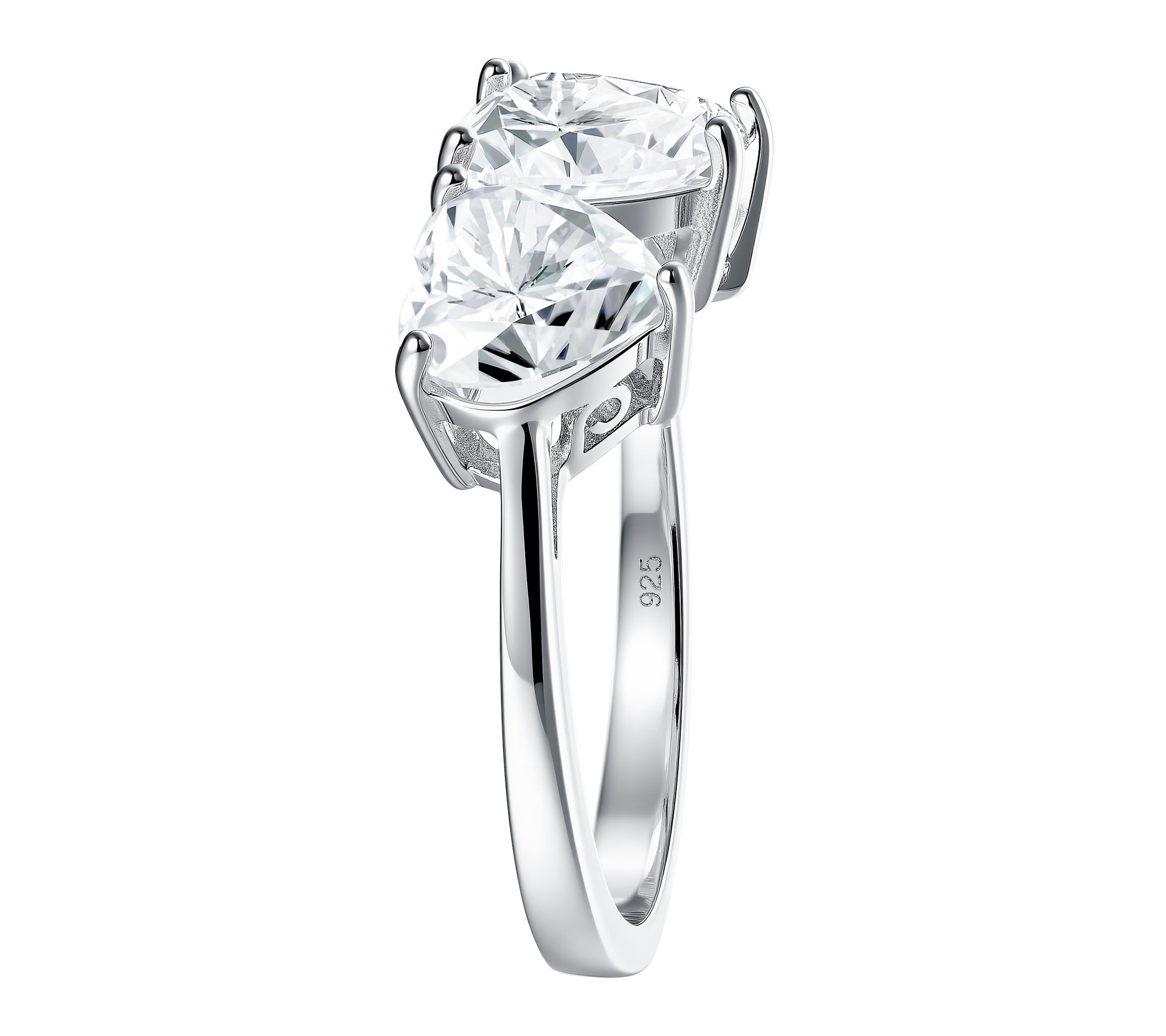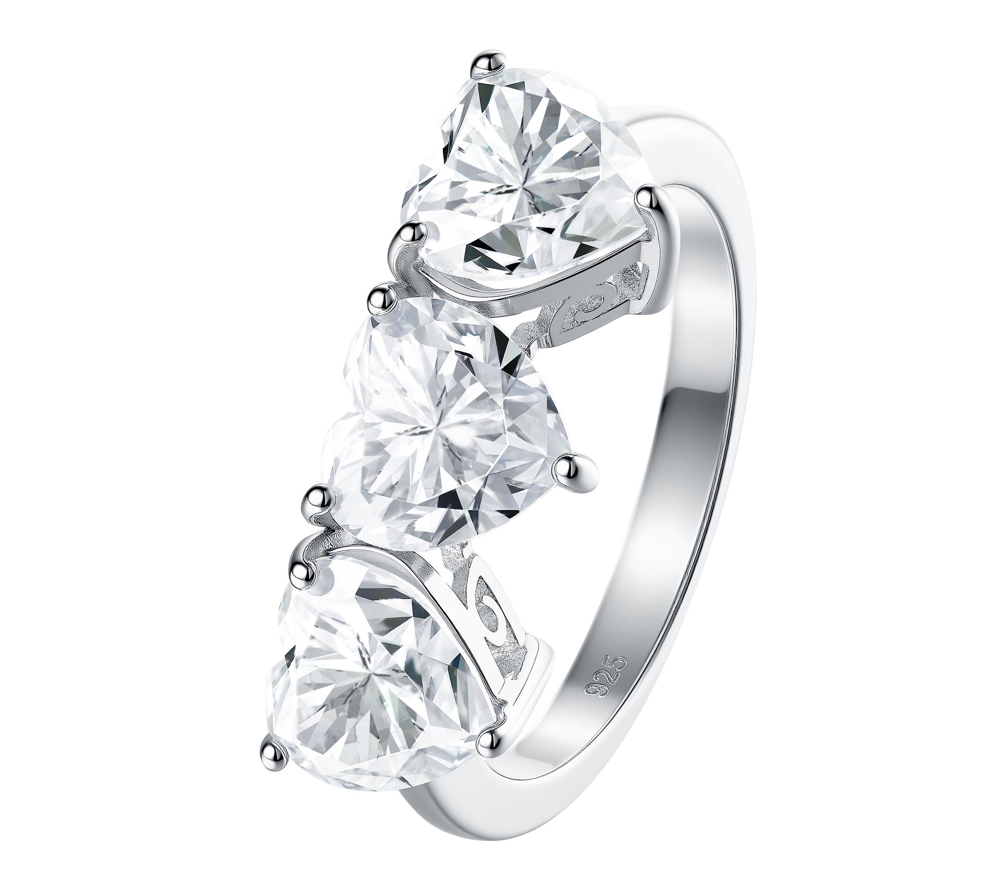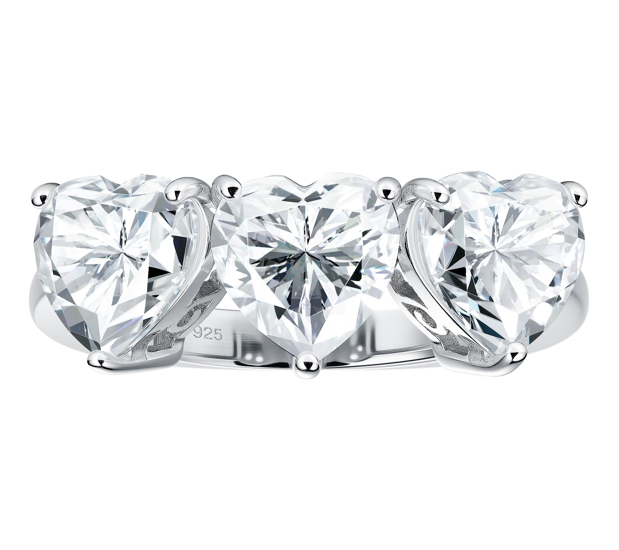 Three heart-cut, prong-set lab-grown moissanite gemstones
