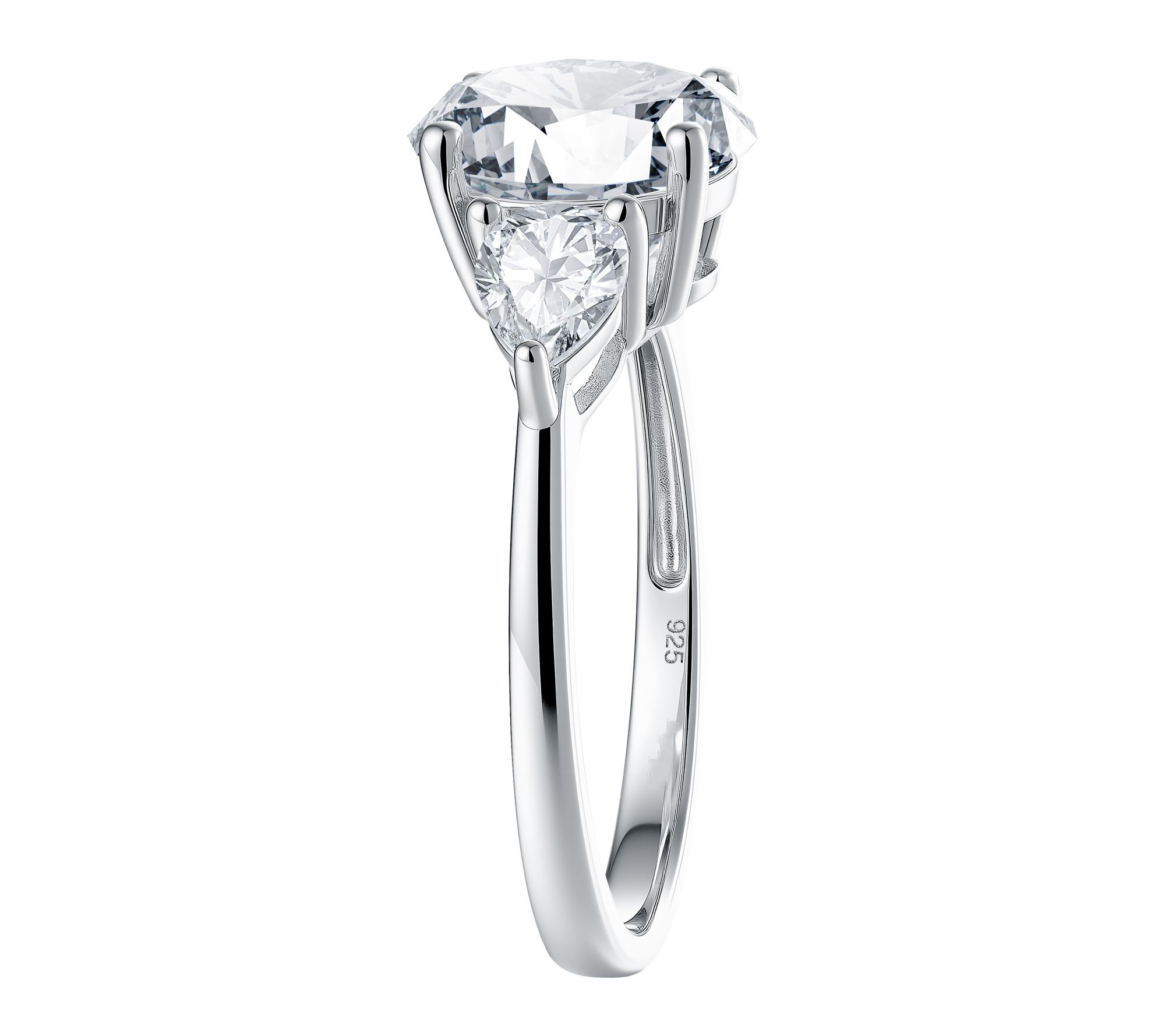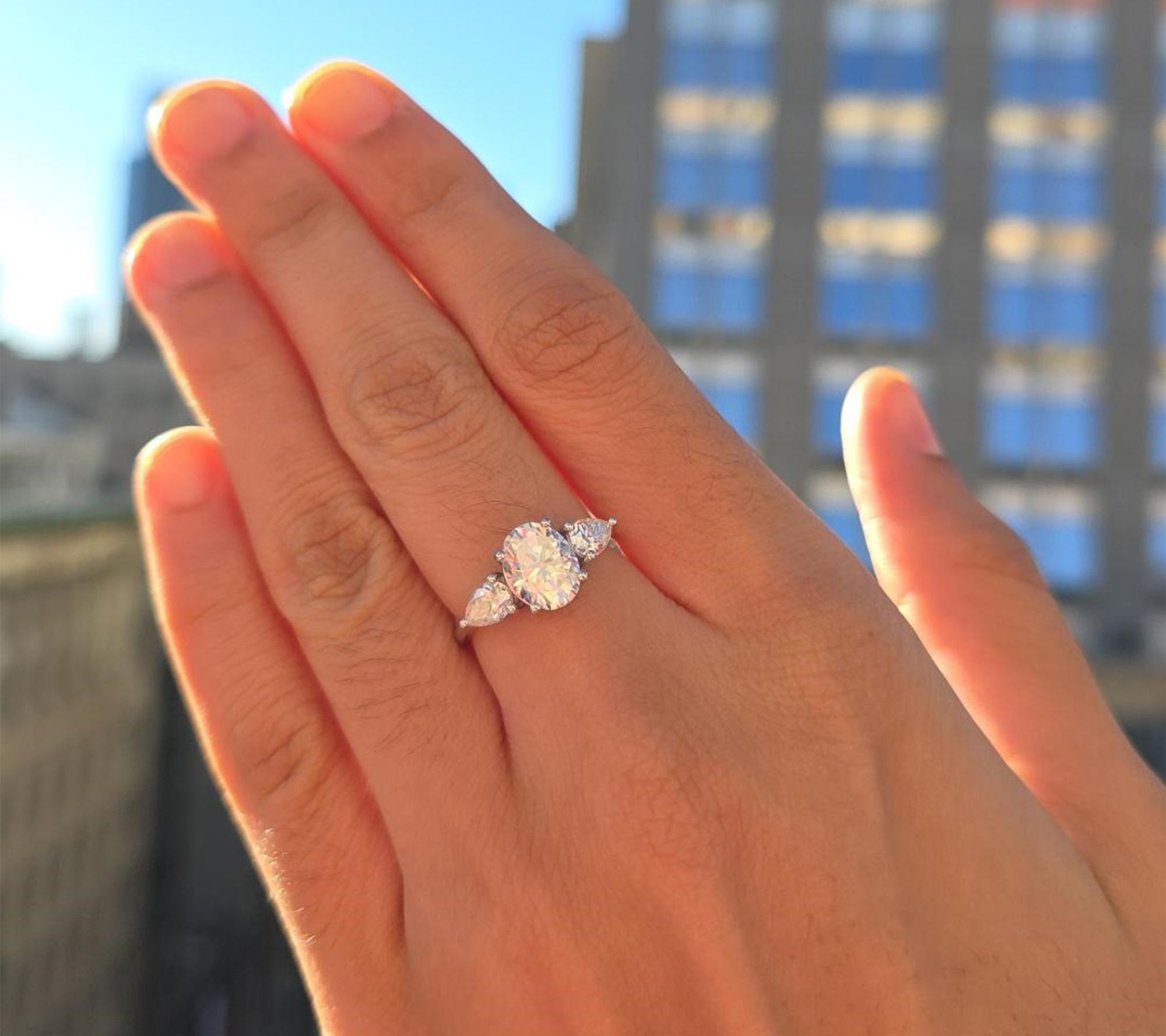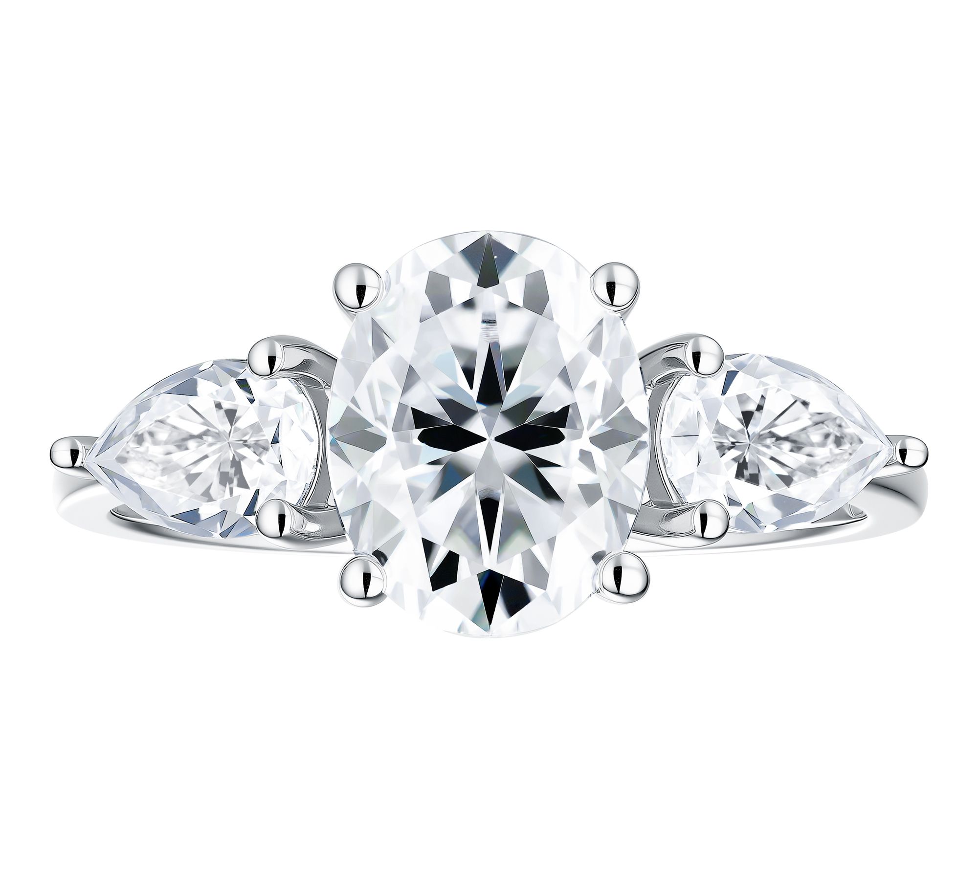 Prong-set oval- and pear-cut lab-grown moissanite; three-stone design; polished finish