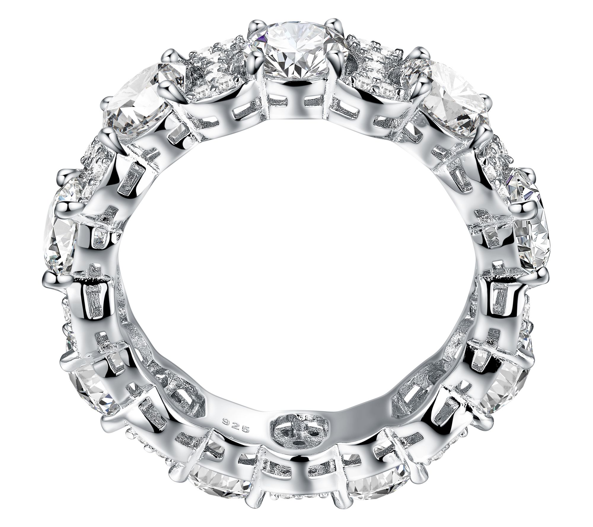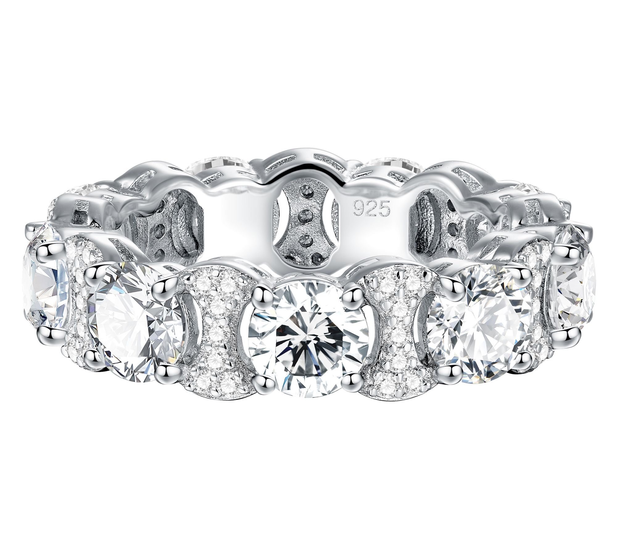 Round-cut, prong- and pave-set lab-created moissanite; eternity band design; polished finish