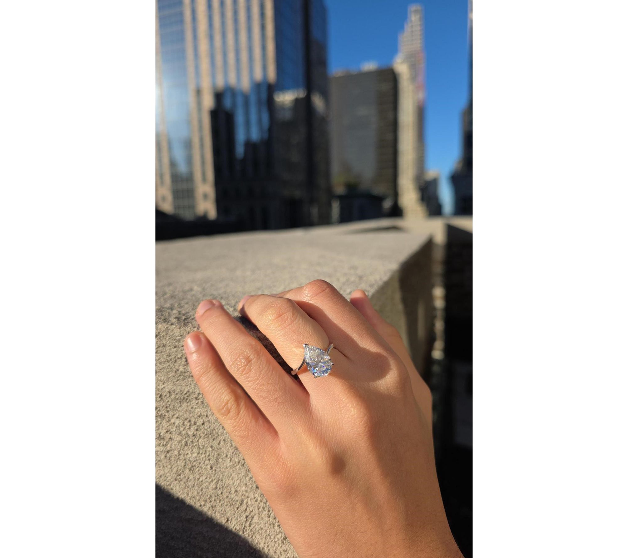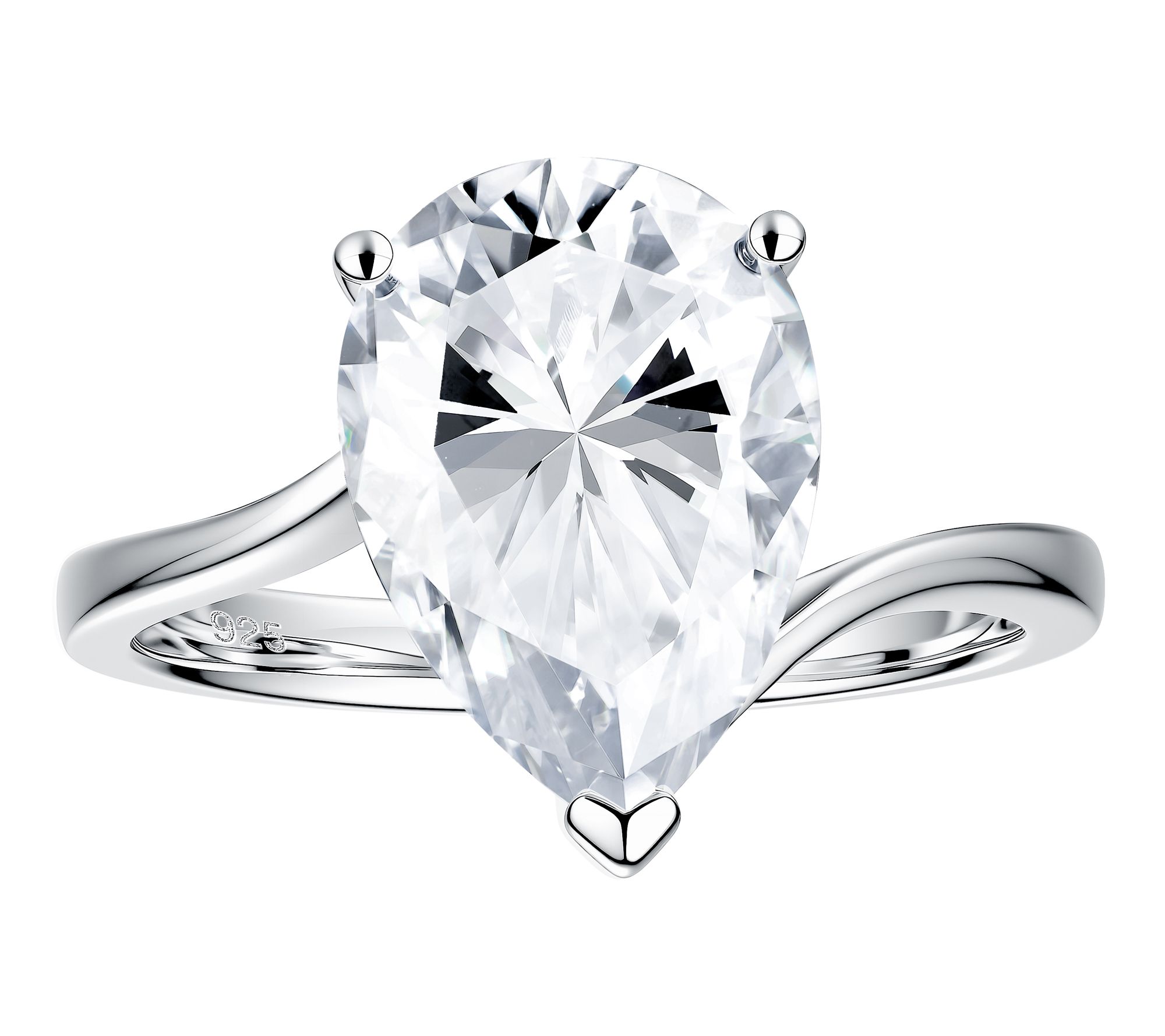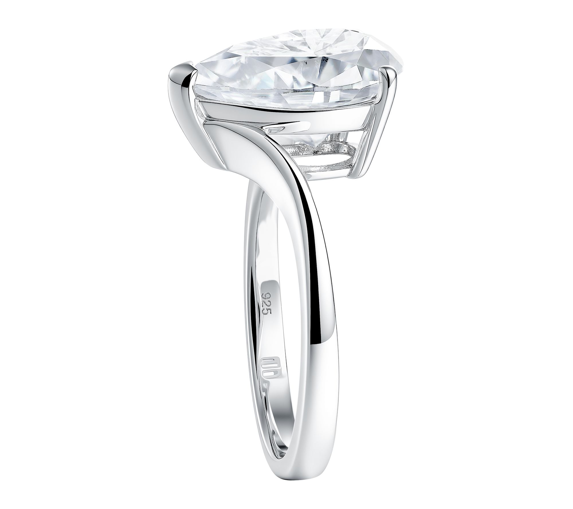 • Pear-cut, prong-set lab-grown moissanite; bypass design; polished finish