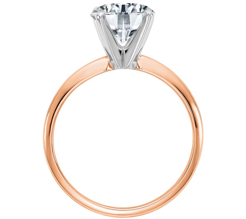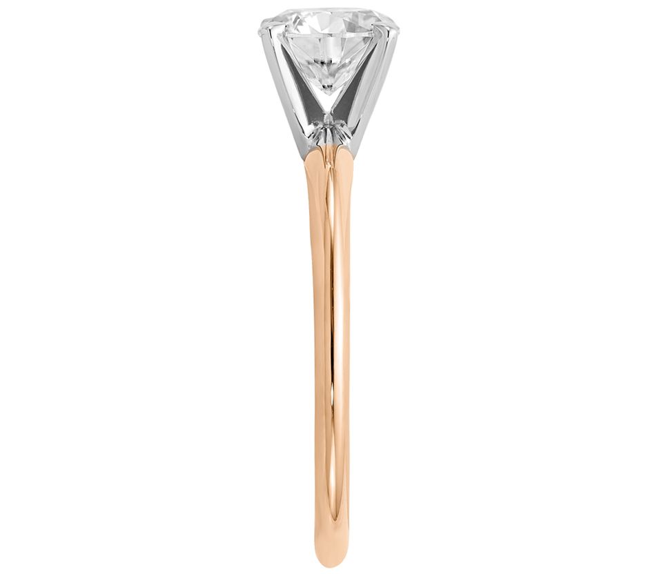 - Two-tone design; round lab-created moissanite in 14K white gold prongs set on thin 14K rose gold band
