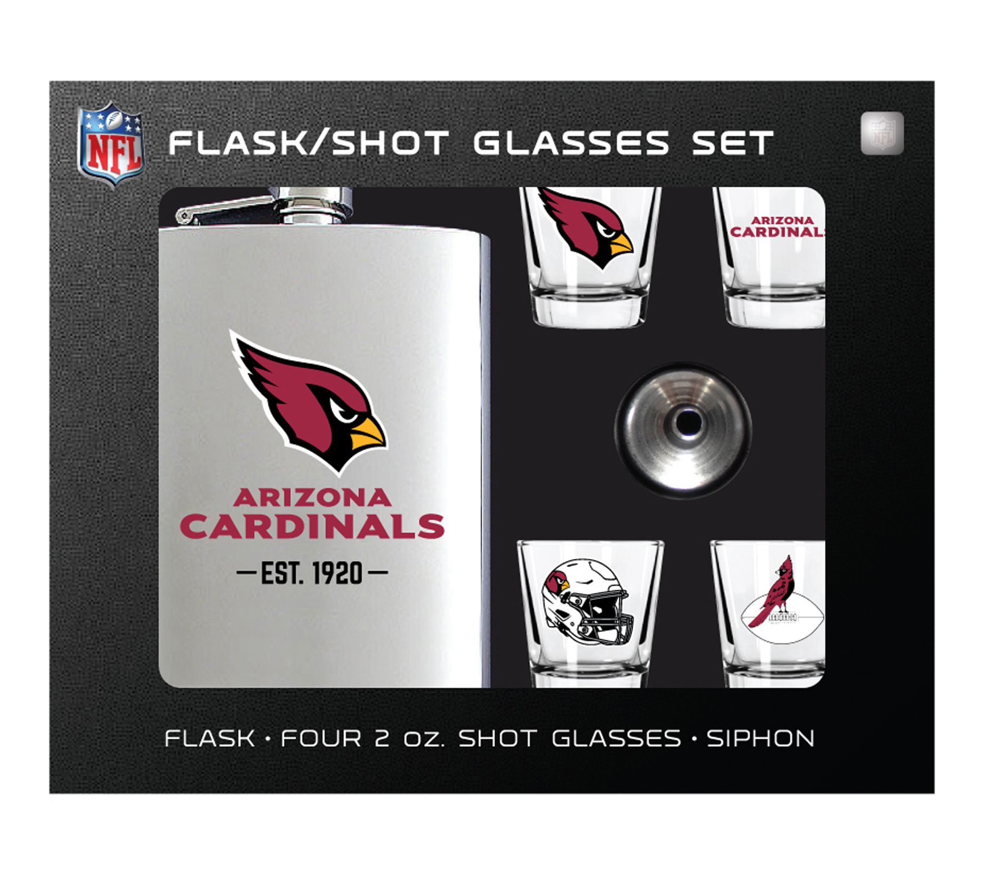 Cheer on your favorite team while celebrating with friends using this NFL flask set. Share game day excitement or toast to victories with the coordinating flask and four shot glasses, each sporting bold logos that show off your team spirit in style. From Mojo Licensing.
