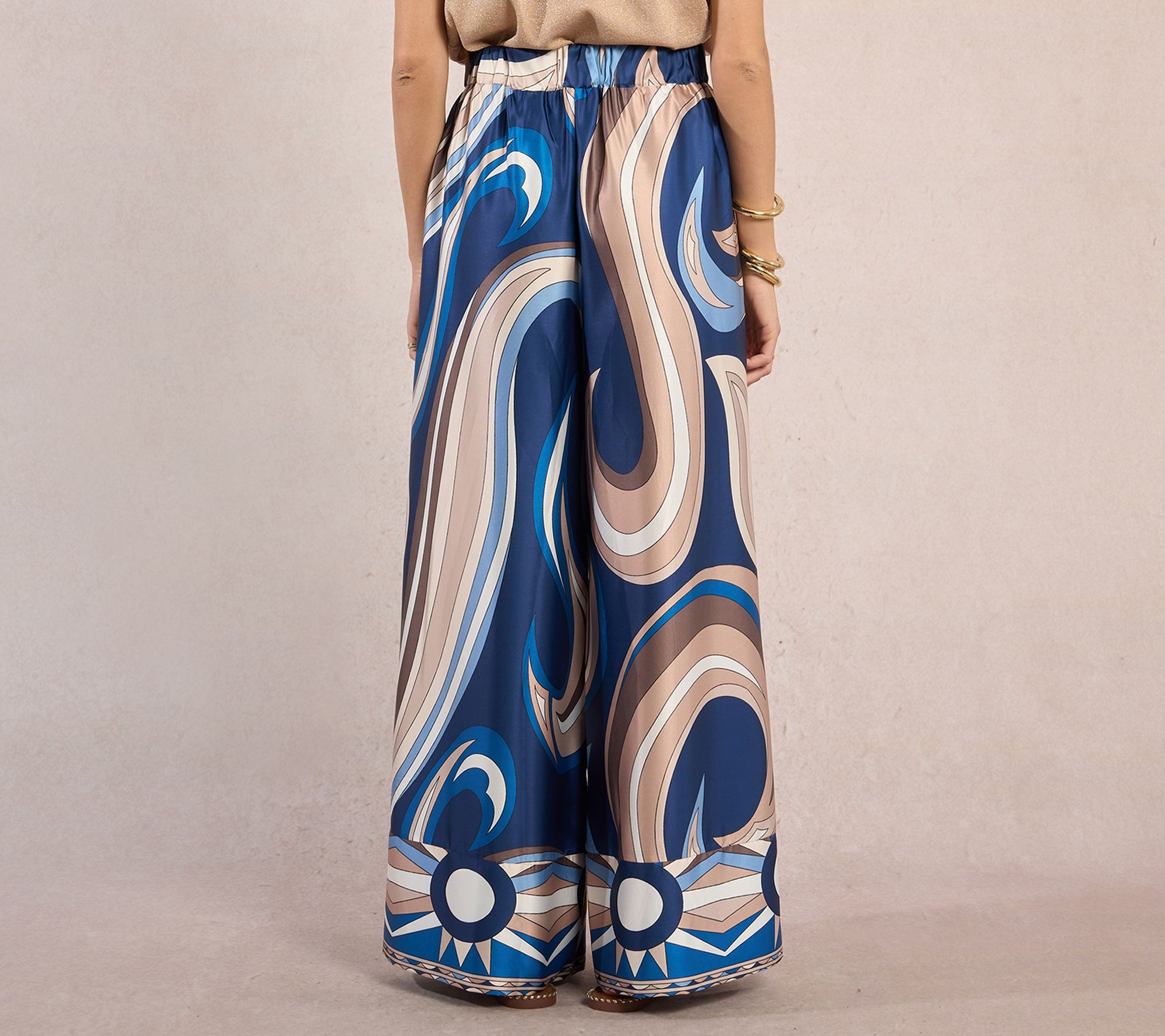 Transition from brunch with friends to an art gallery stroll in these abstract wide-leg pants, blending effortless comfort with eye-catching style. The elastic waistband and flowy silhouette create a laid-back yet chic look -- pair them with a simple top or go bold with the matching piece for standout appeal. From Molly Bracken.