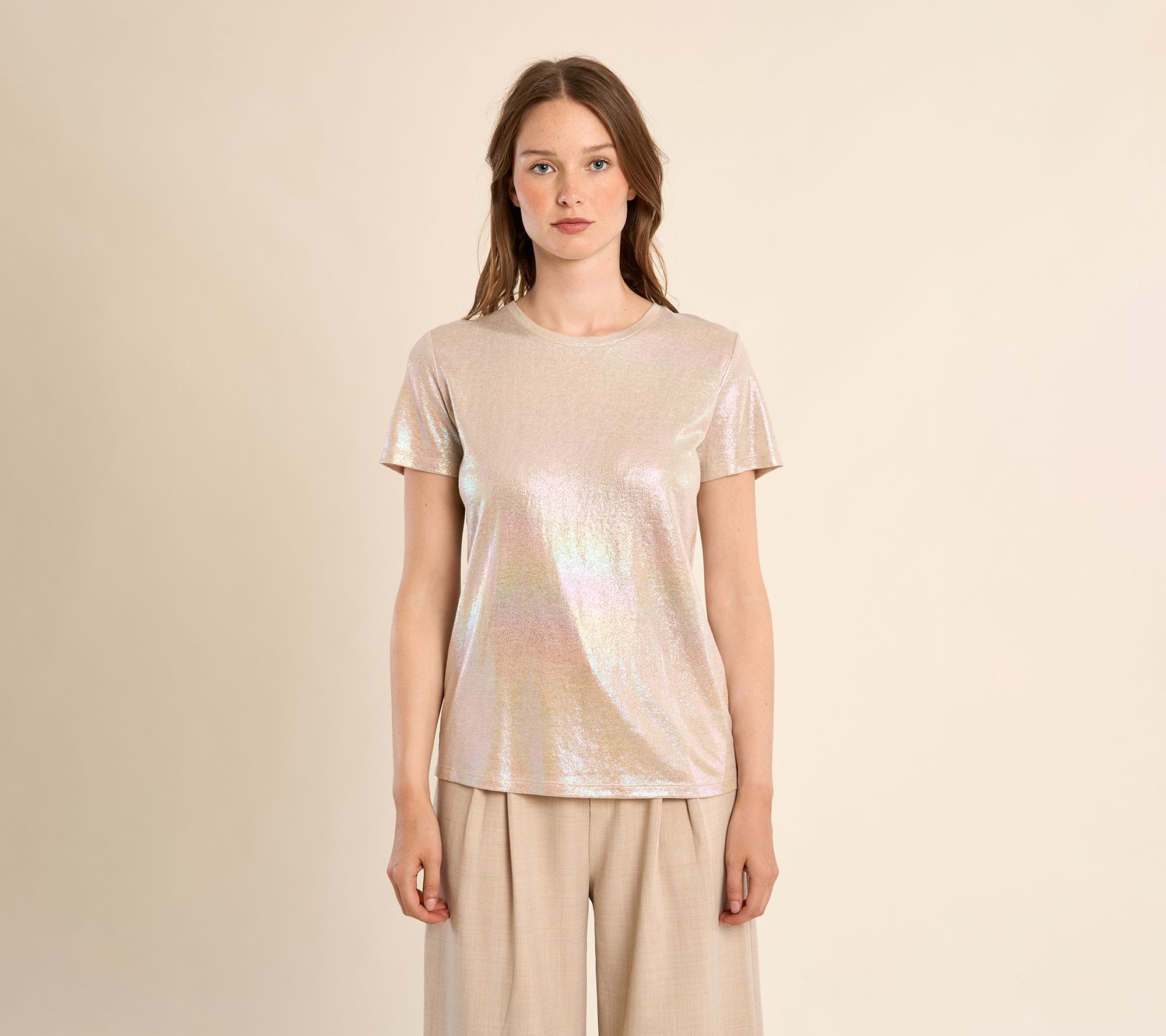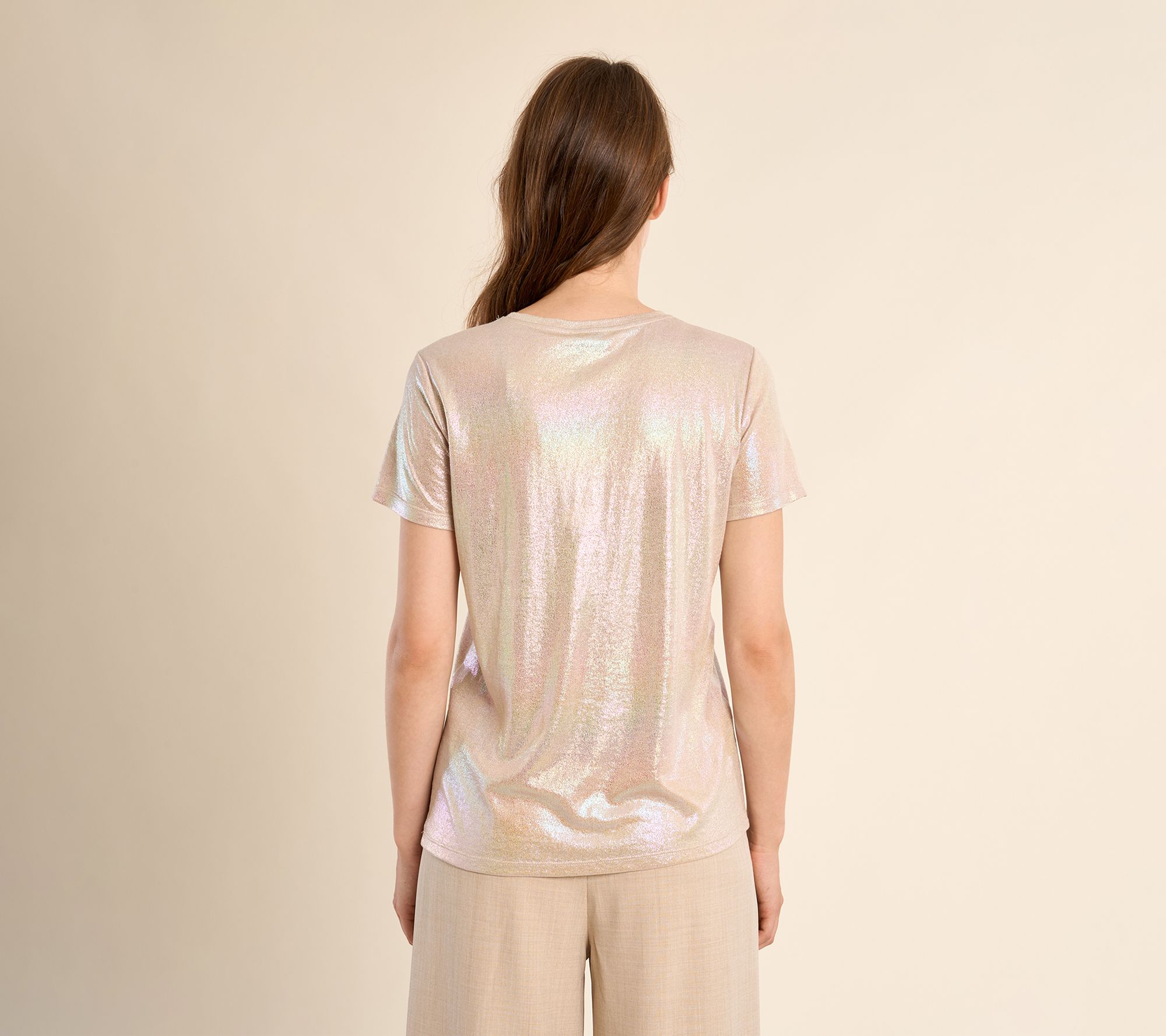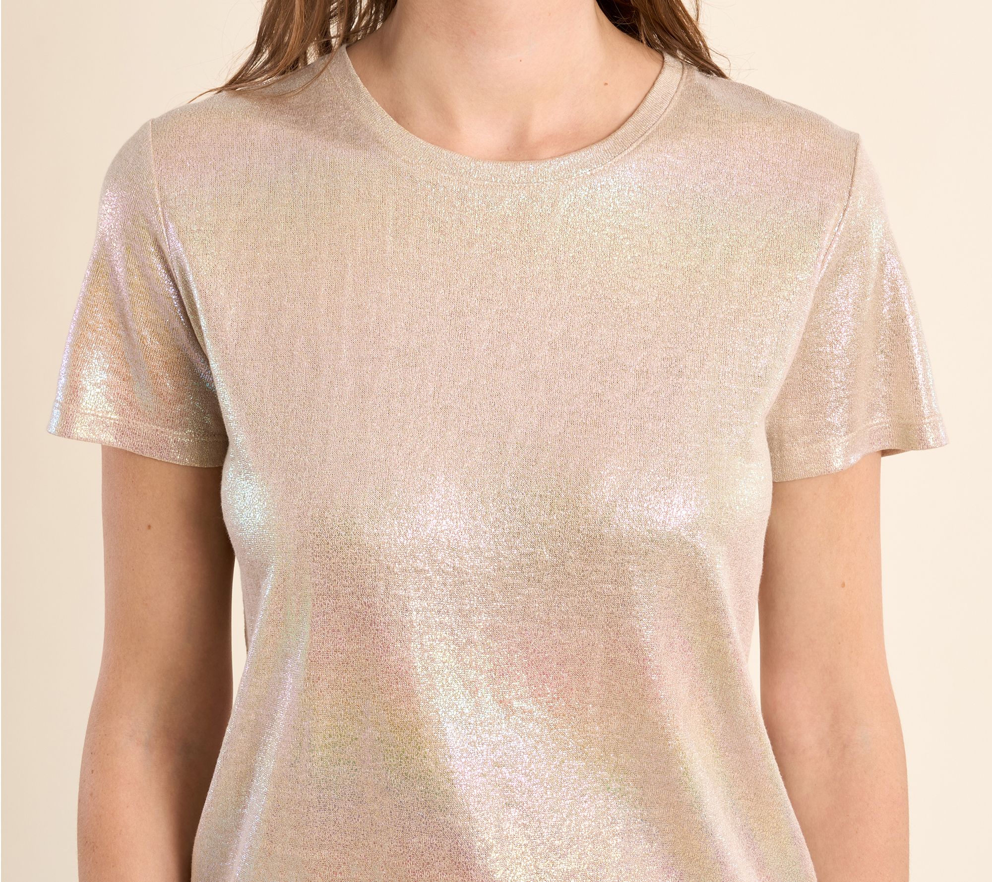 Add a little shine to your everyday with this metallic-coated tee -- its relaxed fit easily pairs with jeans for weekend brunch or layers under a blazer for evening plans. Lightweight knit and soft texture make it a go-to for spring and summer adventures. From Molly Bracken.