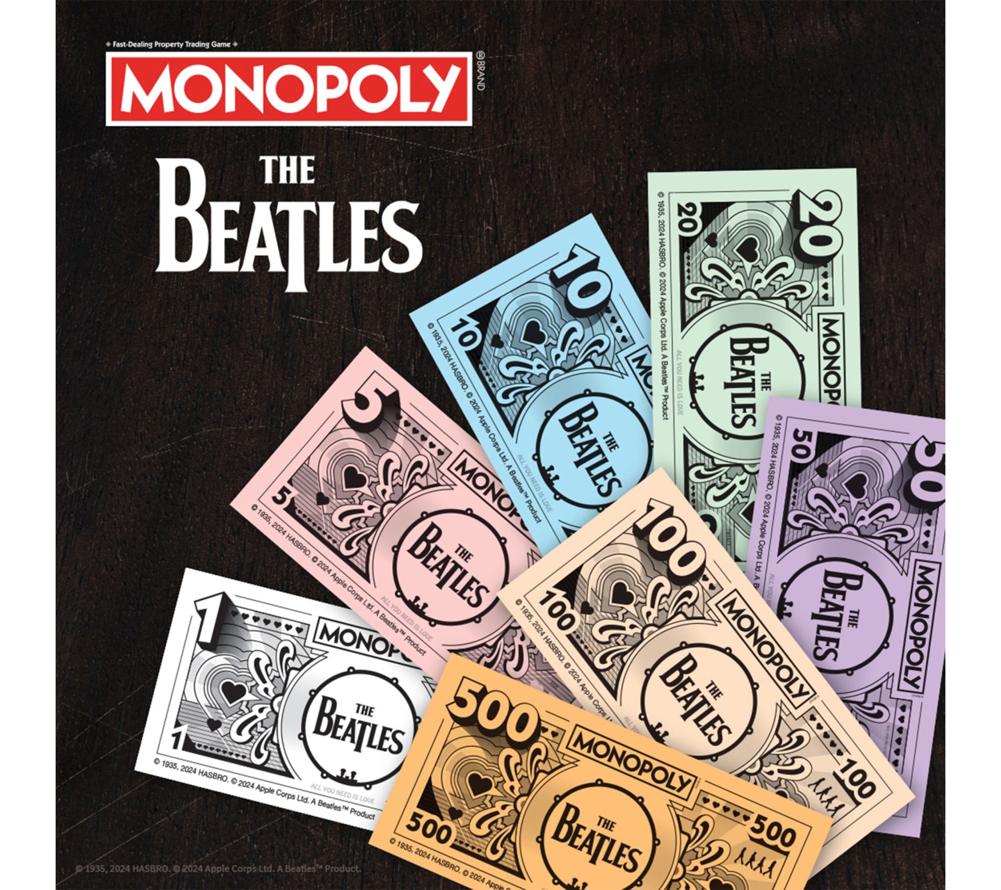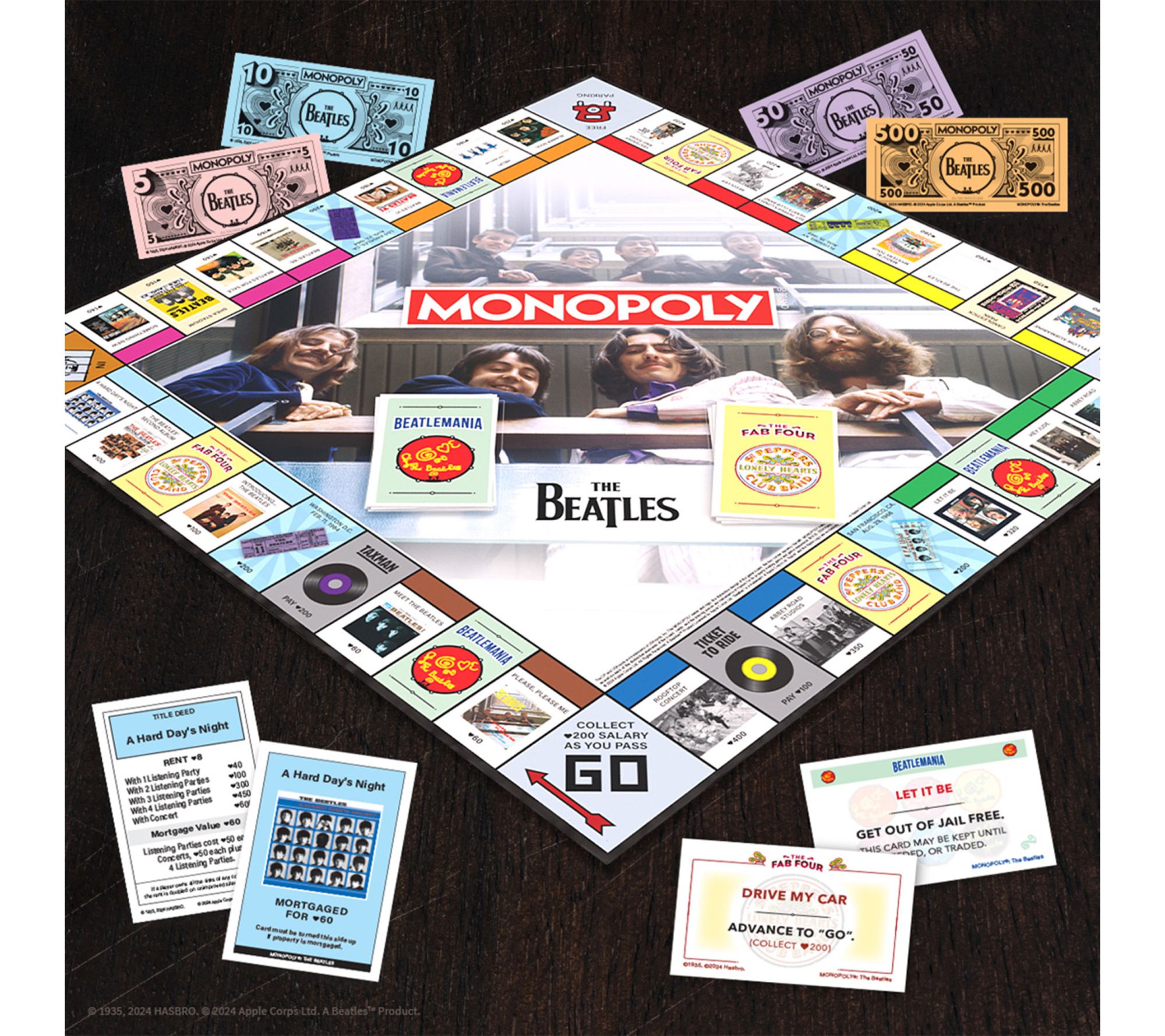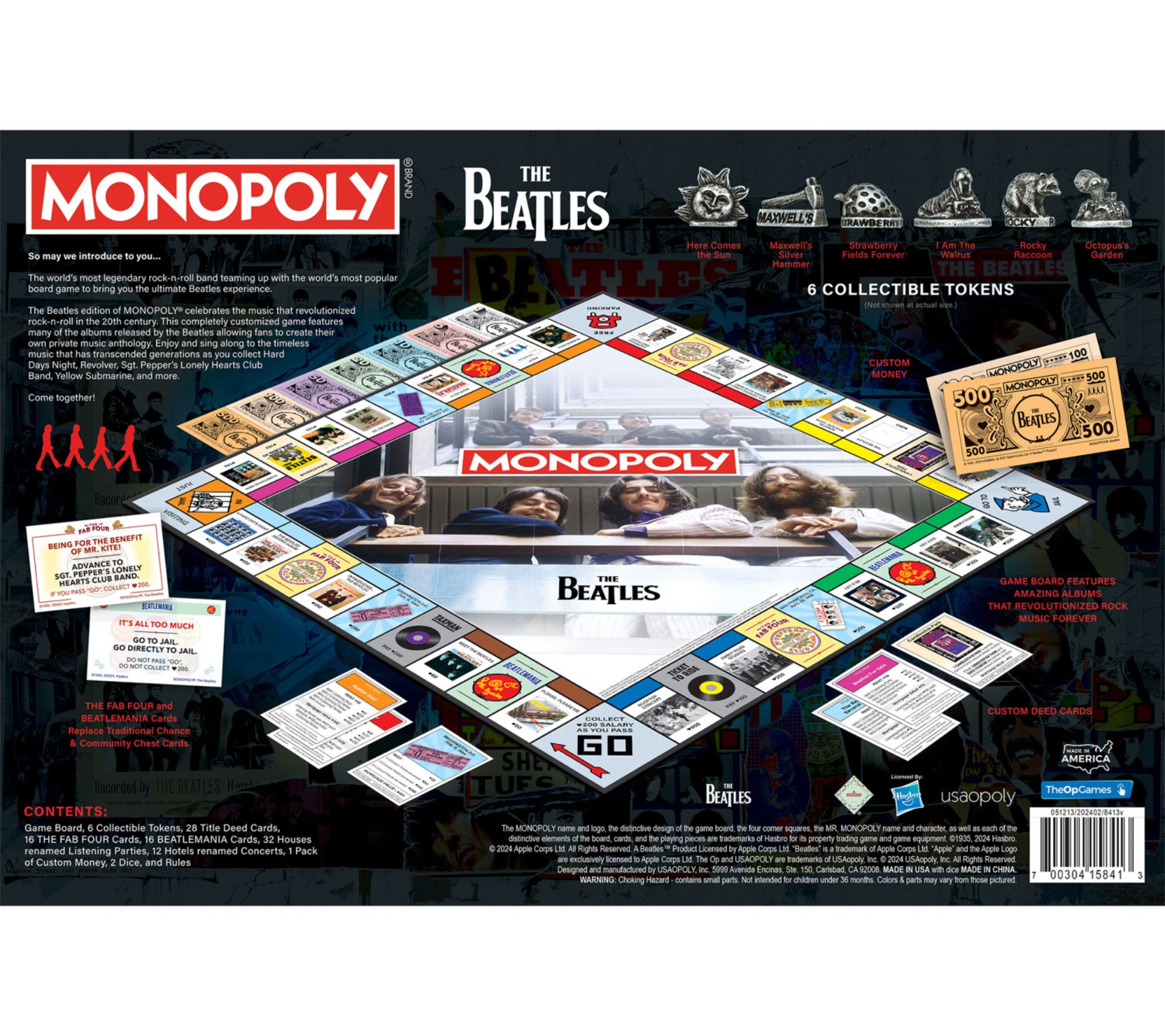 • Includes The Beatles Monopoly Game Board, six collectible tokens, 28 title deed cards (featuring albums and concerts), 16 The Fab Four cards, 16 Beatlemania cards, custom The Beatles Monopoly money, 32 houses (renamed listening parties), 12 hotels (renamed concerts), and rules