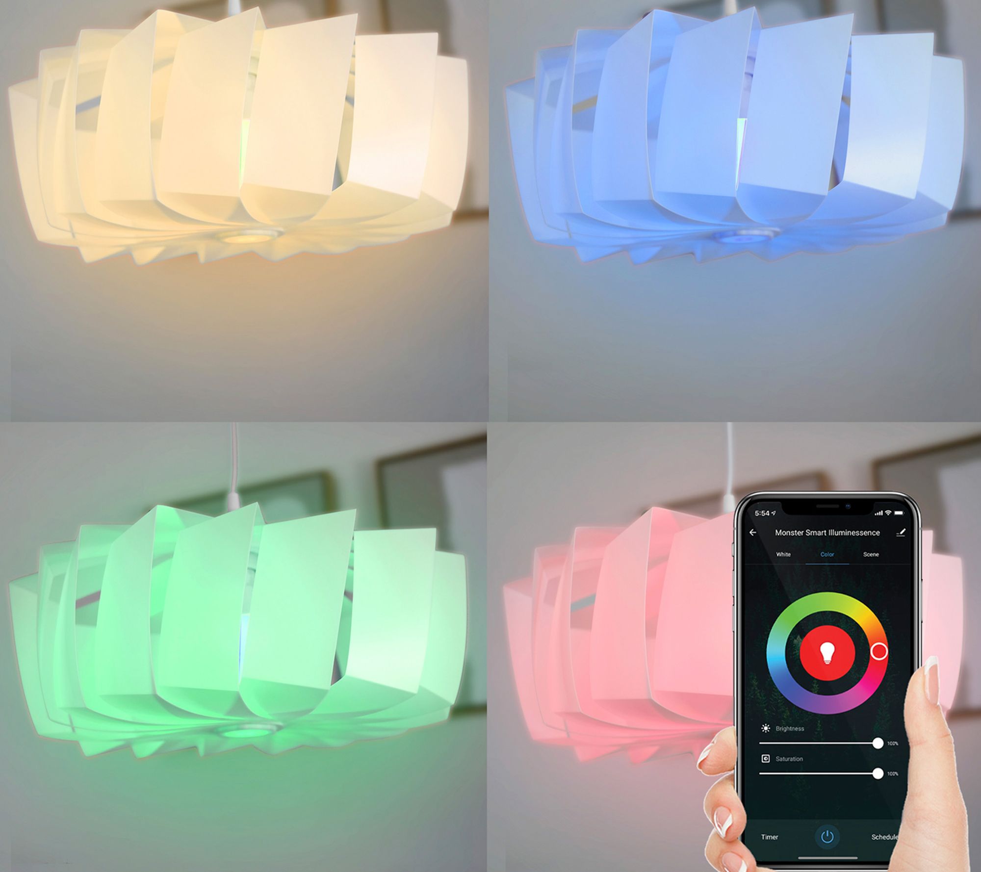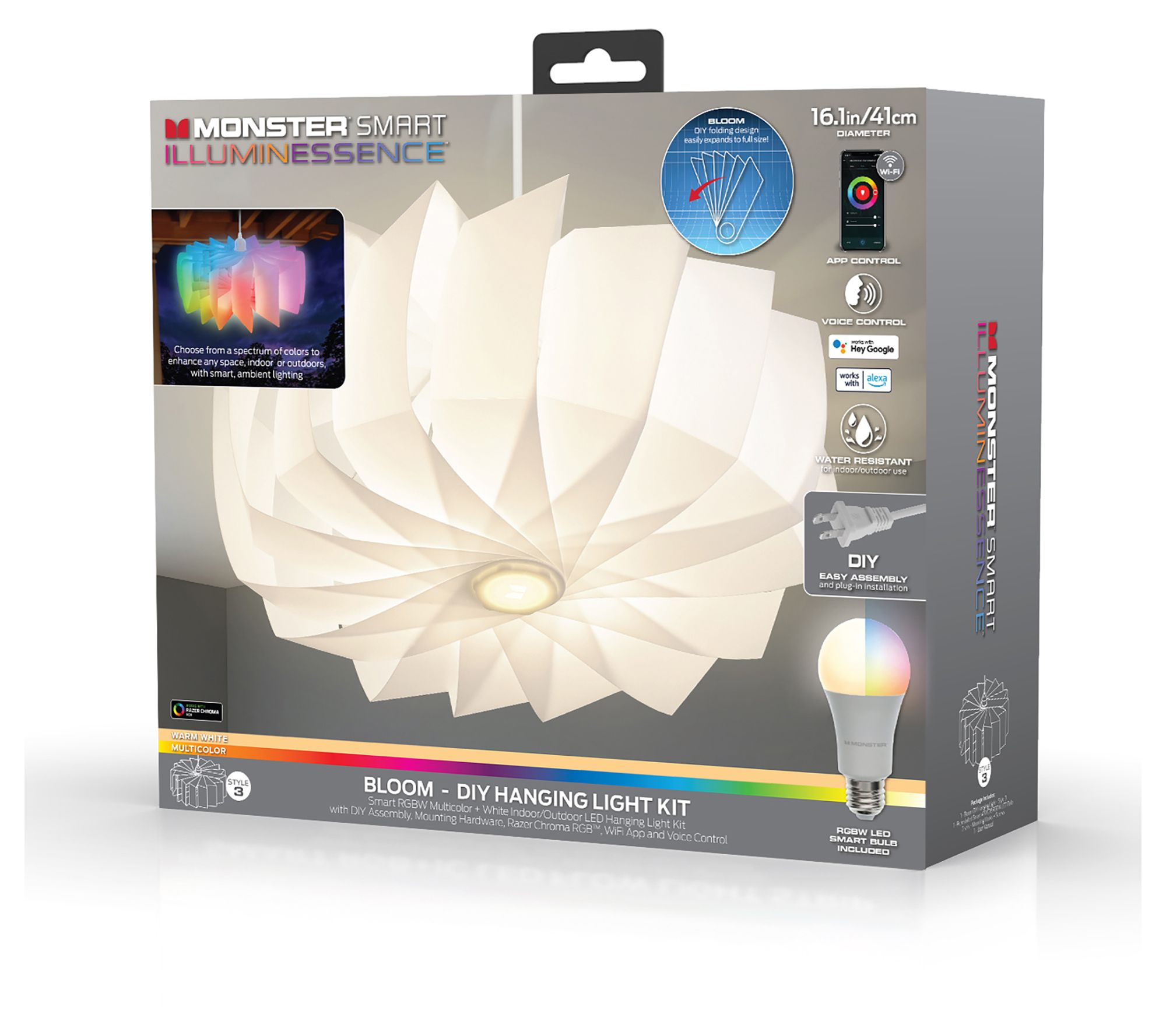 From event venues to kids' rooms, transform any space with the Monster Smart Illuminessence Bloom DIY hanging light kit. The included A19 LED smart bulb allows you to set up bright, colorful lighting experiences via the app, and make quick changes even when you're not nearby. From Monster.