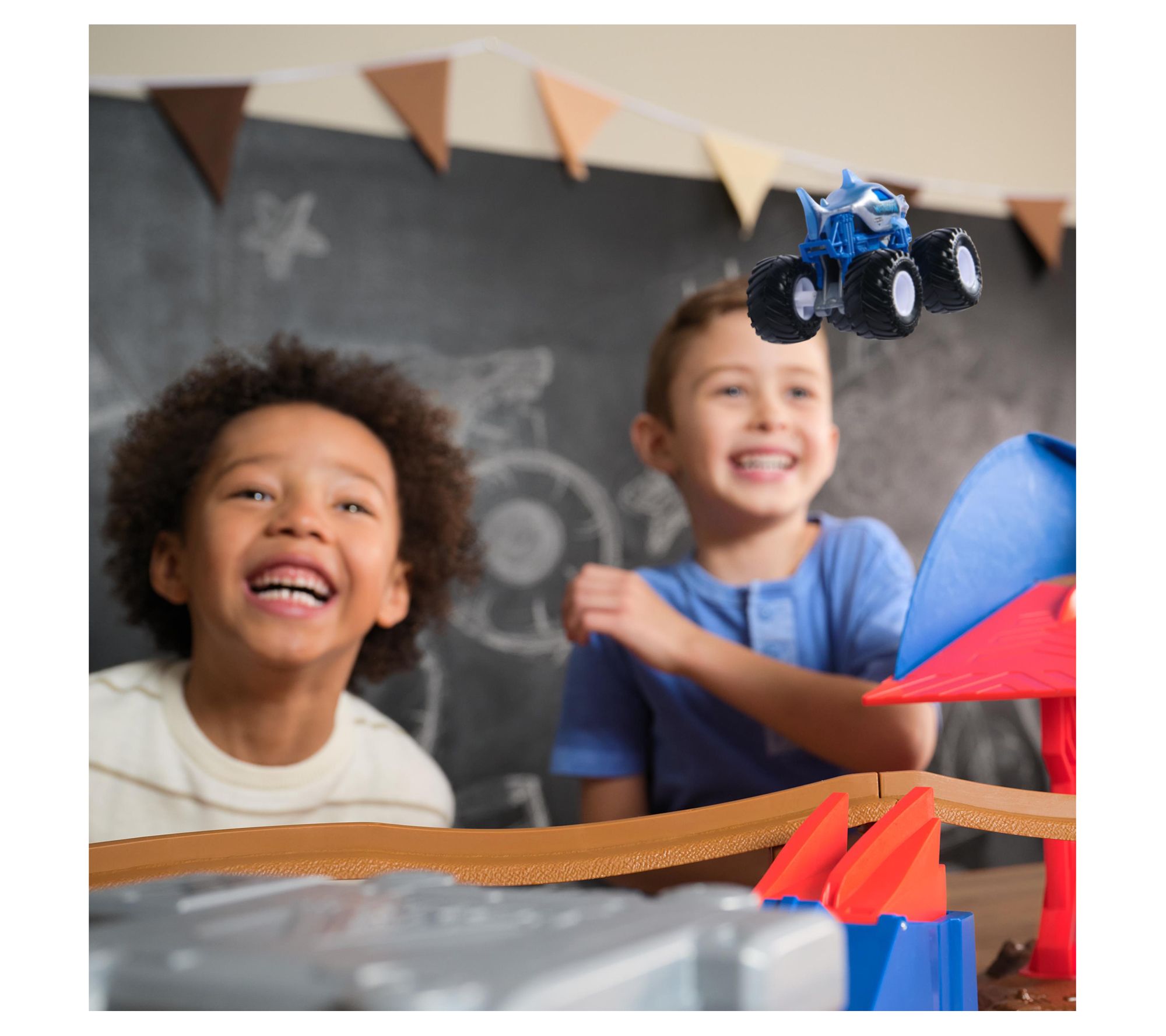 Unleash racing excitement with the Monster Jam Supercharge Speedway playset. This set includes El Toro Loco and Megalodon monster trucks, giving kids the chance to launch into high jumps, crash through obstacles, and reach the winner podium every time. It brings action-packed fun to playtime while encouraging imagination and skill.